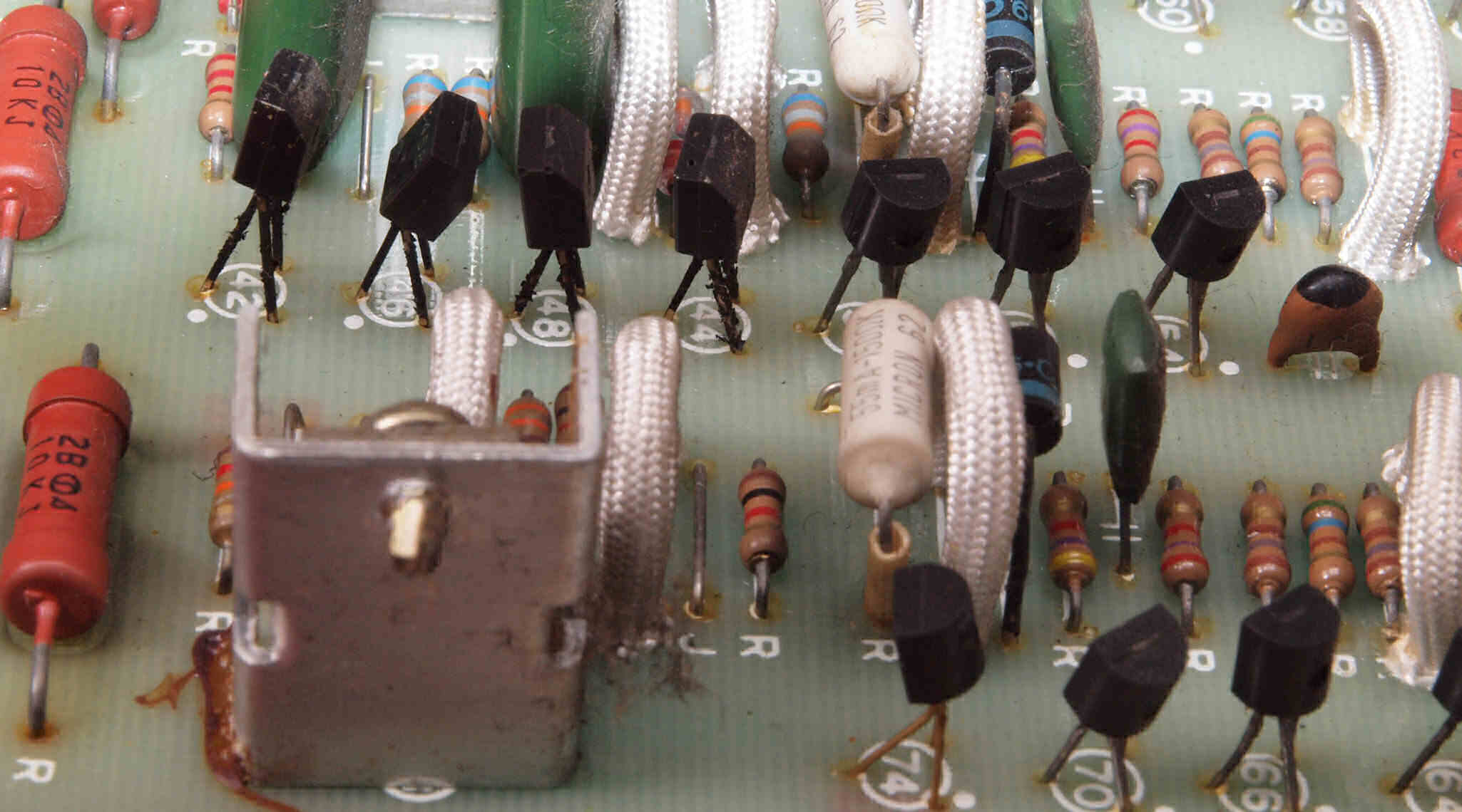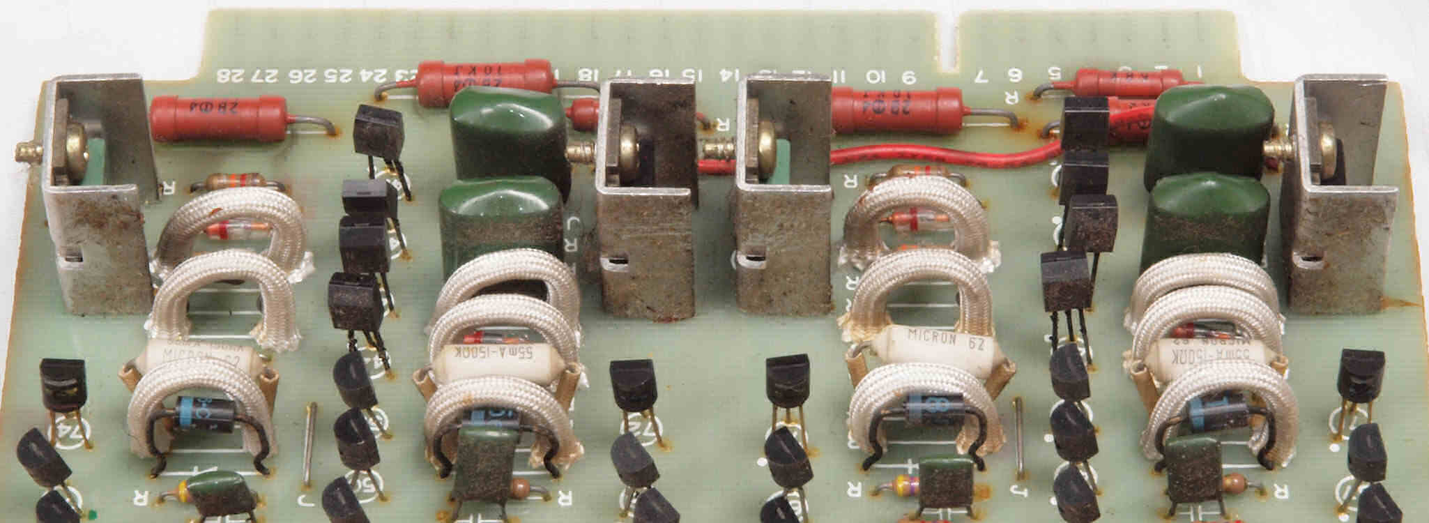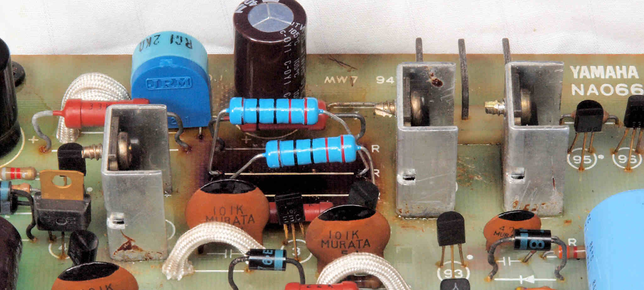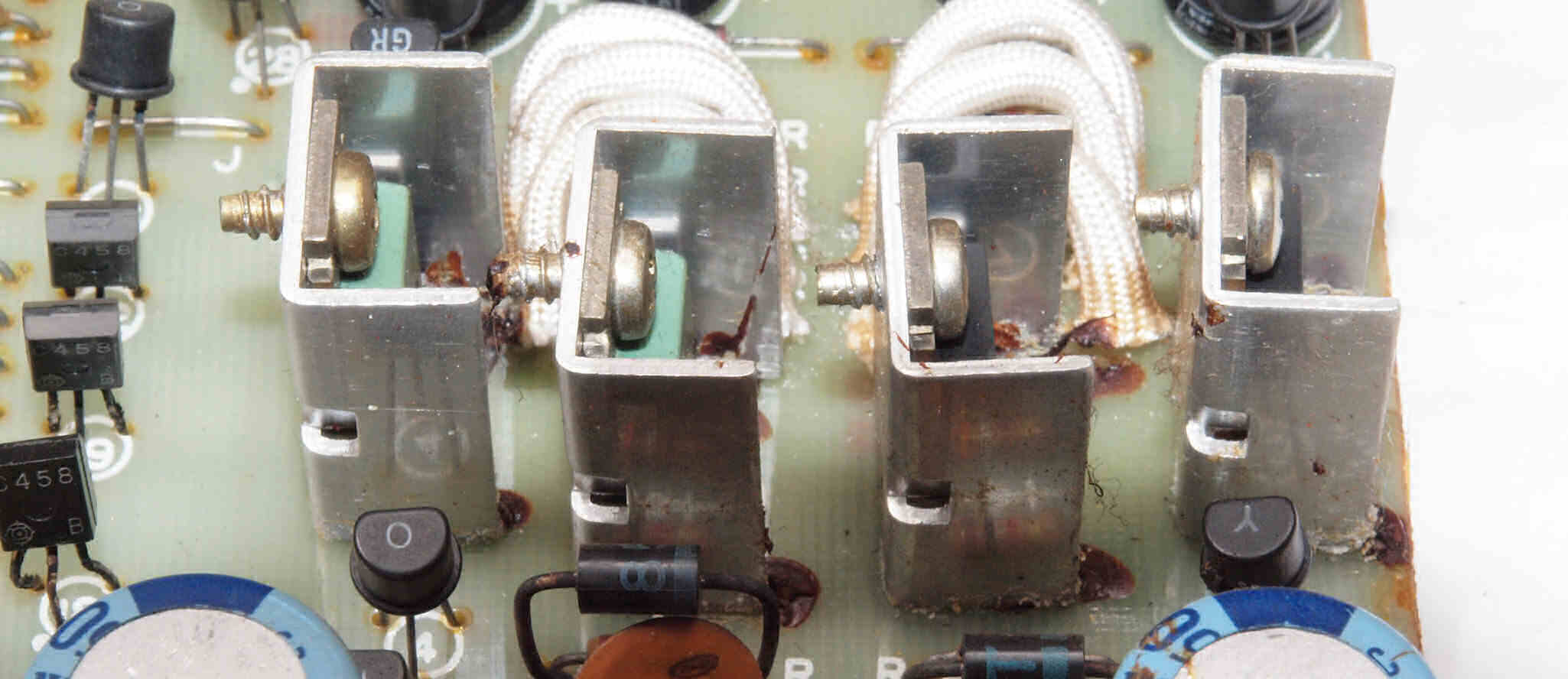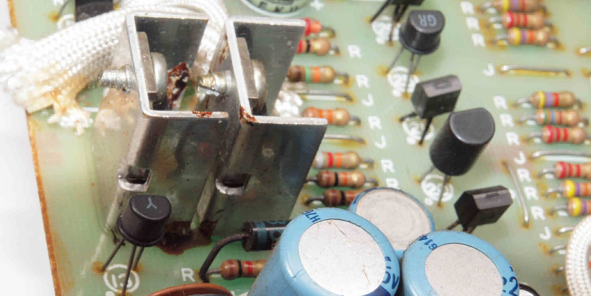 | C412. 修理中 電源1基板。電解コンデンサー固定用の接着材、当時は溶媒にトルエンが使用されており、銅を腐食する。 焼損保護を被した抵抗を外して点検。 | ||||||||||||||||||||||||||||||||||||||||||||||||||||