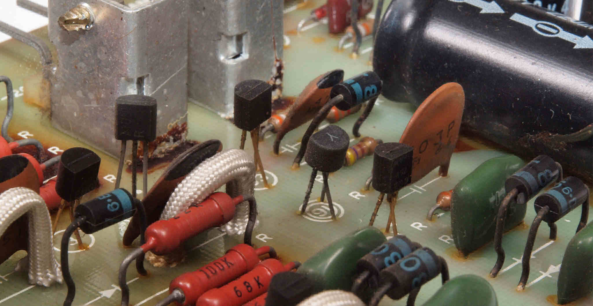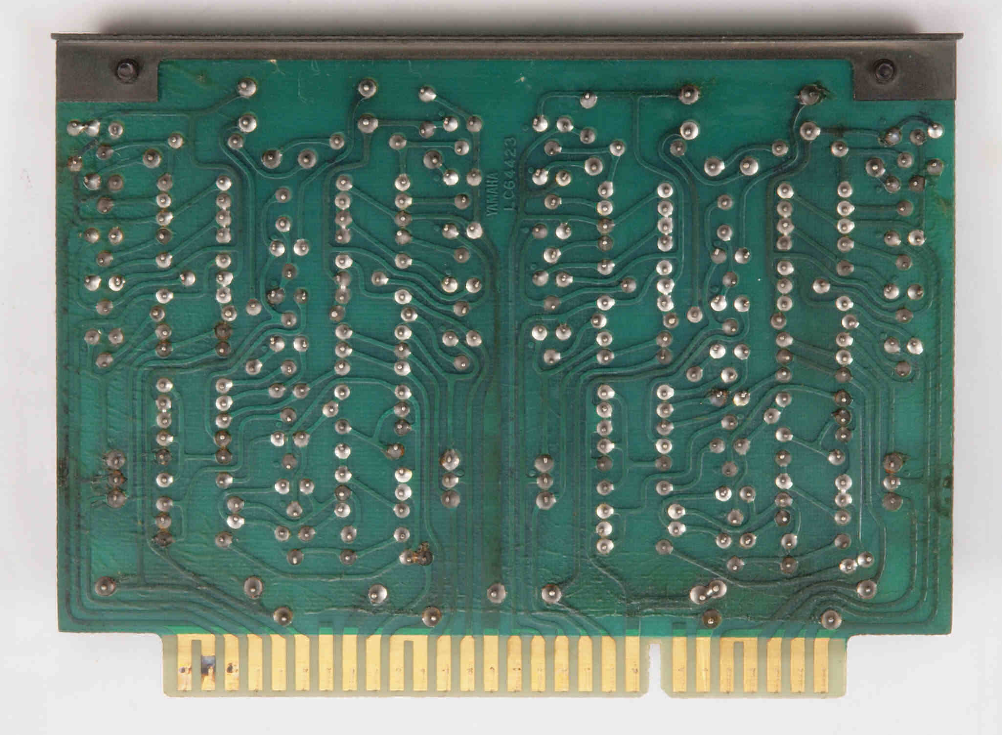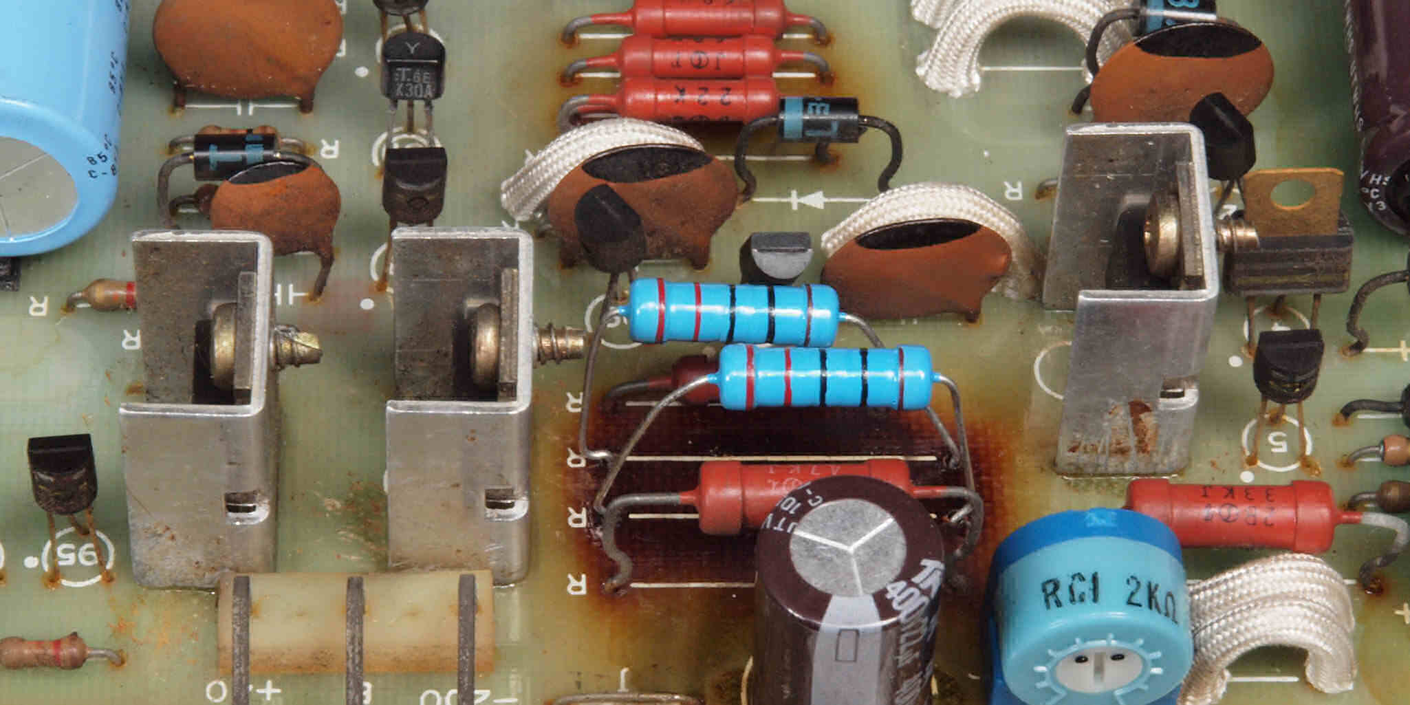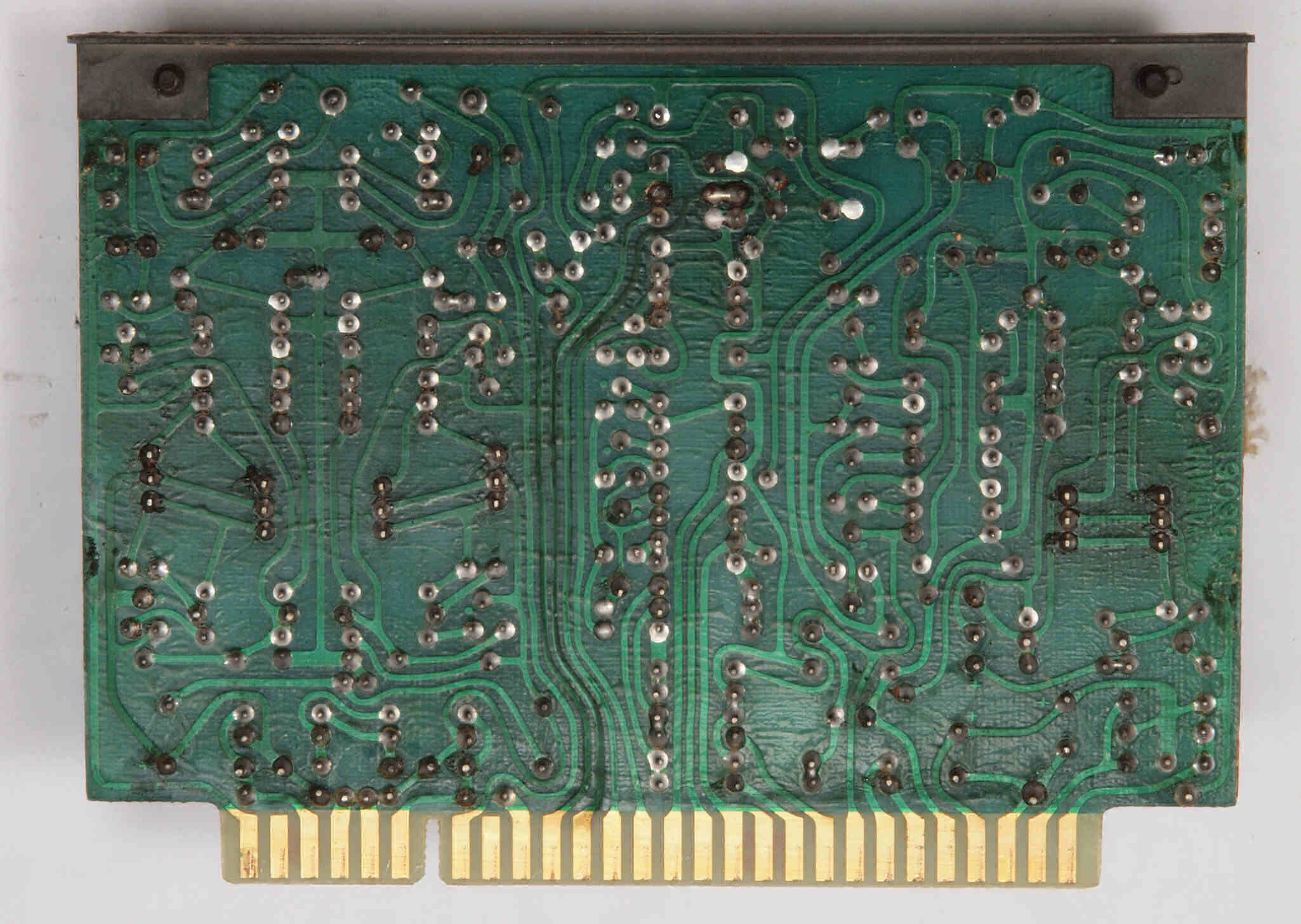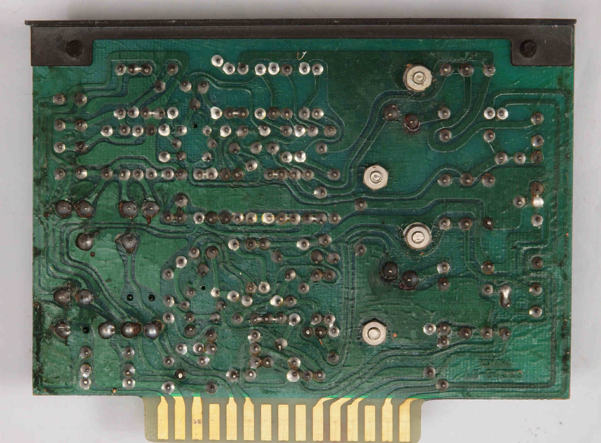 | C412. 修理中 電源1基板。電解コンデンサー固定用の接着材、当時は溶媒にトルエンが使用されており、銅を腐食する。 焼損保護を被した抵抗を外して点検。 | ||||||||||||||||||||||||||||||||||||||||||||||||||||