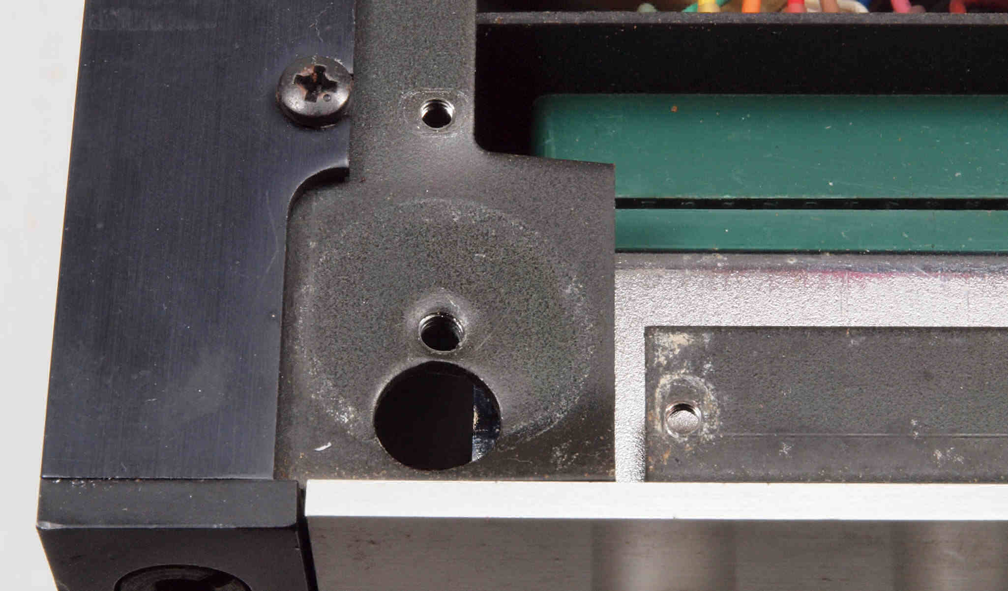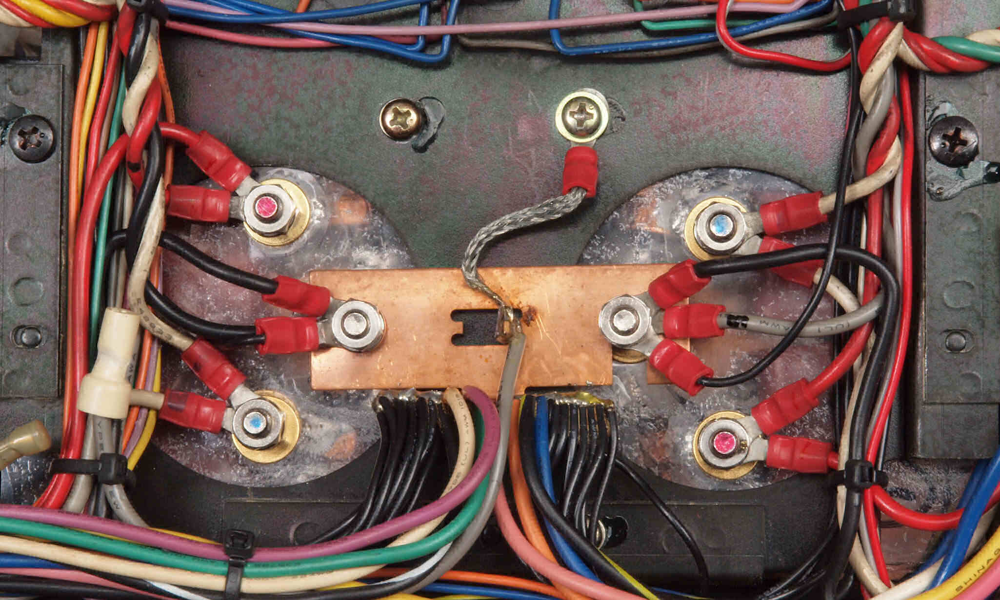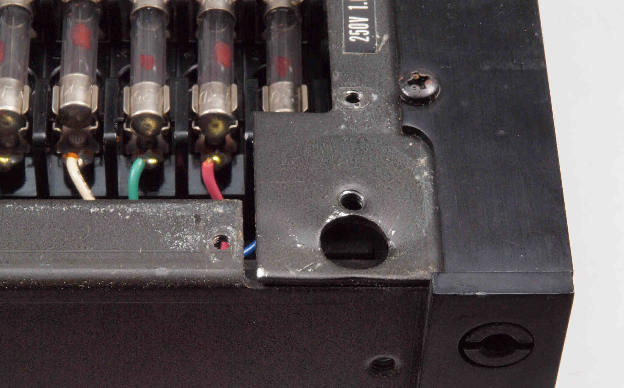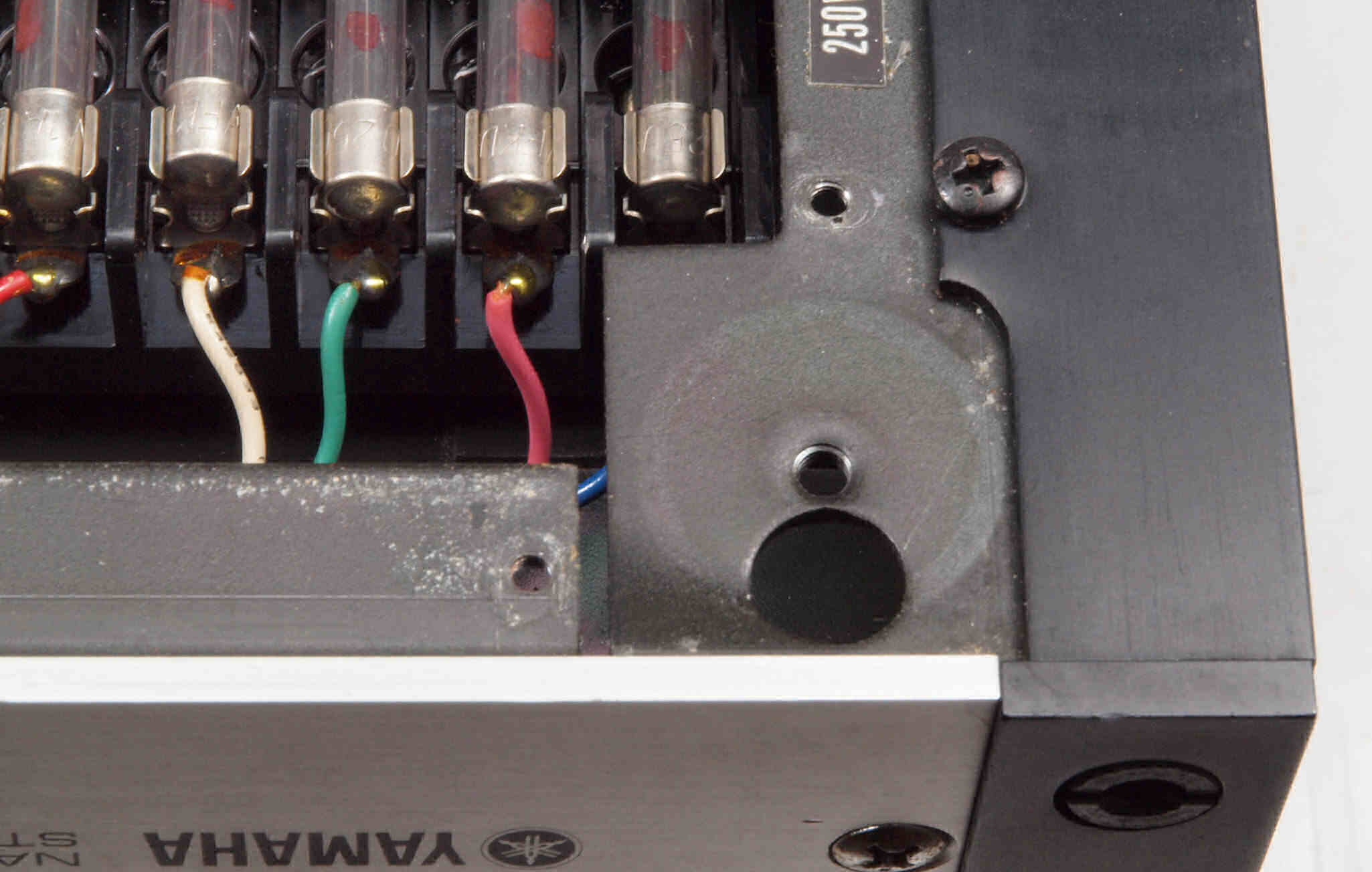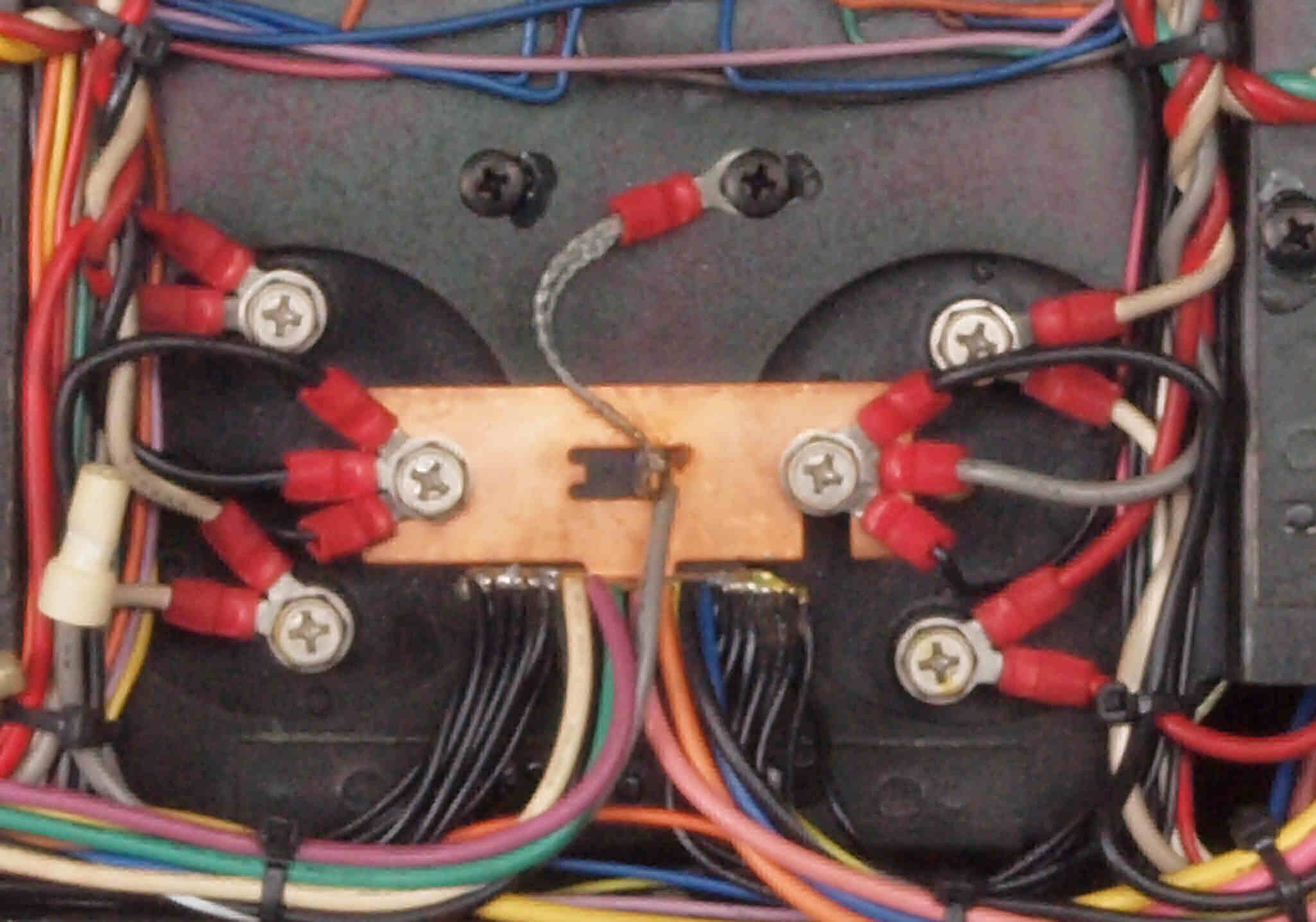 | CL4. 修理後 SIT(静電誘導型トランジスター)用ブロック電解コンデンサー下周り。アースバーからのシャーシへのラグ端子固定ビスは黒ペイントビスから導通の良いメッキへビス交換。 | ||||||||||||||||||||||||||||||||||||||||||||||||||||