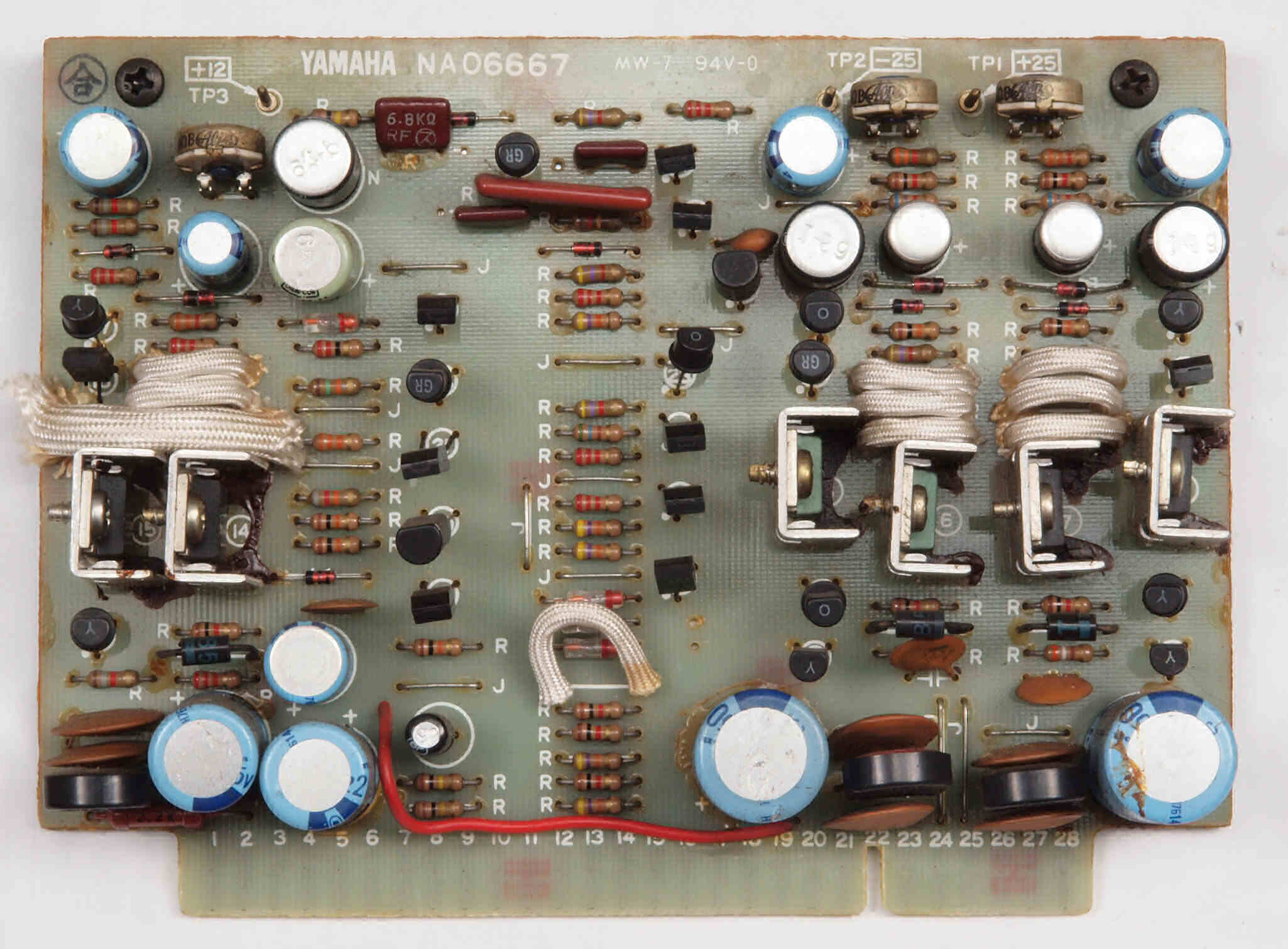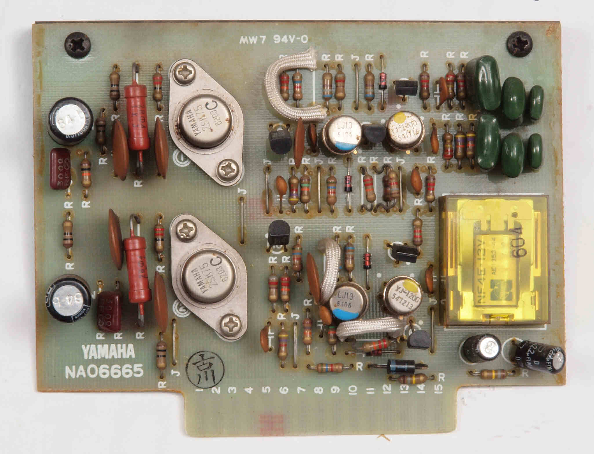 | C12. 修理後 R側ドライブ基板。フイルムコンデンサー3個、半固定VR4個、電解コンデンサー3個、TR(トランジスター)3個交換 | ||||||||||||||||||||||||||||||||||||||||||||||||||||