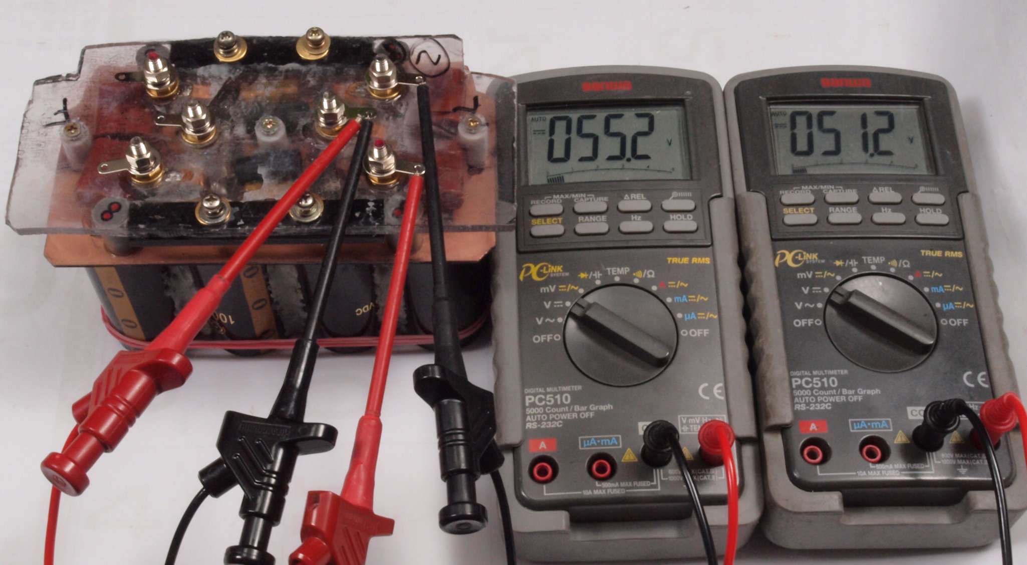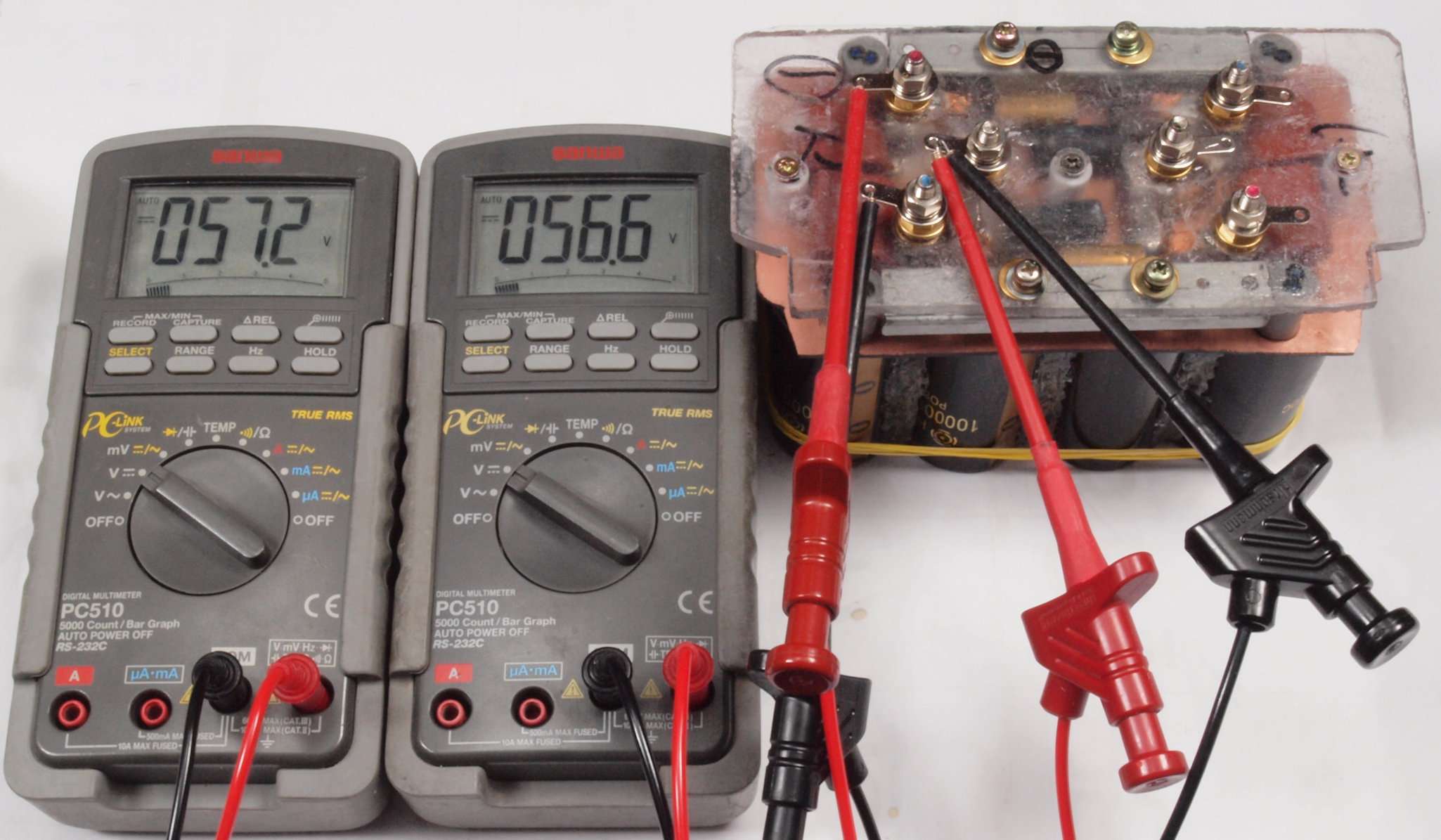 | A5C. 黄色ゴムベルト・右側用ブロック電解コンデンサー絶縁測定、 24時間後+側、−側の各電圧測定する。 +側電圧=57.2V、−側電圧=56.6V。 |