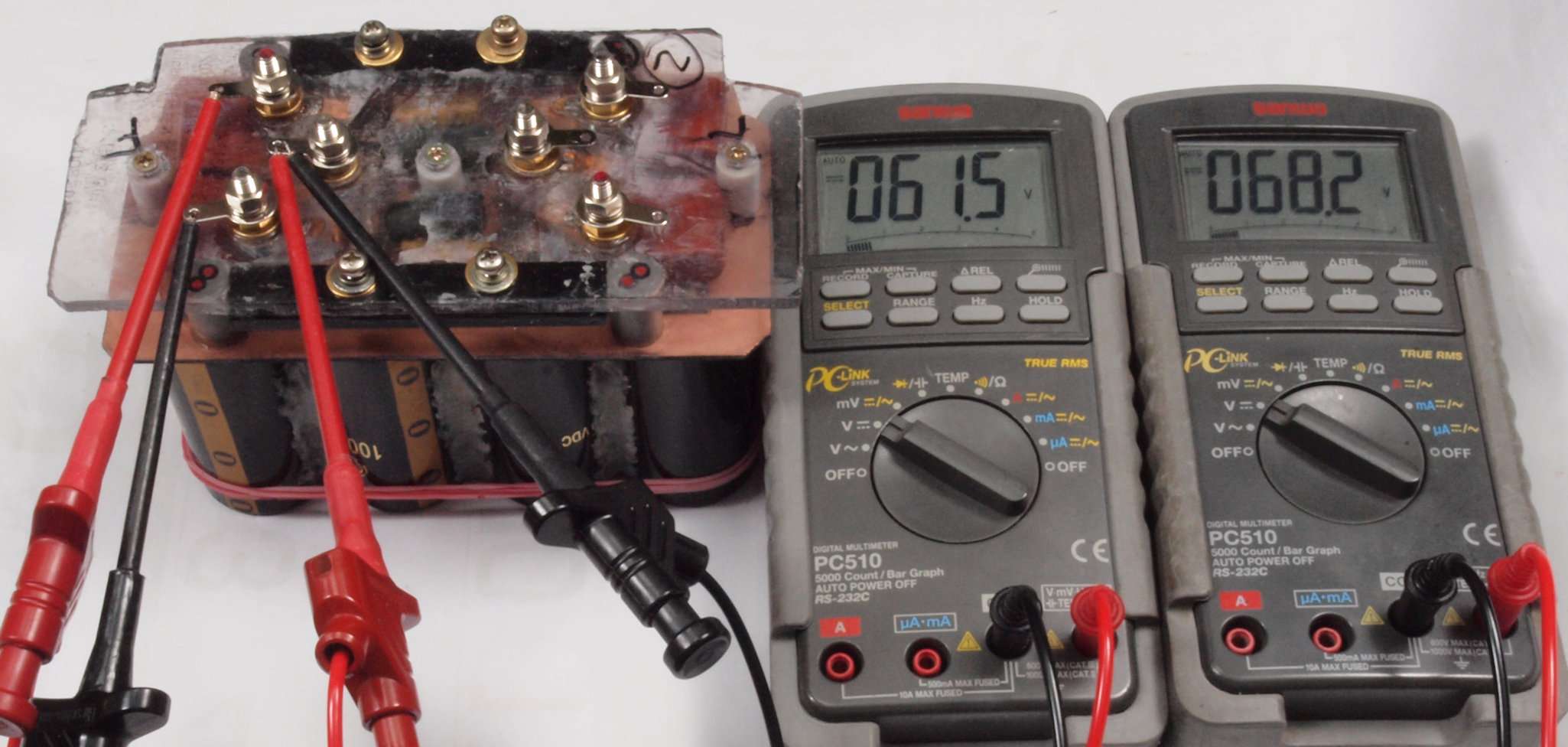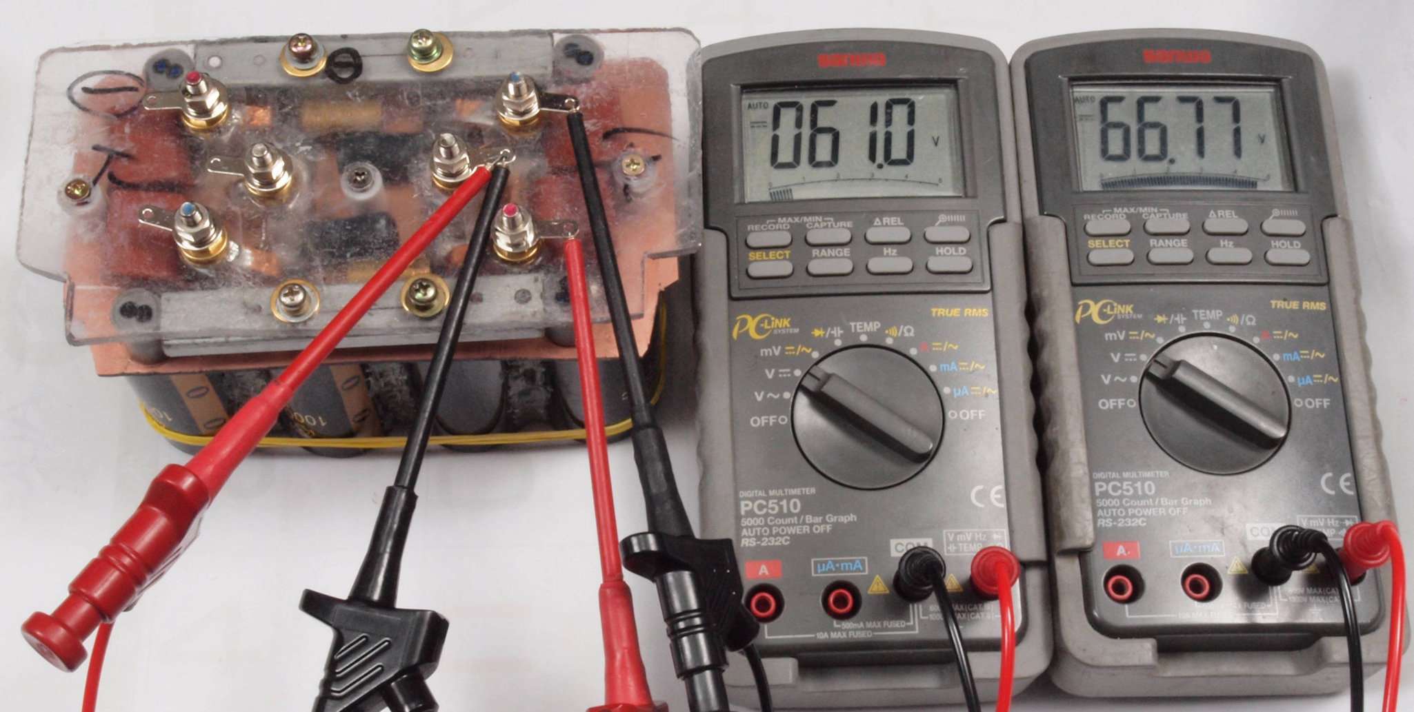 | A5E. 黄色ゴムベルト・左側用ブロック電解コンデンサー絶縁測定、 24時間後+側、−側の各電圧測定する。 +側電圧=61.0V、−側電圧=66.77V。 |