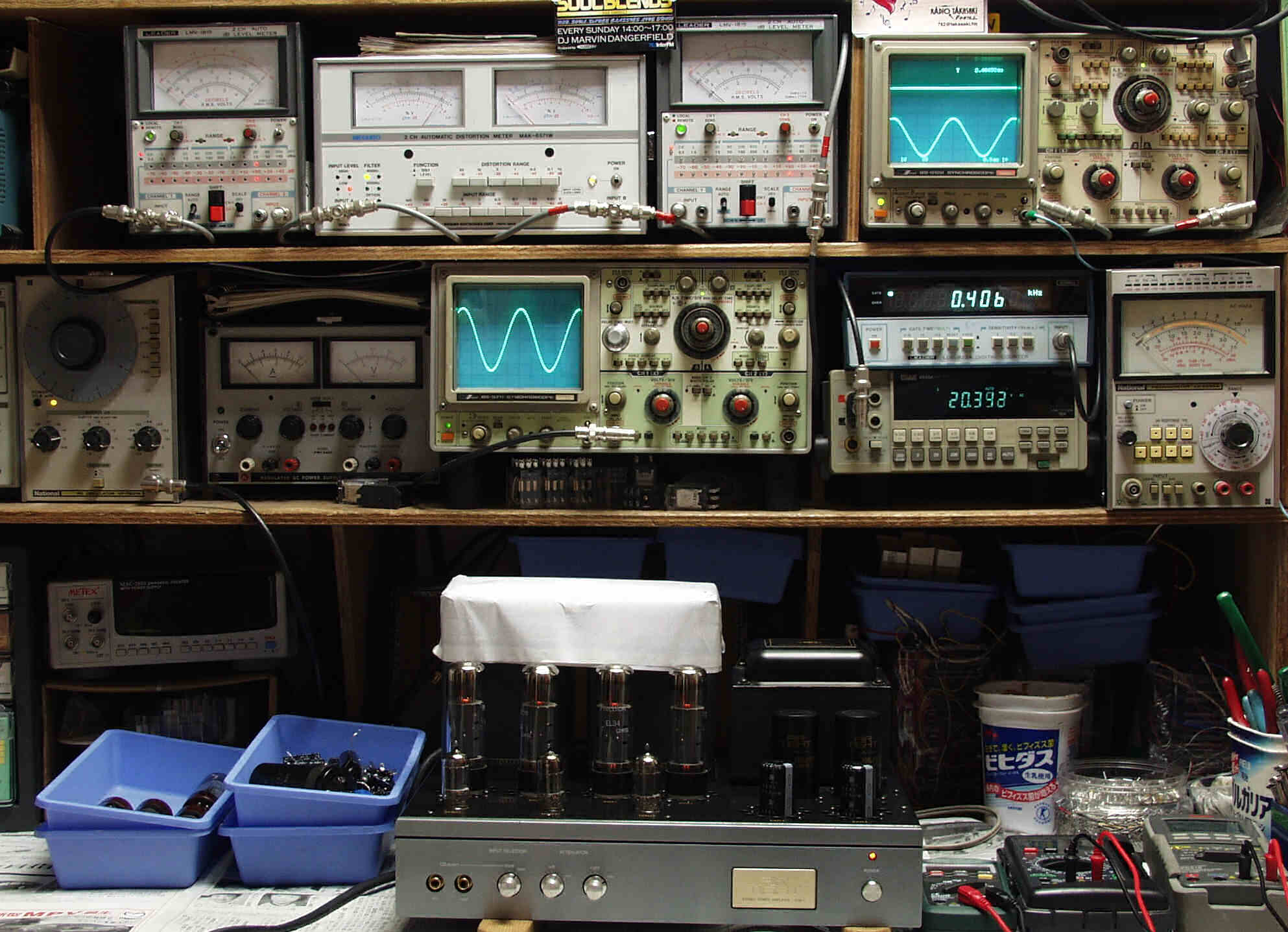 上中左=SP出力の歪み率測定 左メ−タ−=L出力、右メ−タ−=R出力