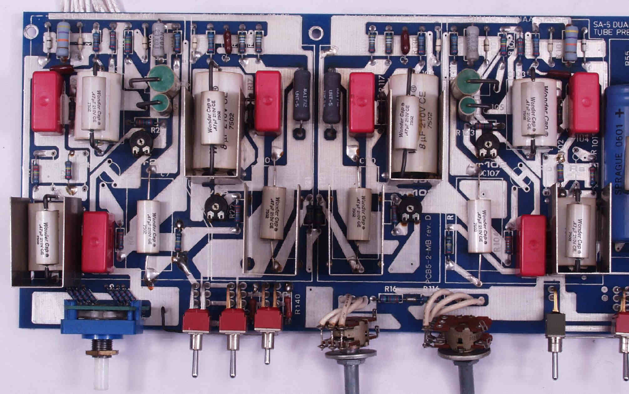 C13. 修理後 AMP基板 半固定VR4個、フィルムコンデンサー22個交換