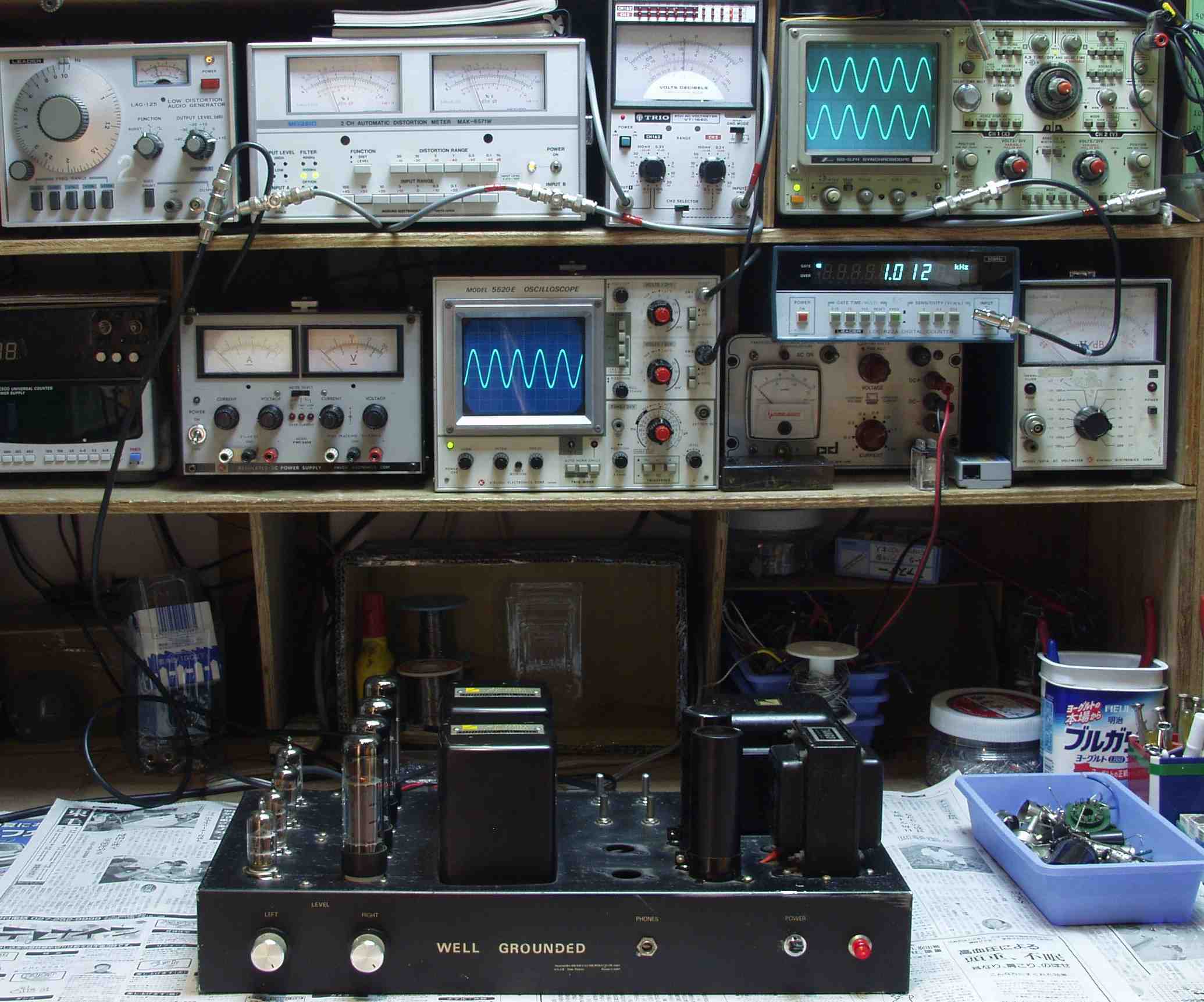 上左オーデオ発振器より400HZ・1KHZの信号を出す(歪み率=約0.003%)
