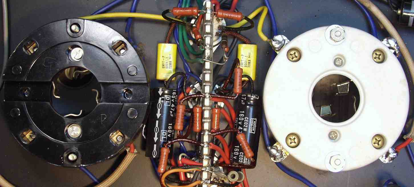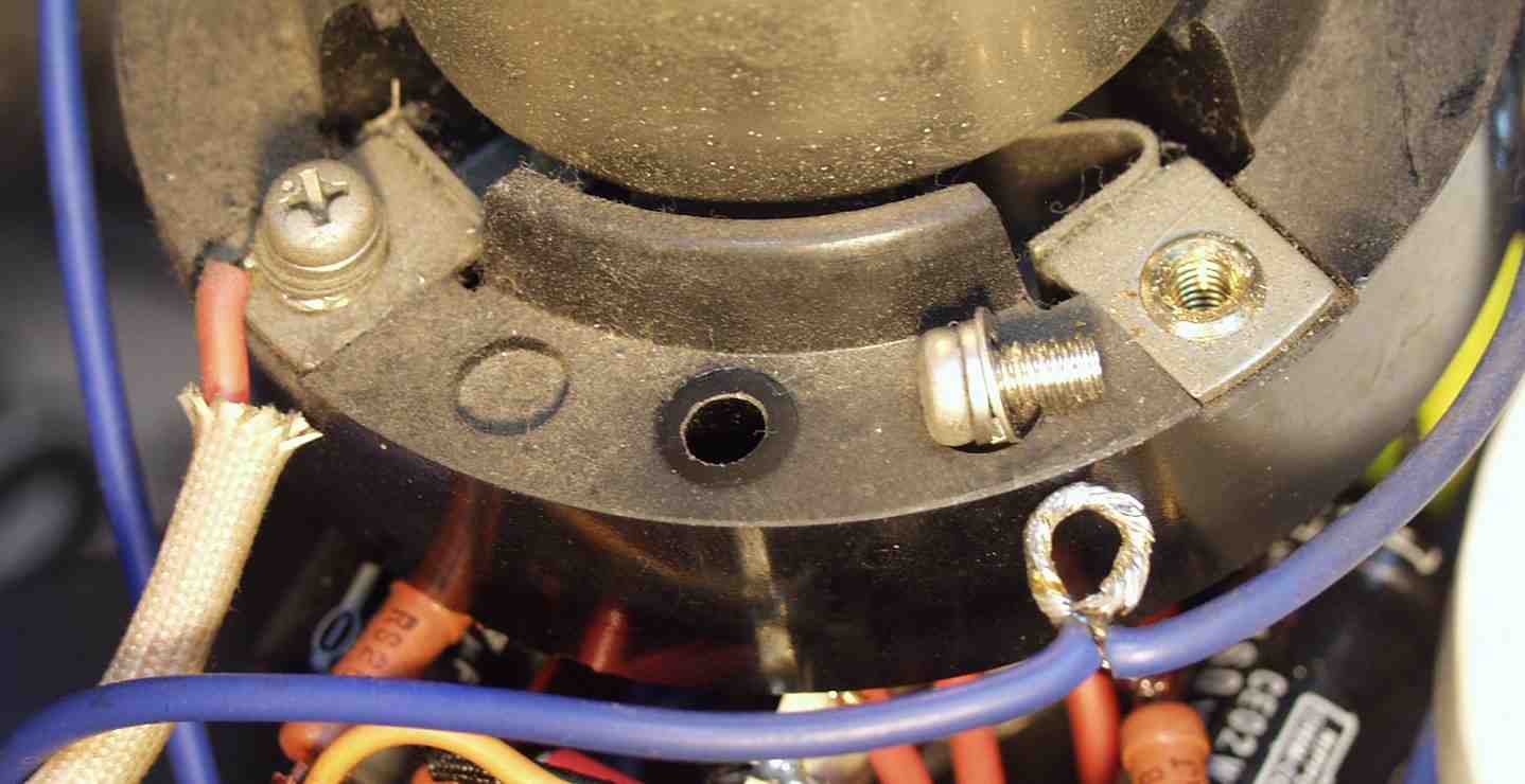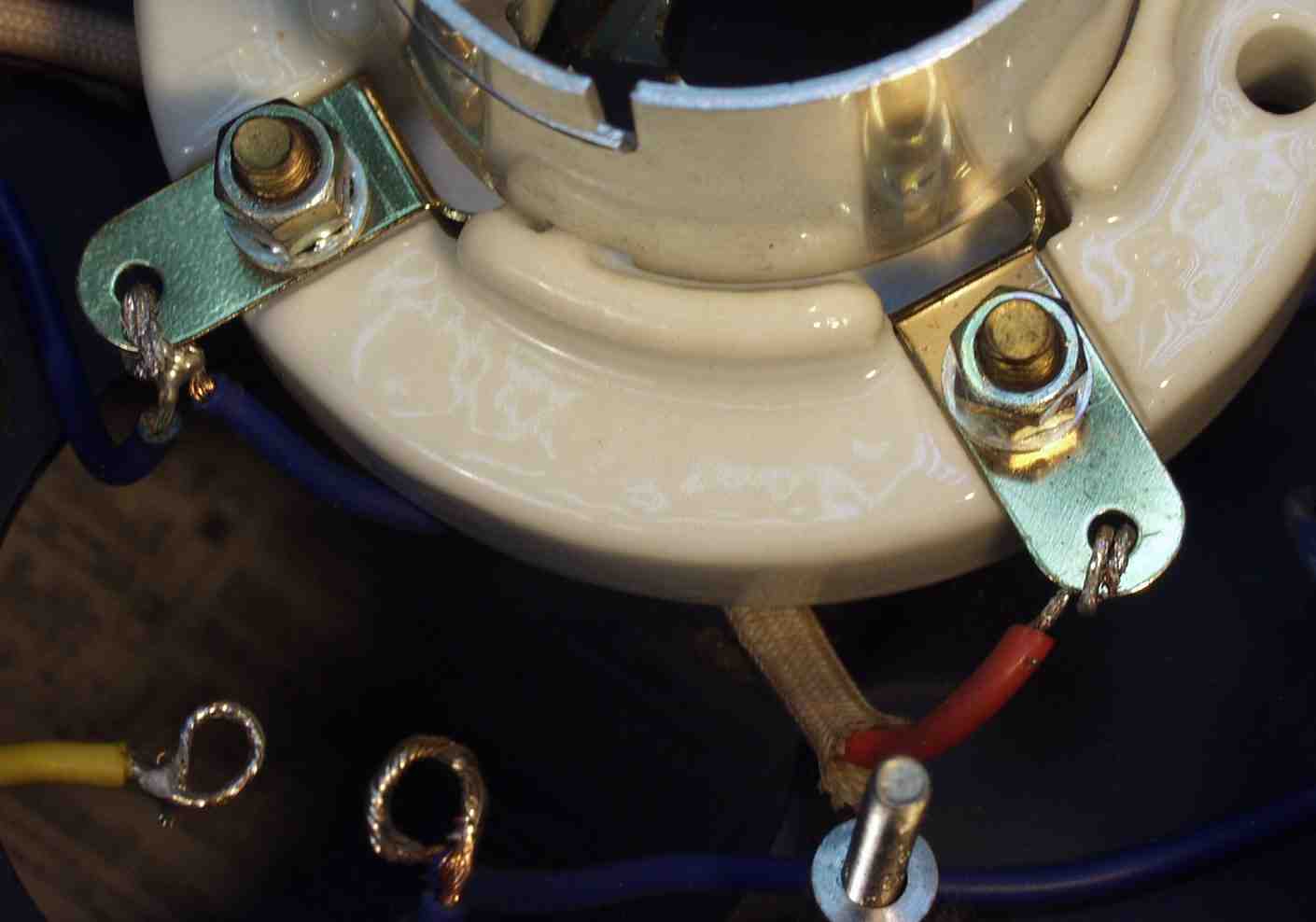 | CA.211ソケット修理前 配線は半田あげしてビス止め!、これでは熱で緩む 自作品では、完成すれば終わり、しかし製造メ−カ−はそれからが本当の仕事です 安全、経年変化、複合要素による発振等々の配慮 |