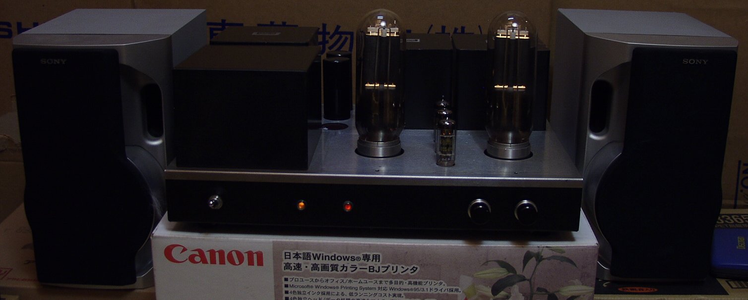 | E4.完成 24時間エージング 大型三極出力独特の音がする、「出力10V=12.5W 歪み率3%」の測定結果など、吹っ飛んでしまう! これが、真空管の魅力です。 聴いたことの無い人解るかな? 解からないだろうな! |