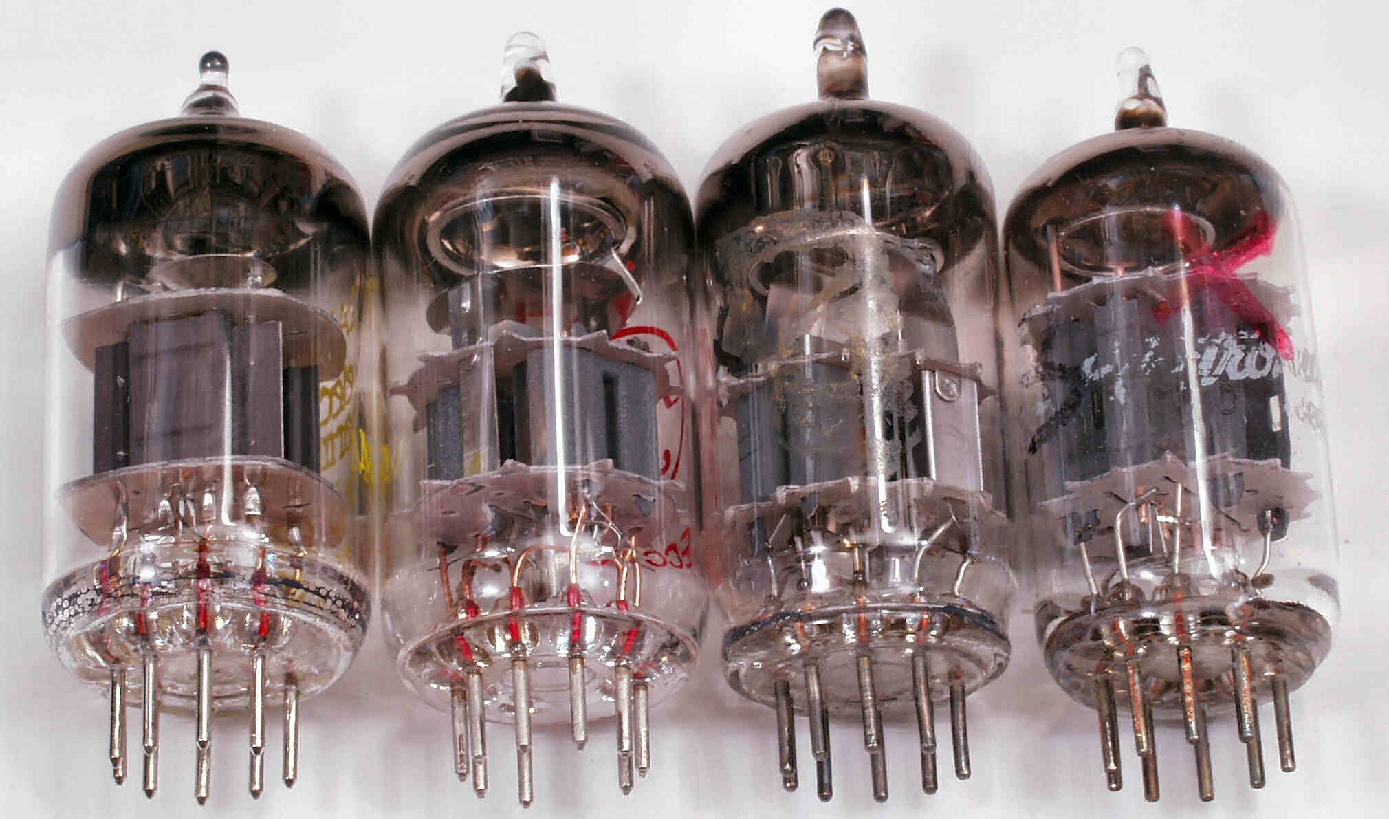 | A−6B. 修理前点検中 MT真空管は足の付け根(袴の部分)を見ると、新旧が歴然と解る 左=少し使用、中左=未使用新品、他は中古品 |