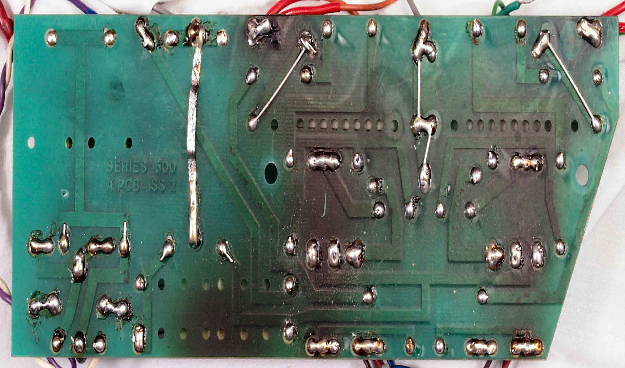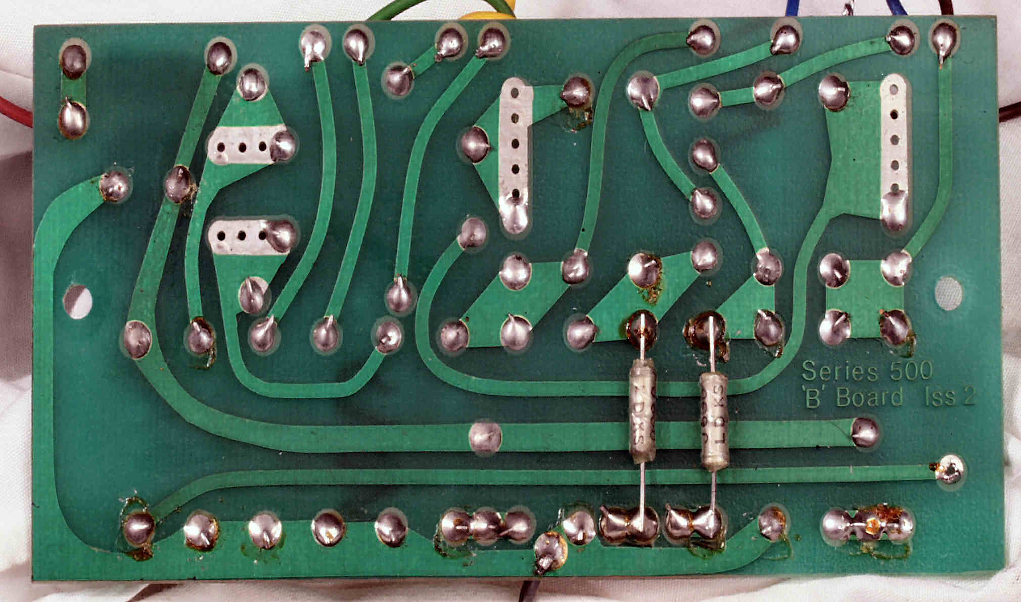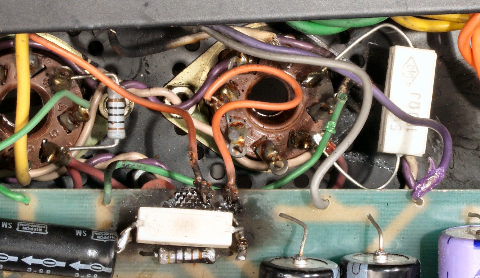 | A−5B. 修理前点検中. 基板したの焼けて交換した抵抗。RLで異なる。配線も「半田コテ」で傷つけている。 プロの仕事とは、到底思えない? |