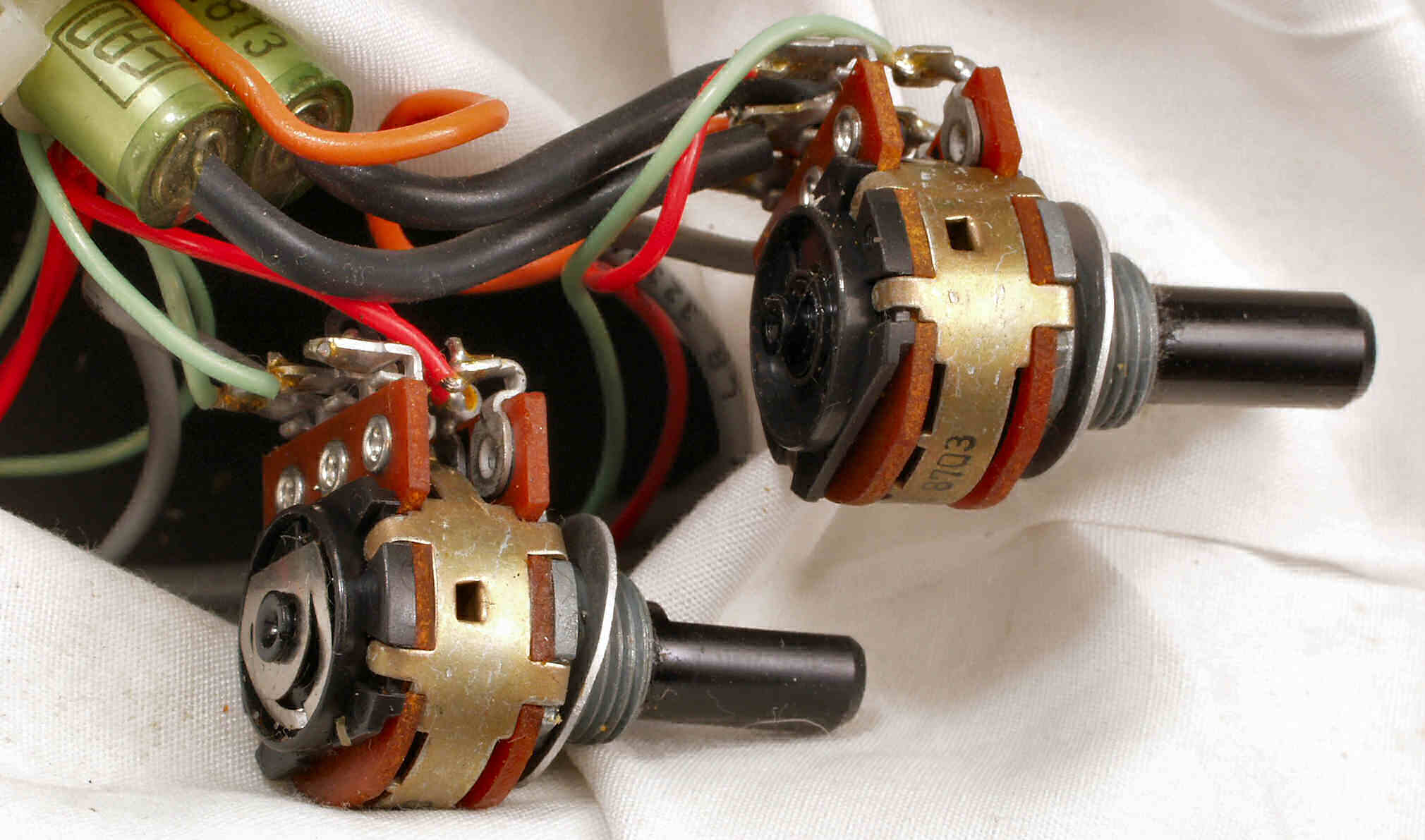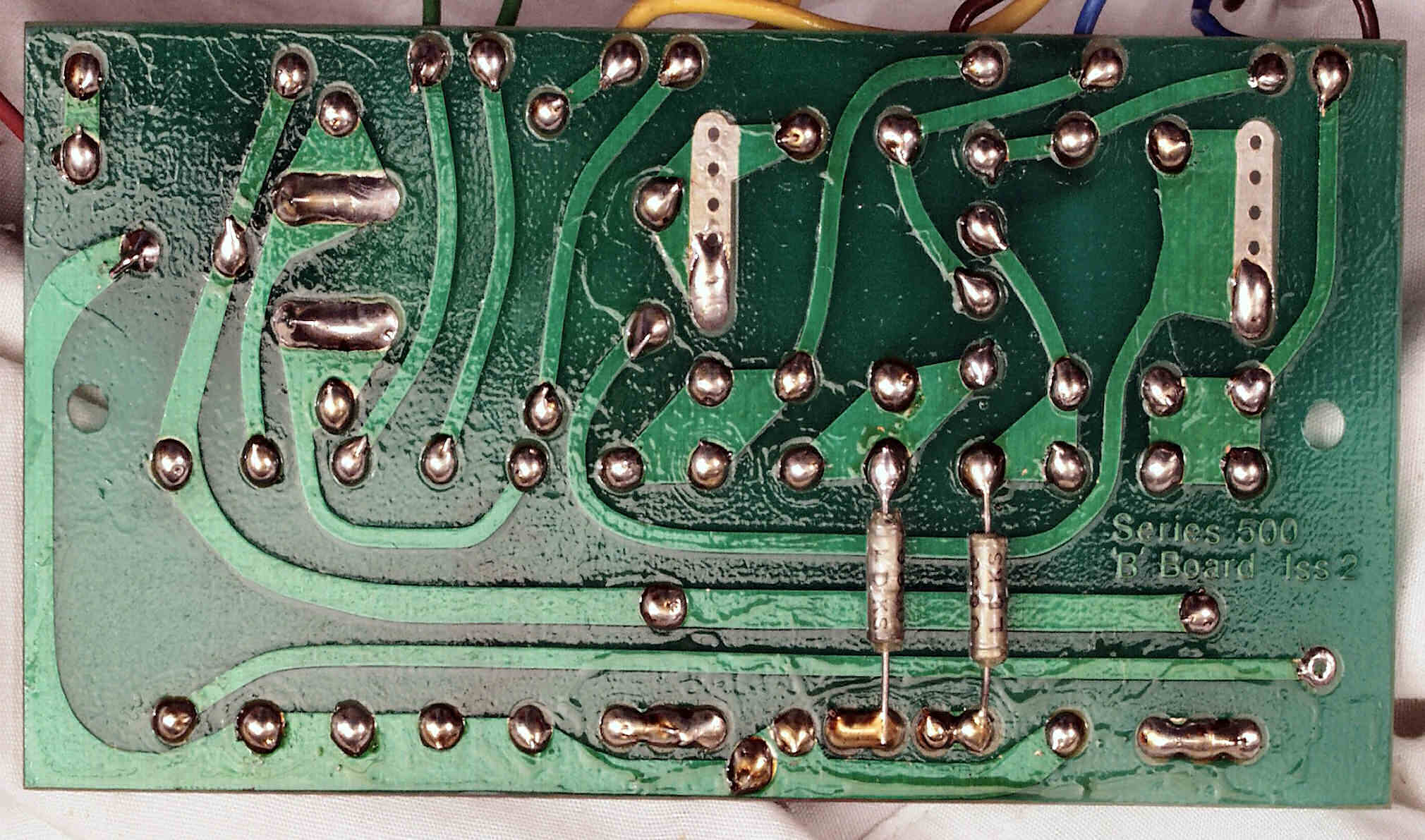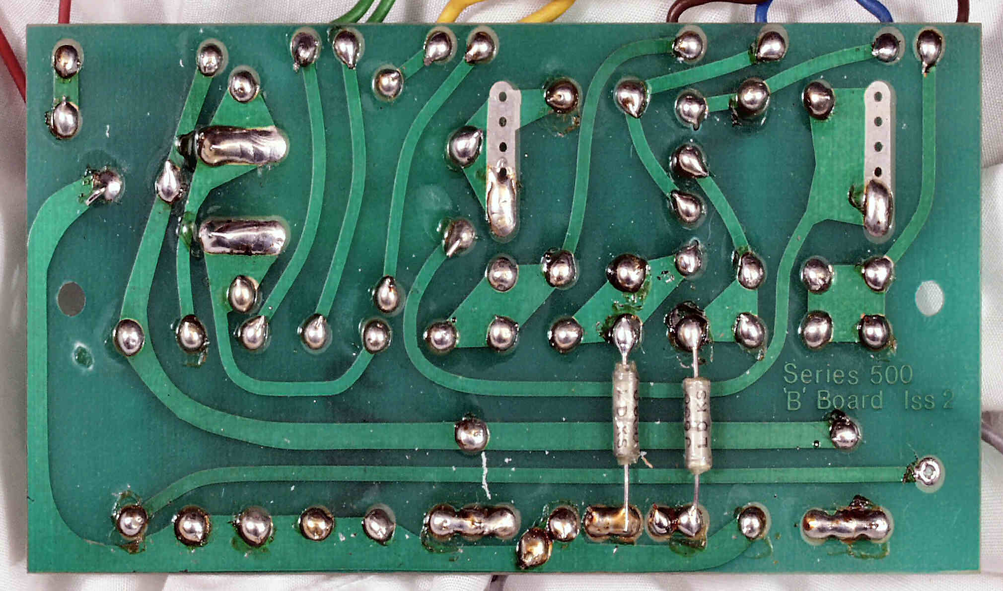 | A−5B. 修理前点検中. 基板したの焼けて交換した抵抗。RLで異なる。配線も「半田コテ」で傷つけている。 プロの仕事とは、到底思えない? |