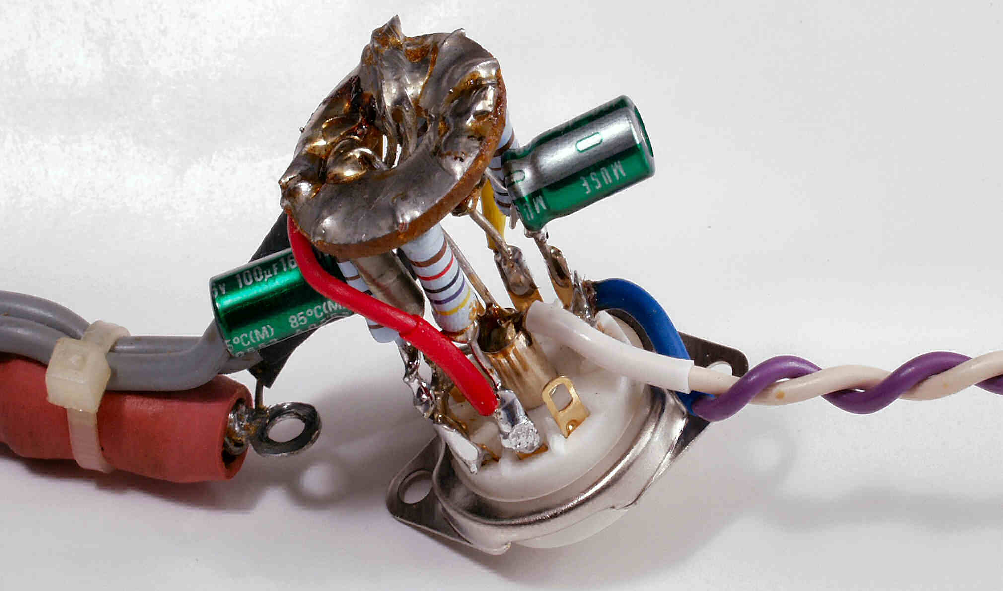 | A−6A. 修理前点検中 磨かれたMT真空管の足 |