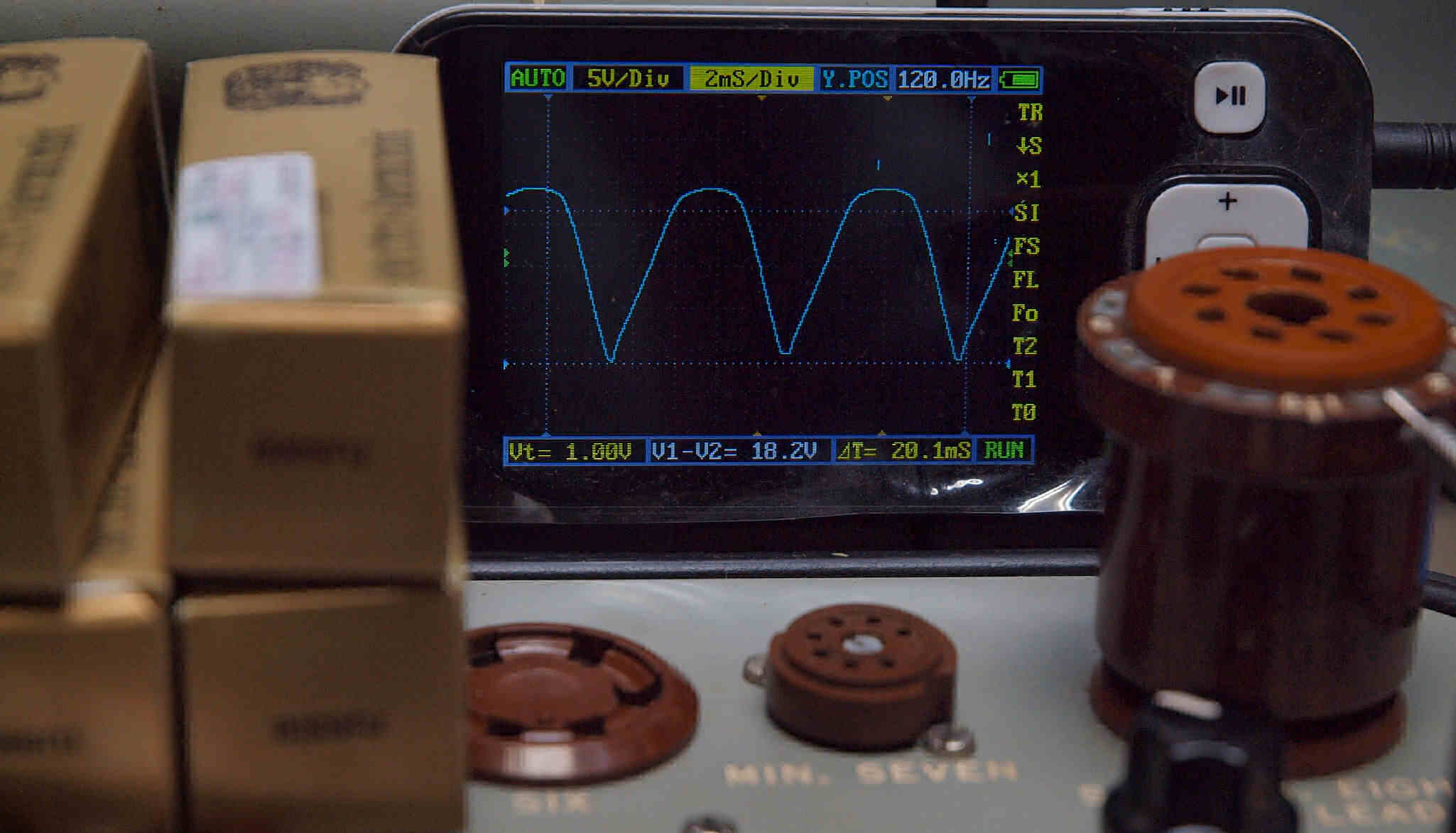 | V2. 購入真空管12AU7(ECC82)。 真空管ハンドブック(規格表)の、12AU7(ECC82)相互コンダクタンス=2200μmho「Ep=250V、Ip=10.5mA、Eg1=−8.5V」。 1960/1962/1964/1966ナショナル真空管ハンドブック、1995オーディオ用真空管マニアル、60/62/69東芝電子管ハンドブック、1962日立電子管ハンドブック、1965/1971全日本真空管マニュアル、RC15/19/26/27/28/29/30 Receiving Tube Manual、1966/実用真空管ハンドブック、1995世界の真空管カタログより。 |