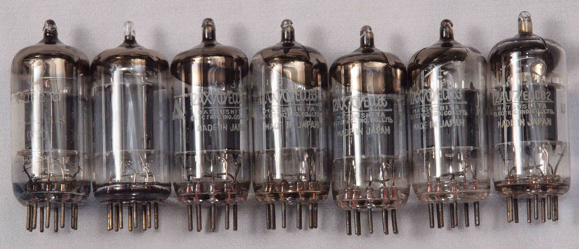 | 付属真空管「12AX7(ECC83)」。 左から1本目.2本目...5本目.6本目、12AU7。 |