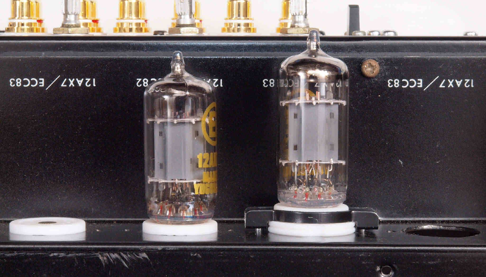 A54. 点検中 他の真空管と足の比較。 右側は「Ei」の12AX7が太い。