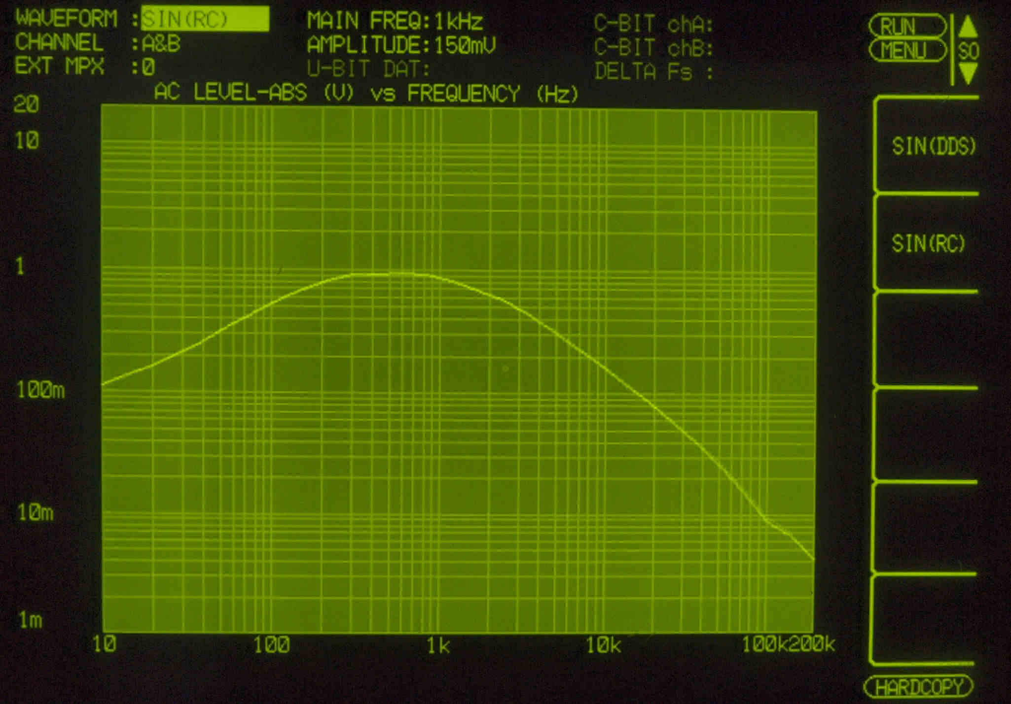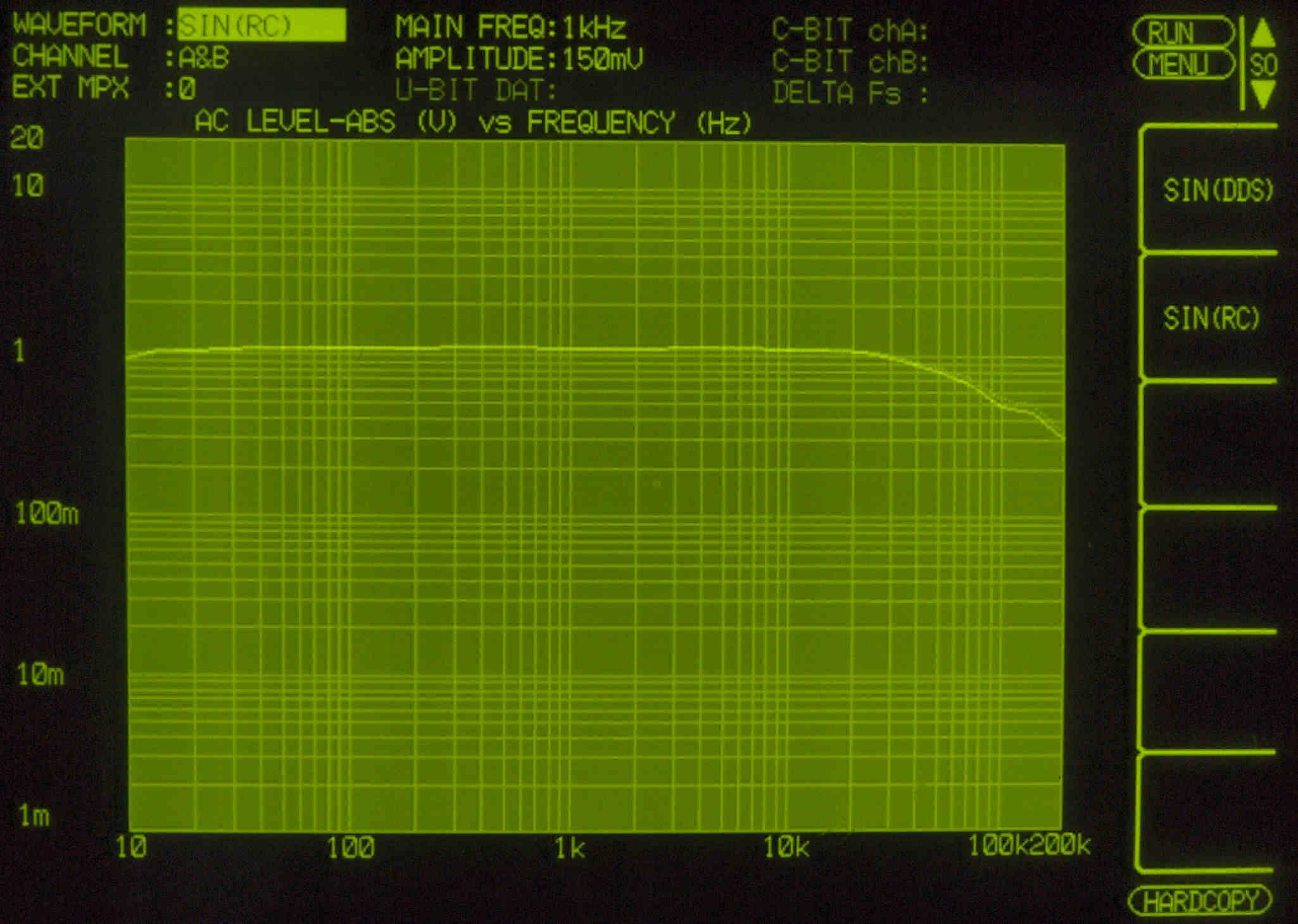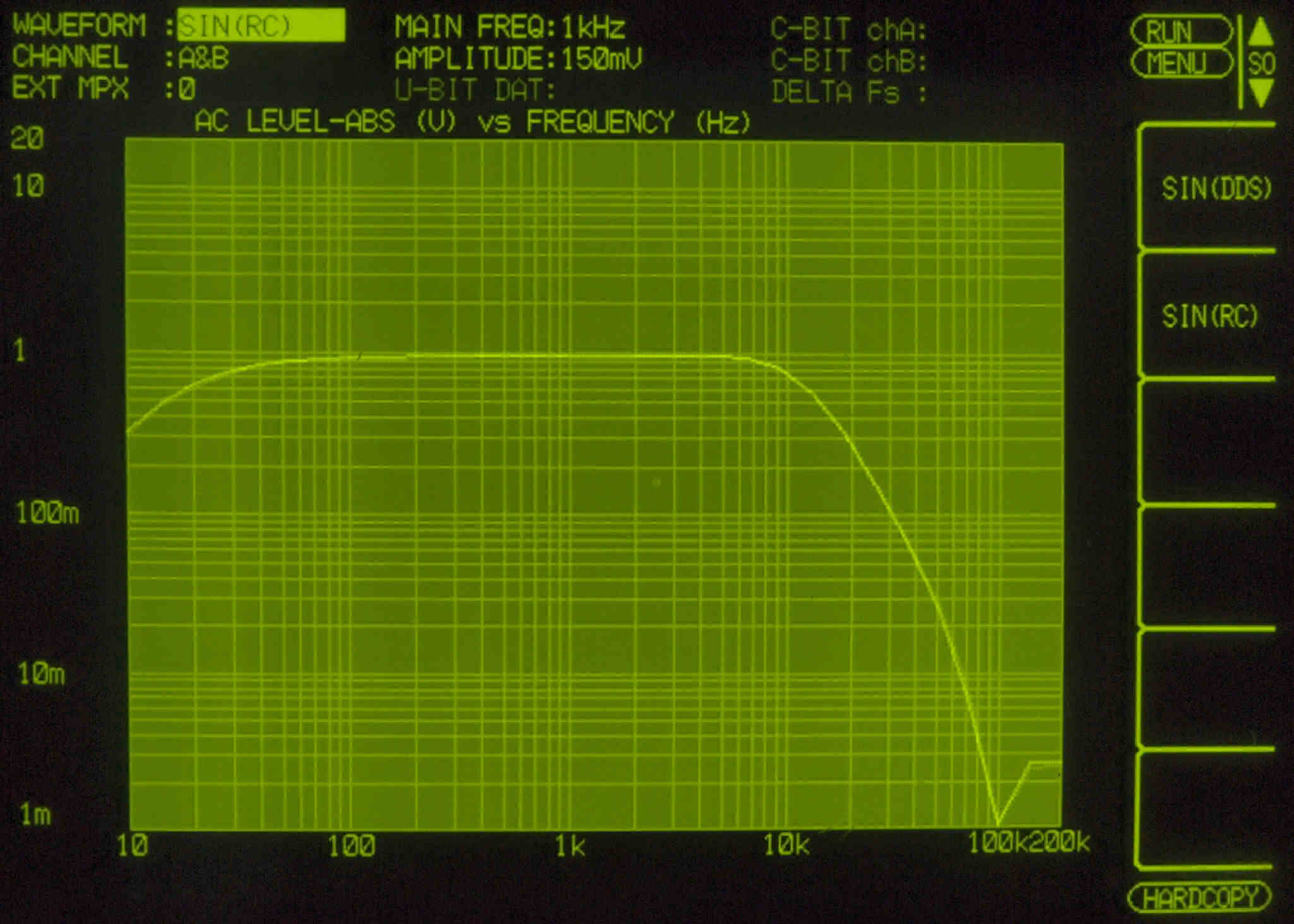 AUX入力端子へ150mV一定入力、VRはmax、左出力=薄(細い)色 右出力=濃い(太い)色。