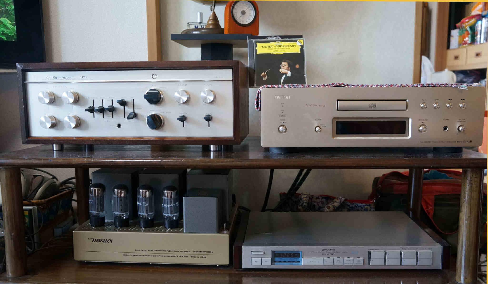 下段左端 オーディオ発振器 VP−7201A より50Hz〜100kHzの信号を出し(歪み率=約0.003%)、ATT+分配器を通し、AMPに入力。
