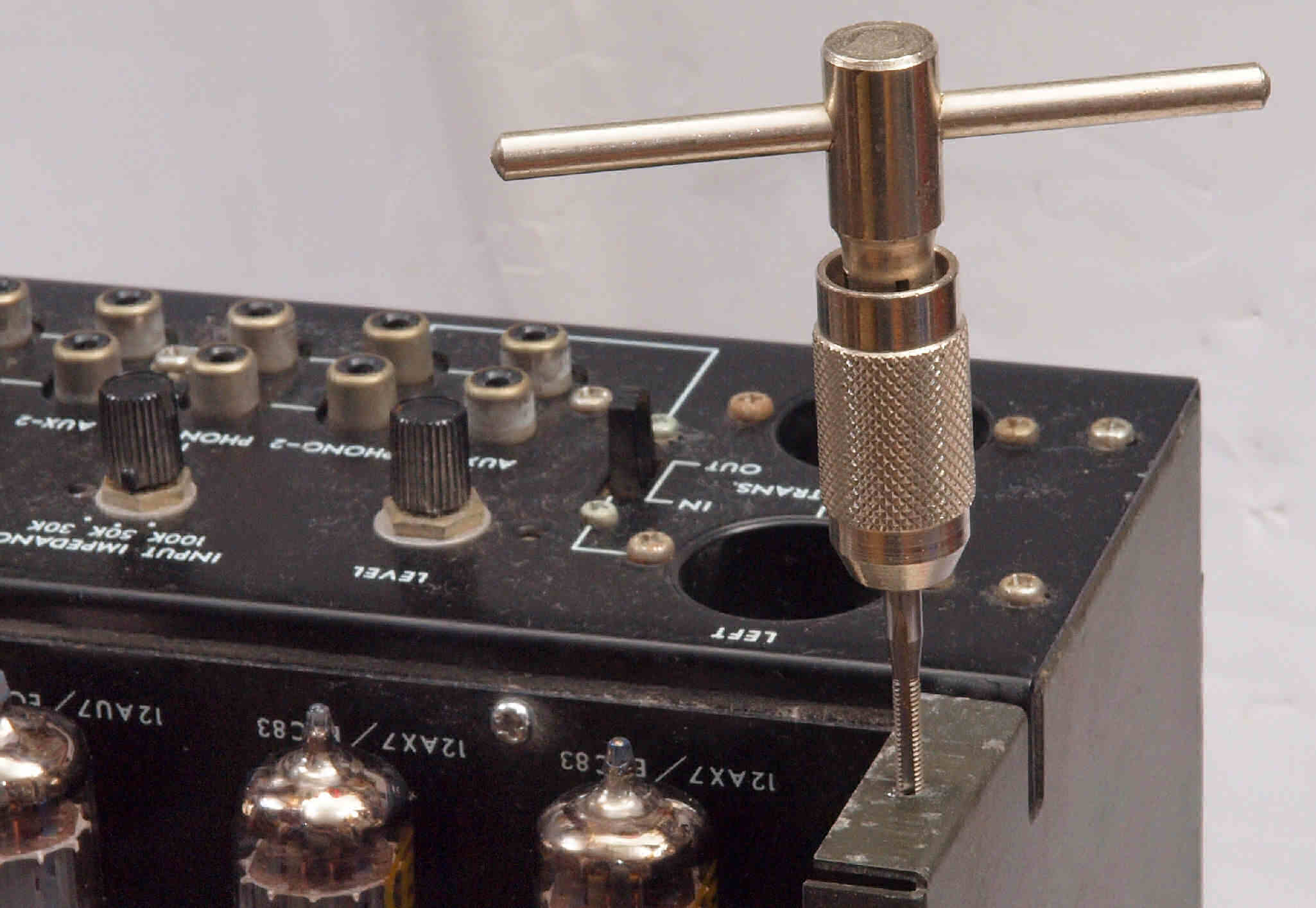 A262. 点検中 木箱から取出、上蓋・真空管シールドを外し、上から見る。 ネジ山が潰れているのでタップ立。