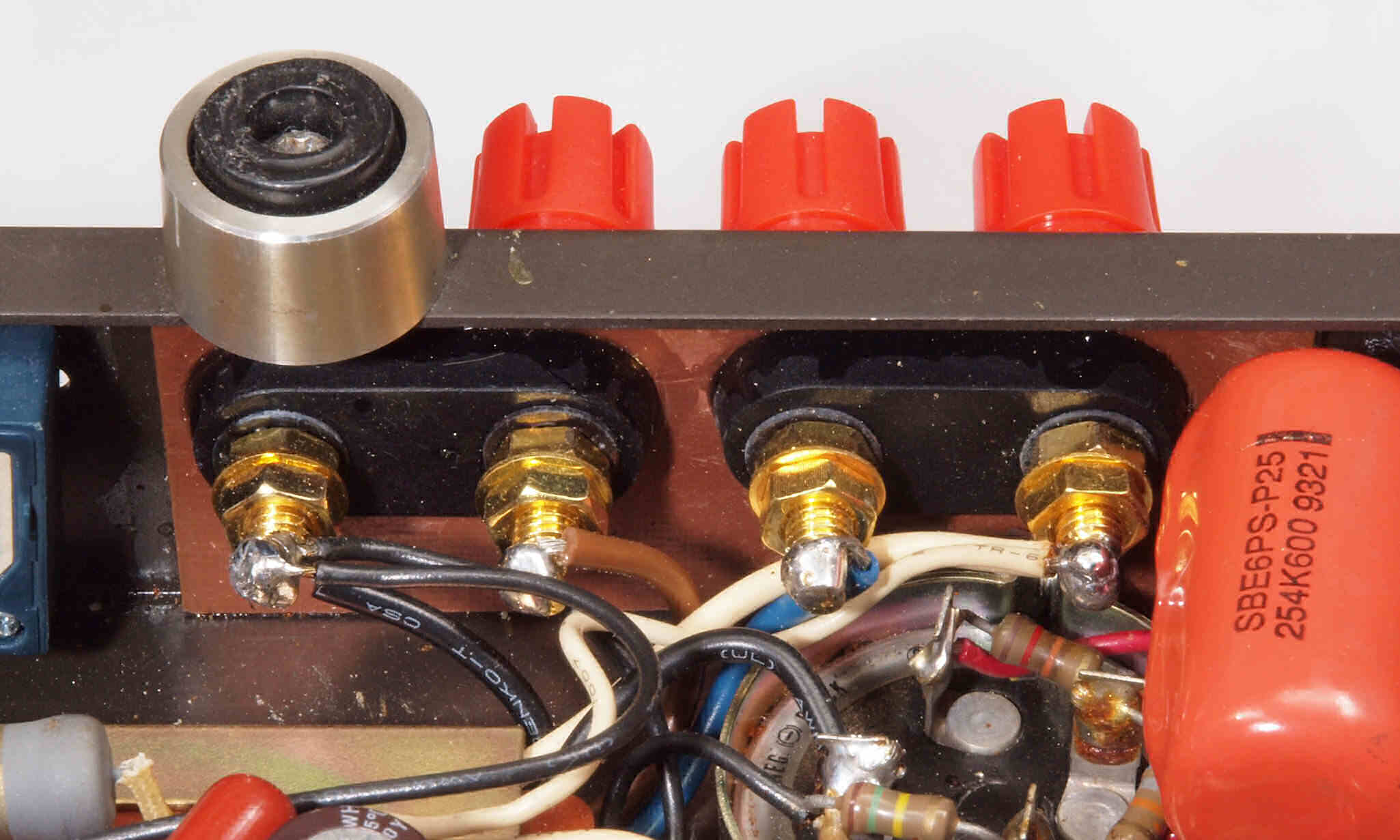 | A71. 点検中 SP接続端子交をバナナ対応に交換。裏に当て板製作が必要。写真は未加工なので曲がっています。 | ||||||||||||||||||||||||
