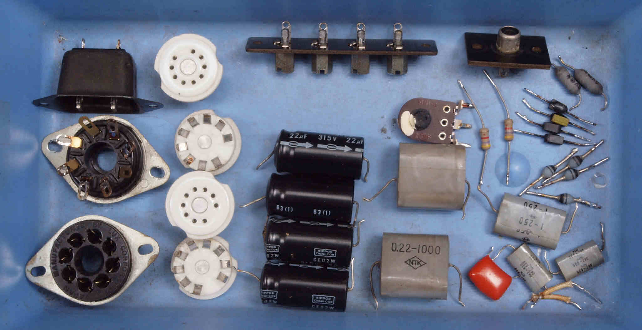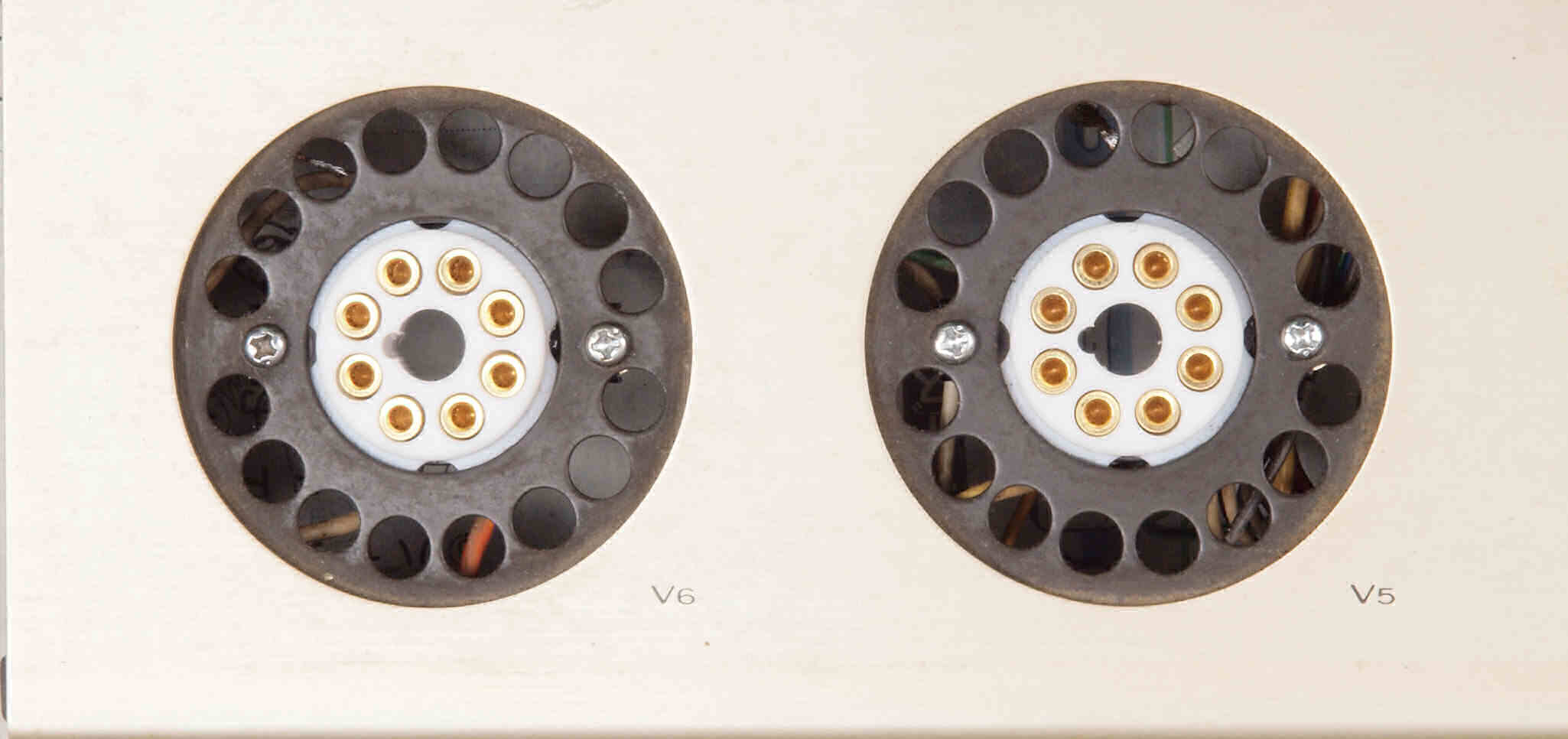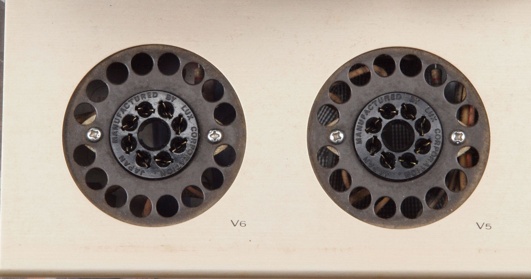 | C1B. 修理(交換)前 前段真空管ソケット。 金メッキ端子タイト絶縁製に交換。 | ||||||||||||||||||||||||