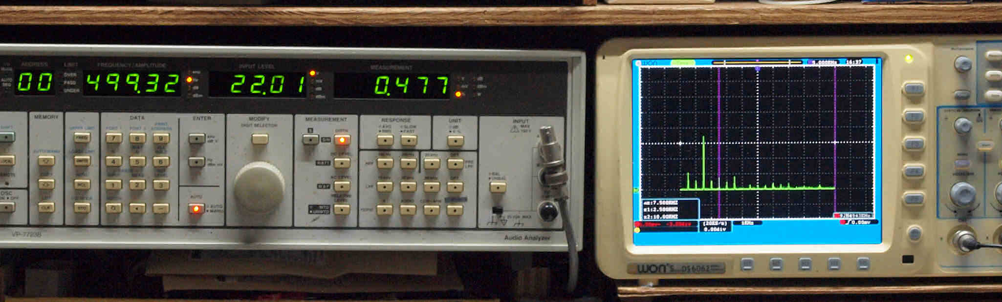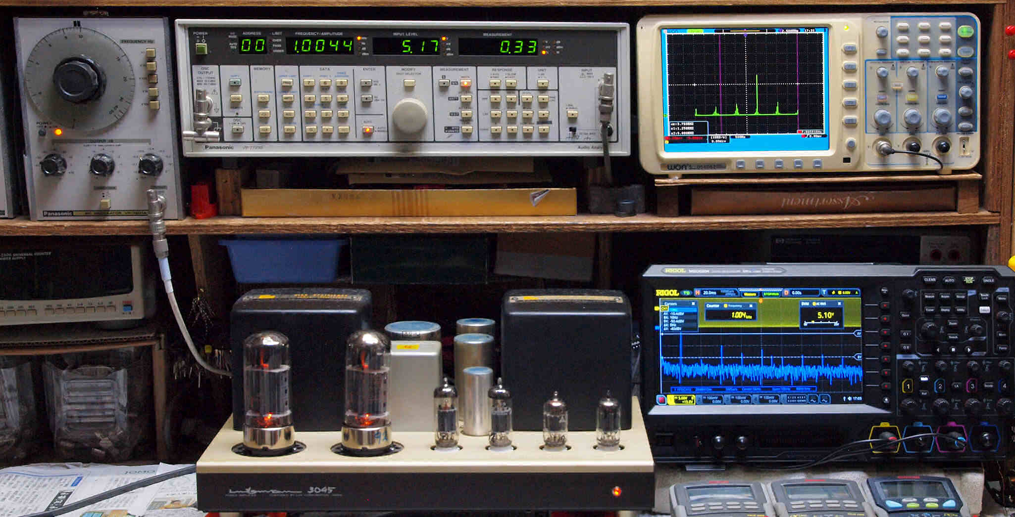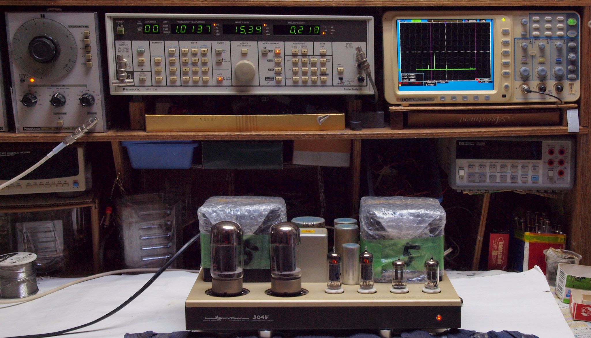 | T. 測定・調整。 画像をクリックすると、大きく(横幅2050ドット)表示されます。 T0. 出力・歪み率測定・調整、6550 三結の為出力は20W。 「見方」。 左=SP出力を「Audio Analyzer Panasonic VP−7723B」により測定。 表示LED、 左端=メモリーNo、 中左=周波数測定、 中右=出力電圧測定、 右端=歪み率測定。 右=VP−7723Bの基本波除去出力を「owon SDS6062(200MHZ)」で「FFT分析」表示。 オーディオ発振器 VP−7201A より50Hz〜100kHzの信号を出し(歪み率=約0.003%)、ATT+分配器を通し、AMPに入力。 よって、ダイアル設定出力レベルより低くなります。測定機器の仕様や整備の様子はこちら、「VP−7723B」「VP−7201A」。 FFT画面の見方はこちら。 |