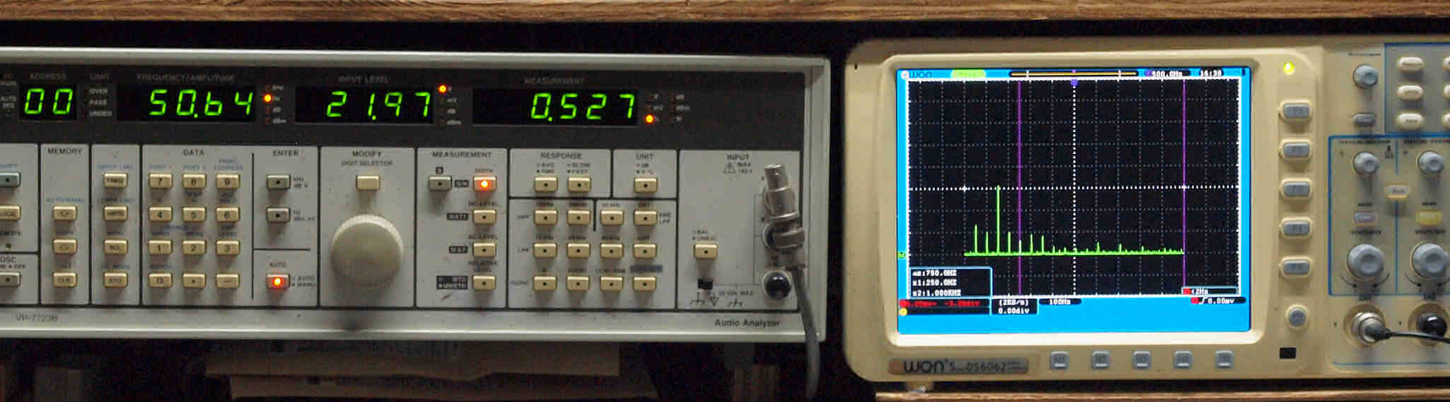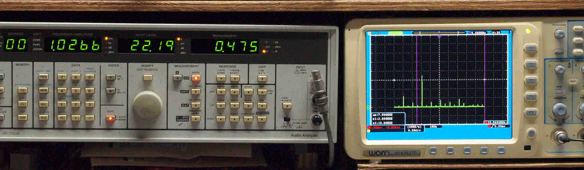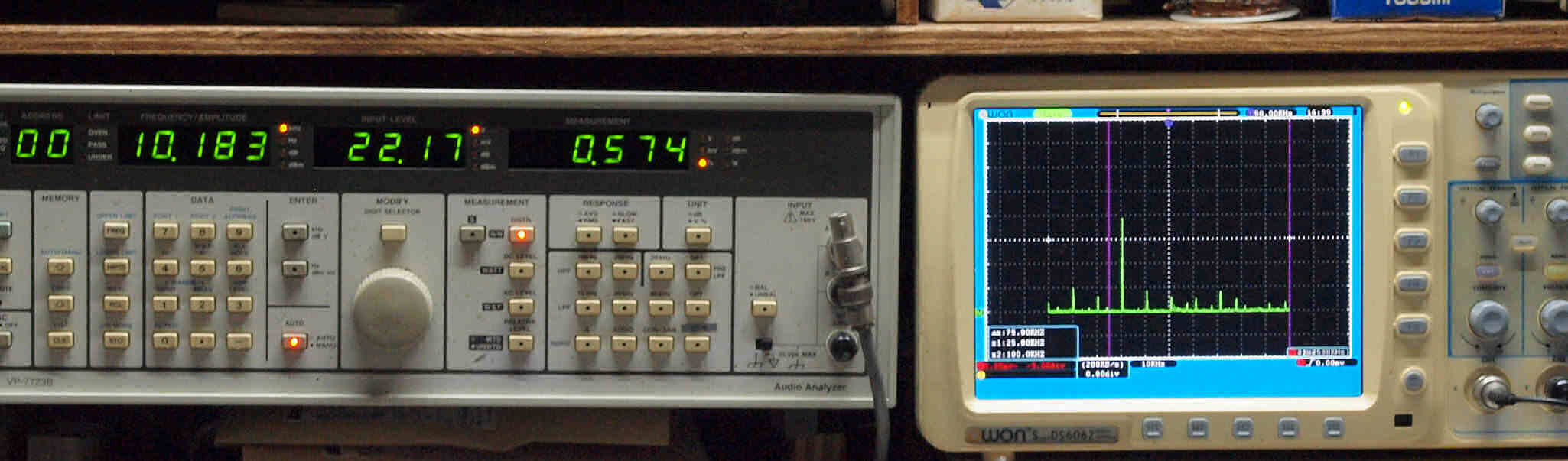 | E. 測定・調整。 画像をクリックすると、大きく(横幅2050ドット)表示されます。 E0. 出力・歪み率測定・調整 「見方」。 左=SP出力を「Audio Analyzer Panasonic VP−7723B」により測定。 表示LED、 左端=メモリーNo、 中左=周波数測定、 中右=出力電圧測定、 右端=歪み率測定。 右=VP−7723Bの基本波除去出力を「owon SDS6062(200MHZ)」で「FFT分析」表示。 オーディオ発振器 VP−7201A より50Hz〜100kHzの信号を出し(歪み率=約0.003%)、ATT+分配器を通し、AMPに入力。 よって、ダイアル設定出力レベルより低くなります。測定機器の仕様や整備の様子はこちら、「VP−7723B」「VP−7201A」。 FFT画面の見方はこちら。 |
