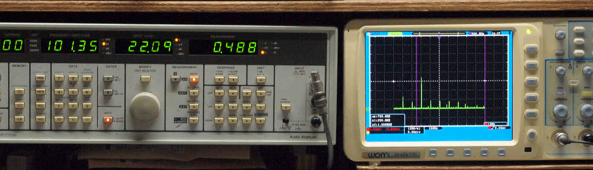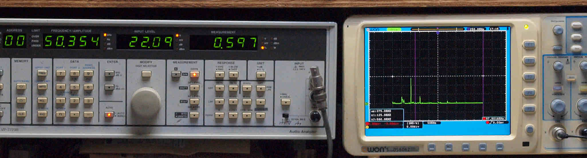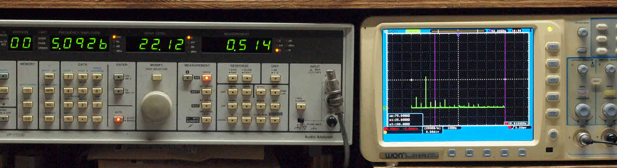 | E. 測定・調整。 画像をクリックすると、大きく(横幅2050ドット)表示されます。 E0. 出力・歪み率測定・調整 「見方」。 左=SP出力を「Audio Analyzer Panasonic VP−7723B」により測定。 表示LED、 左端=メモリーNo、 中左=周波数測定、 中右=出力電圧測定、 右端=歪み率測定。 右=VP−7723Bの基本波除去出力を「owon SDS6062(200MHZ)」で「FFT分析」表示。 オーディオ発振器 VP−7201A より50Hz〜100kHzの信号を出し(歪み率=約0.003%)、ATT+分配器を通し、AMPに入力。 よって、ダイアル設定出力レベルより低くなります。測定機器の仕様や整備の様子はこちら、「VP−7723B」「VP−7201A」。 FFT画面の見方はこちら。 |