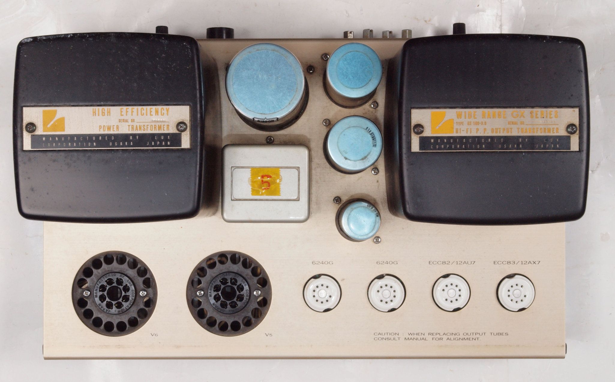 | CA5 完成後 前上から見る。8045G2本、6240G2本、12AU7、12AX7。 | ||||||||||||||||||||||||