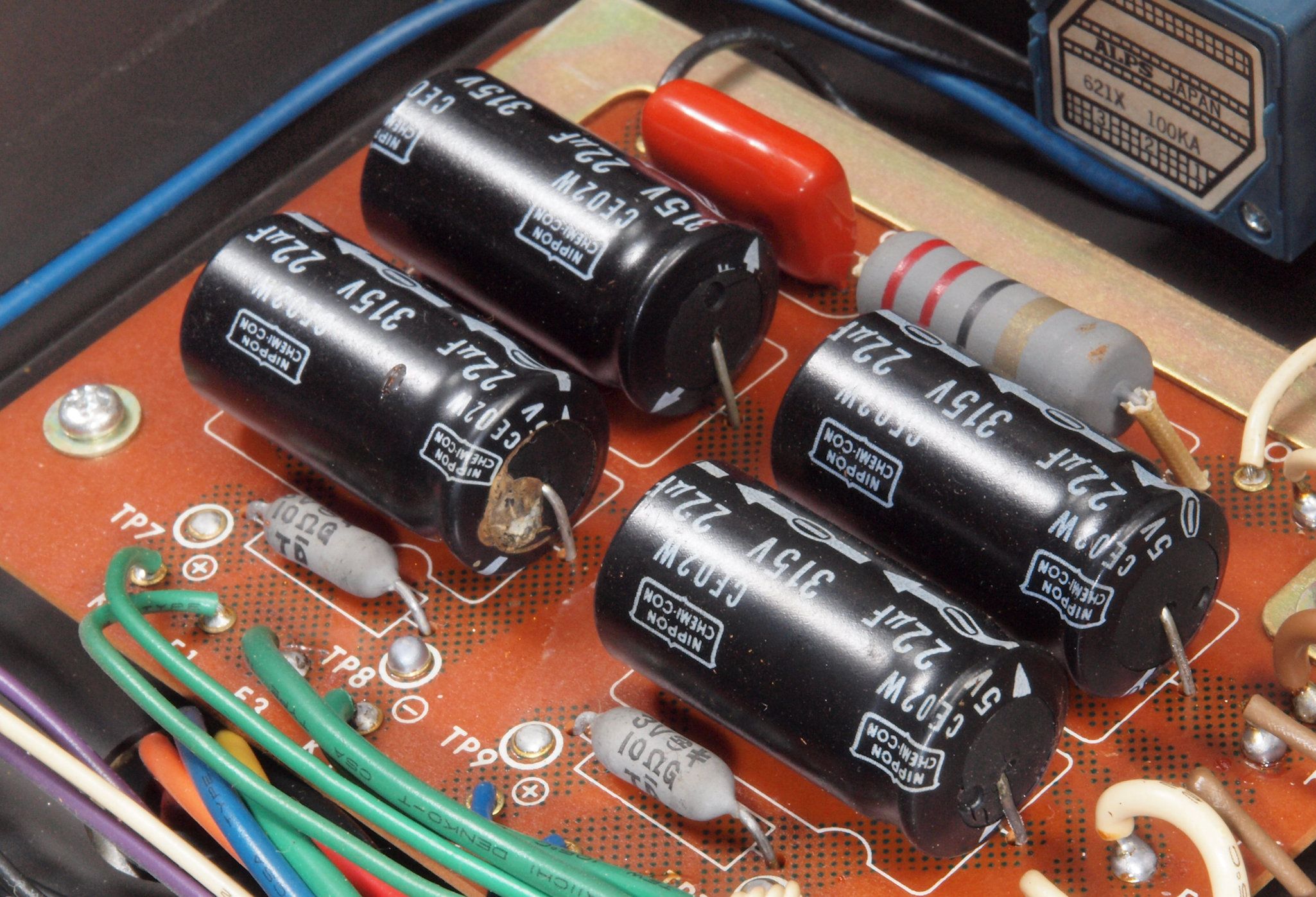 | C312. 修理前 出力トランス下のフイルター基板。電解コンデンサー3個が液漏れしている。 | ||||||||||||||||||||||||