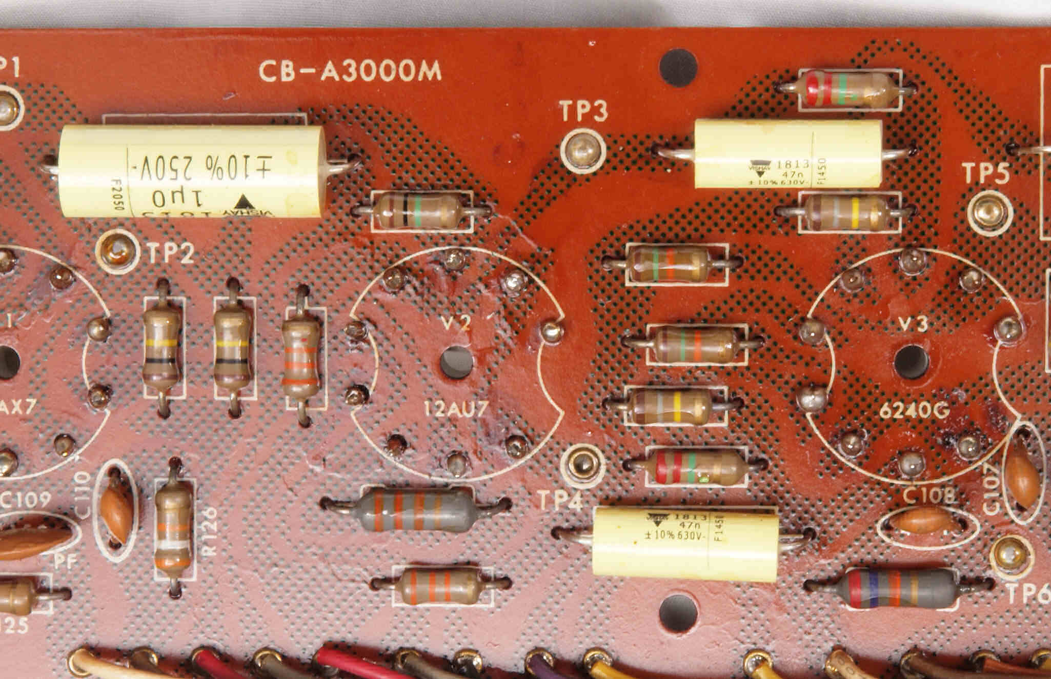 | C112. 修理中 前段AMP基板。銅箔が浮いている。 | ||||||||||||||||||||||||