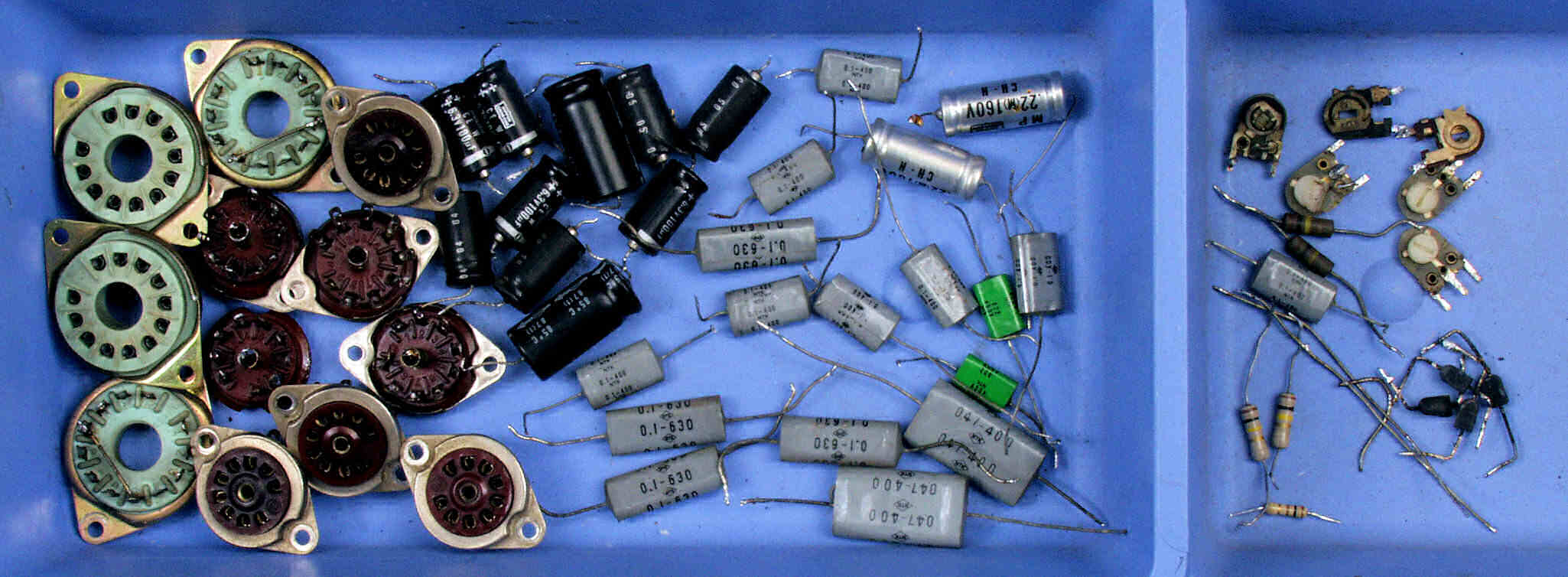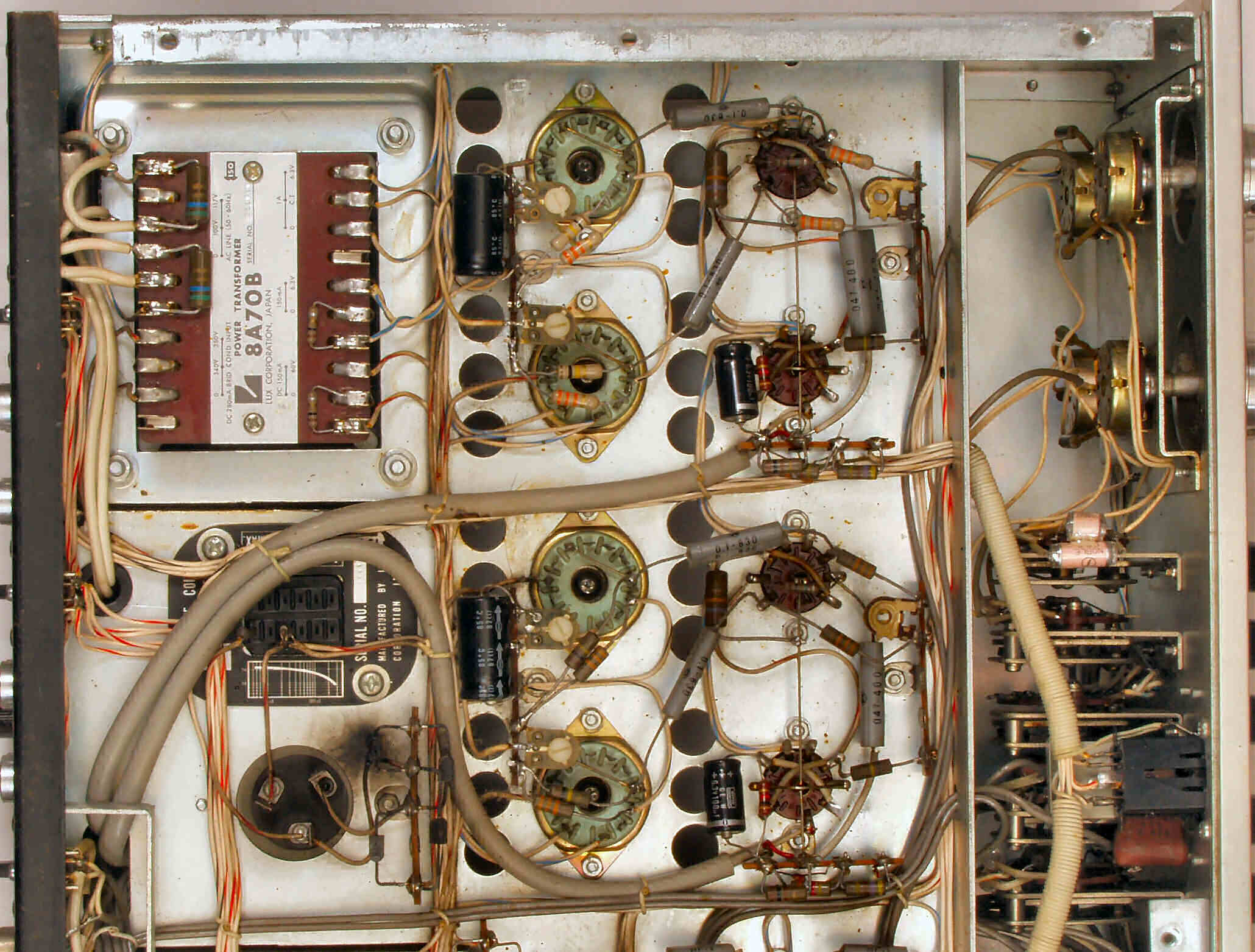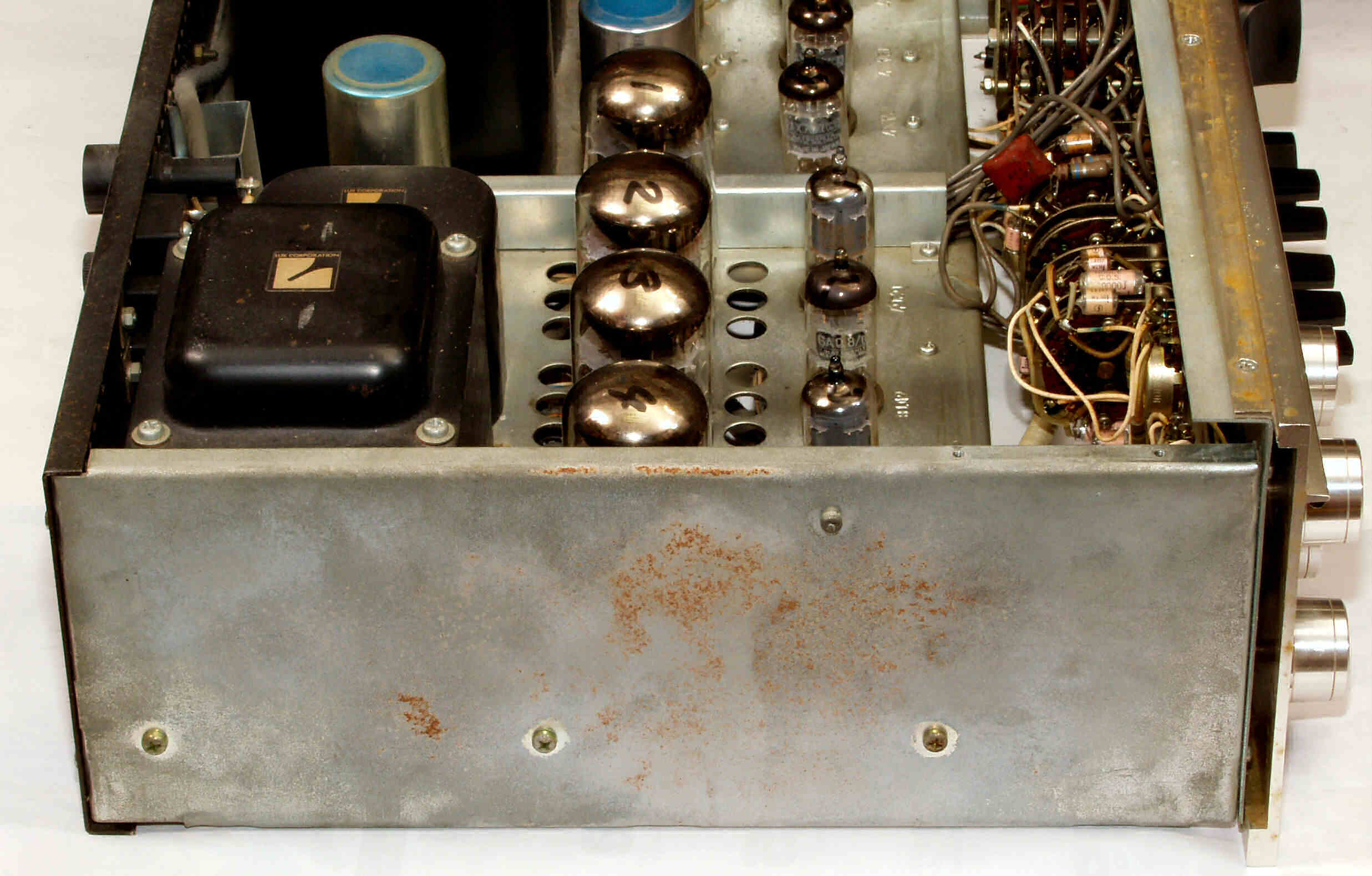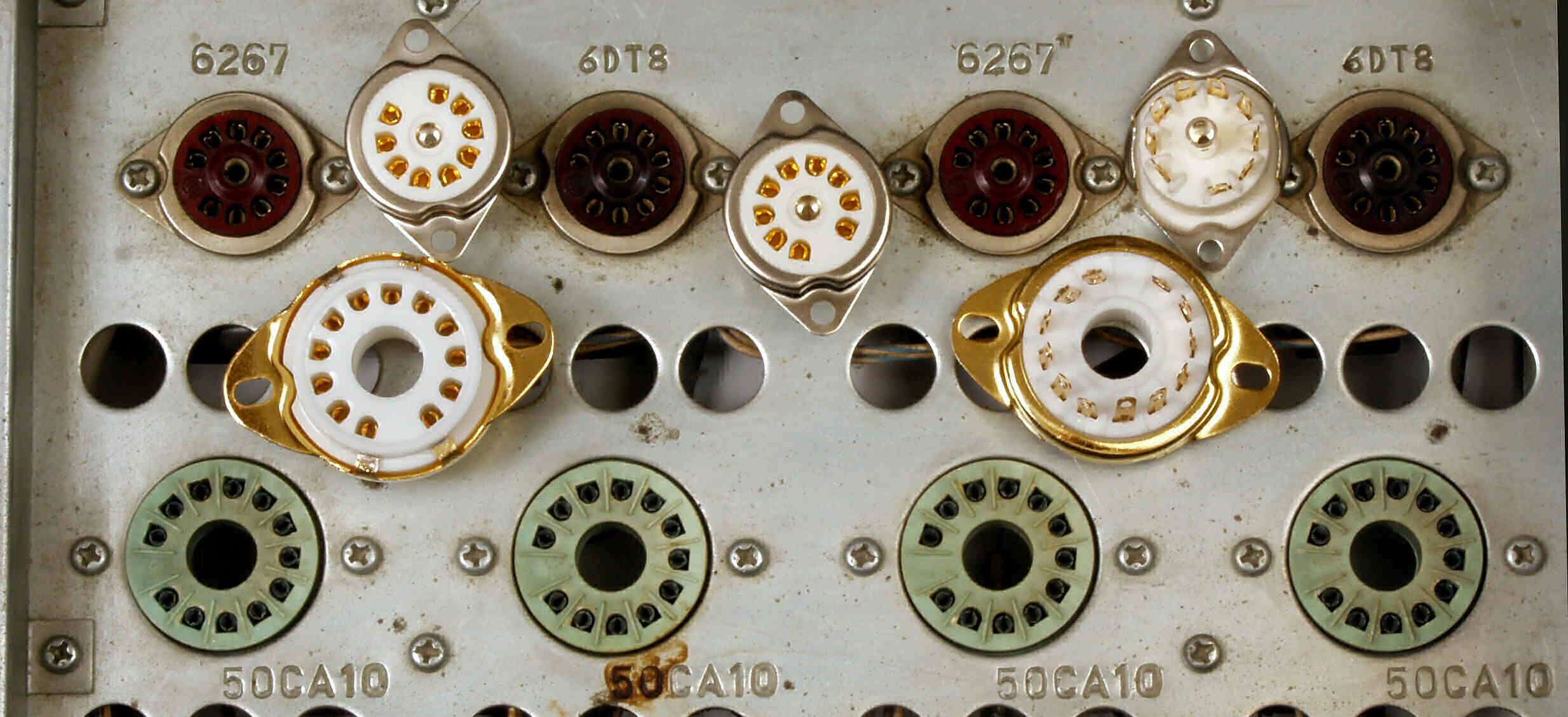 C5A. 修理前、出力真空管50CA10、前段真空管6DT8・6267のソケット。