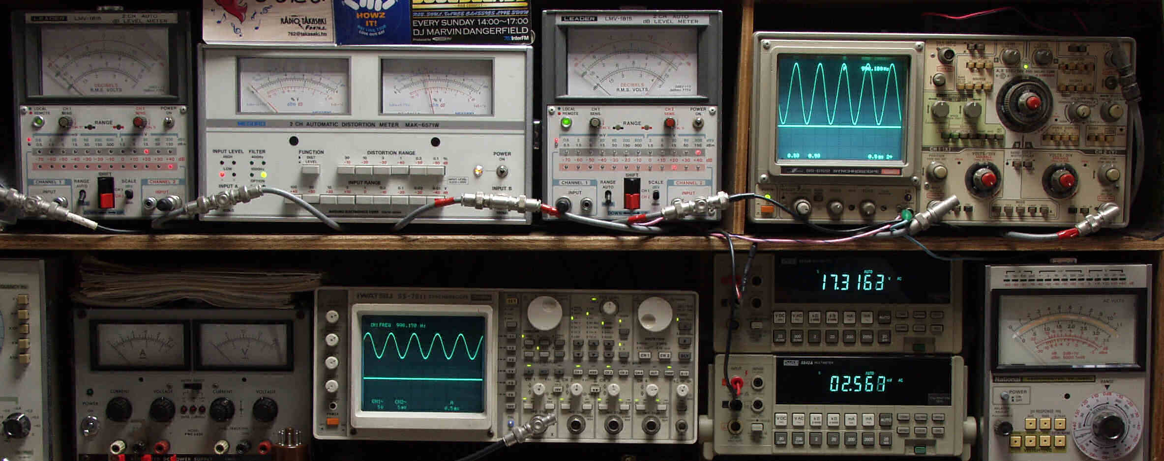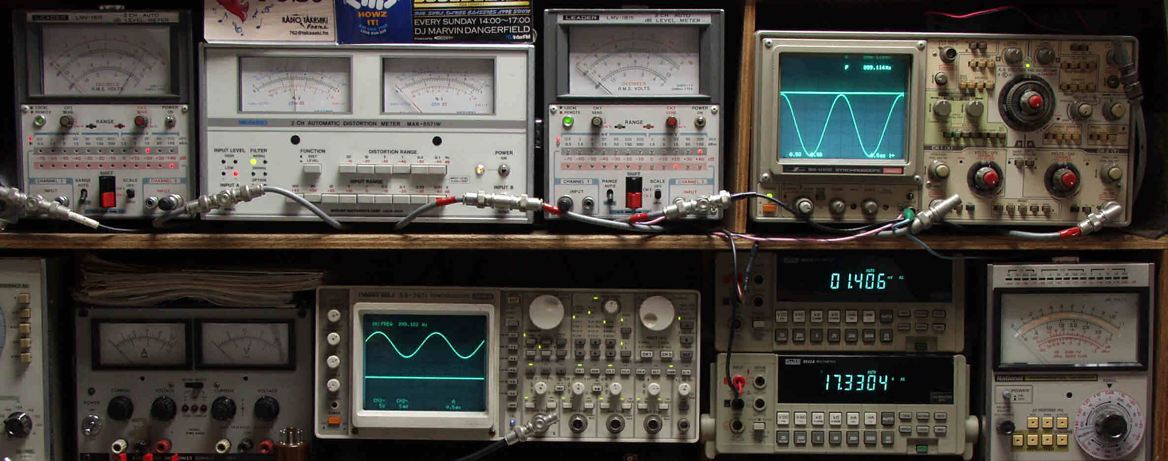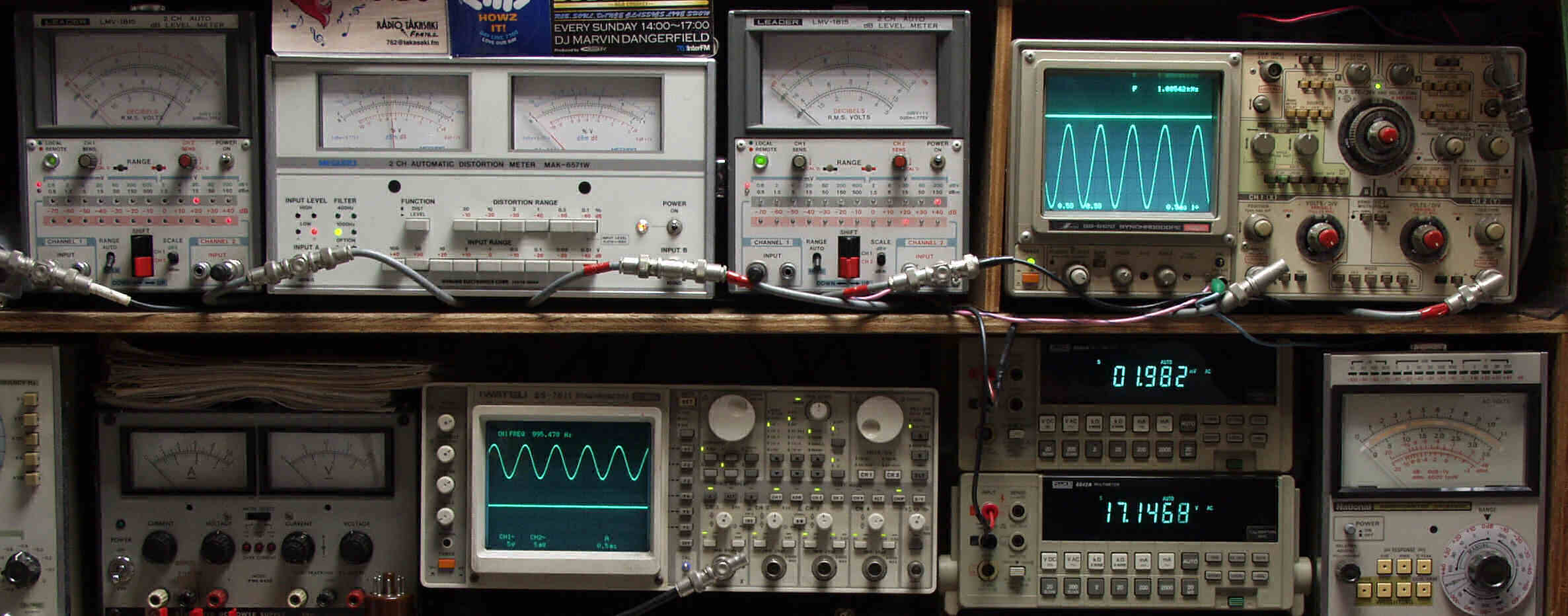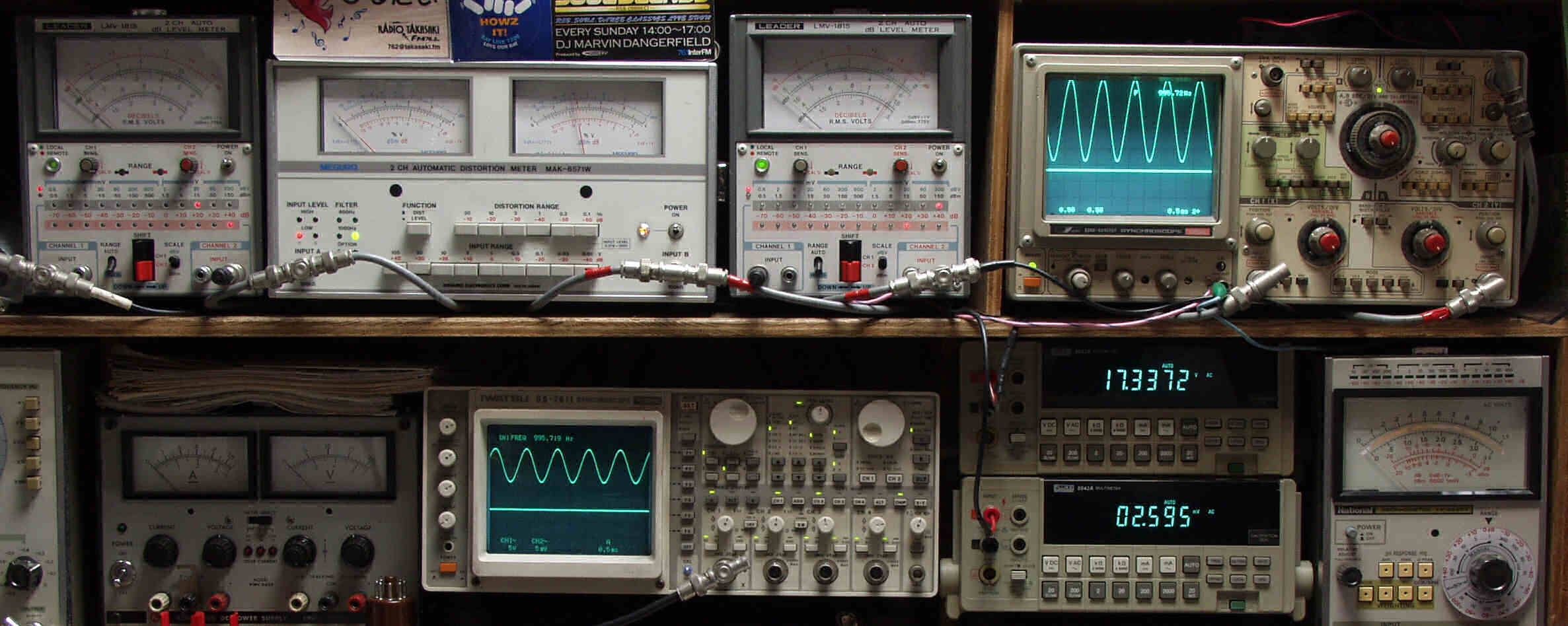 上段中左 歪み率計=出力の歪み率測定 左メータ=L出力、右メータ=R出力