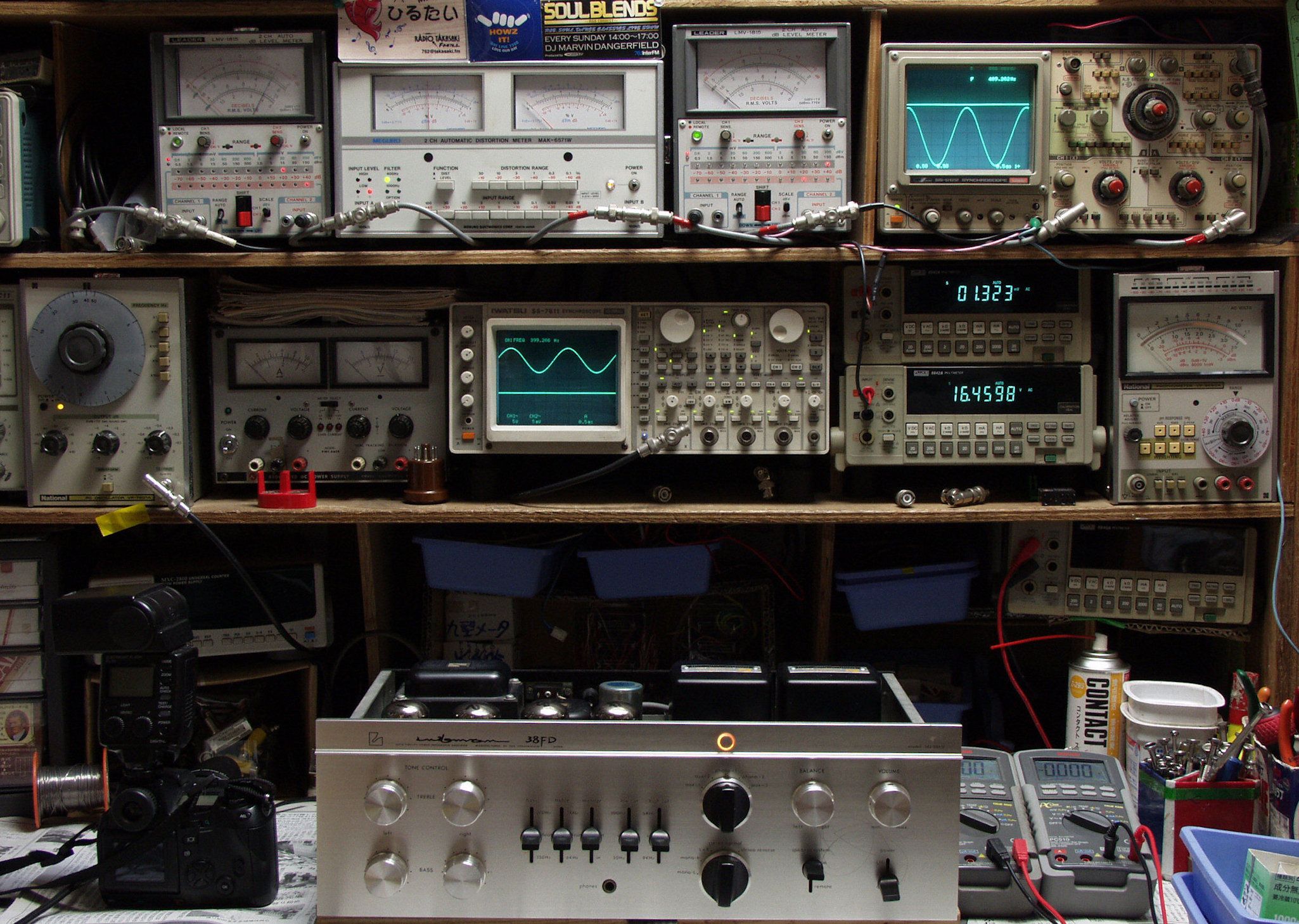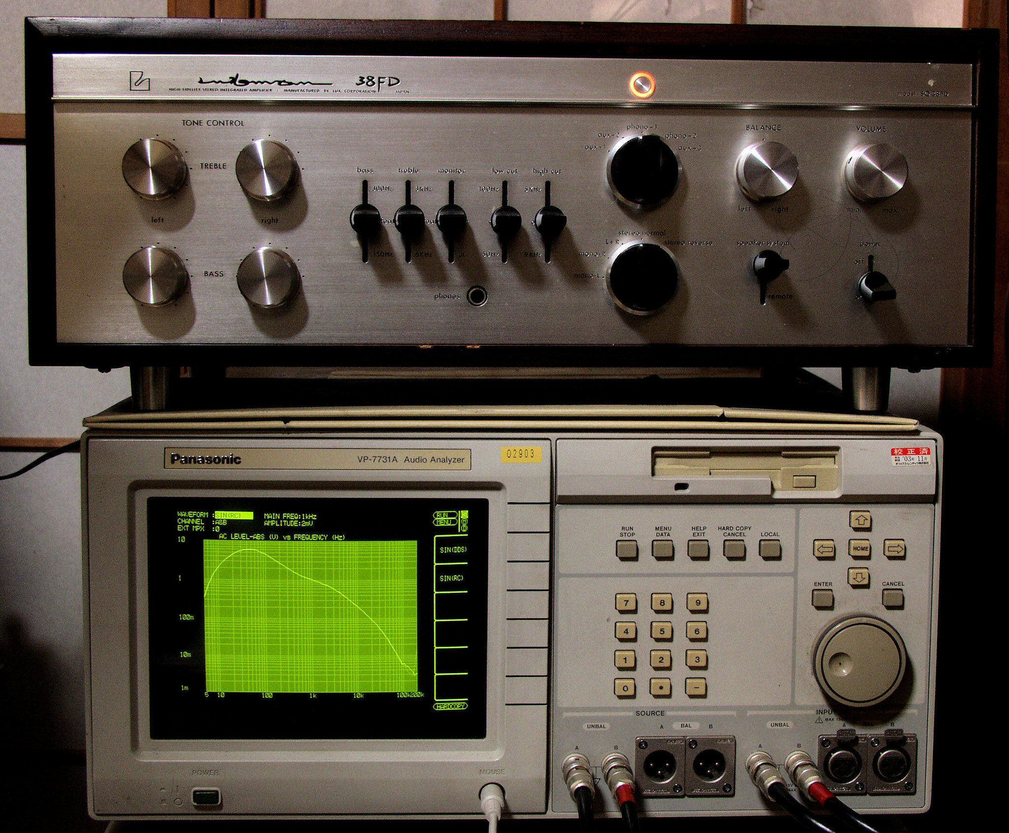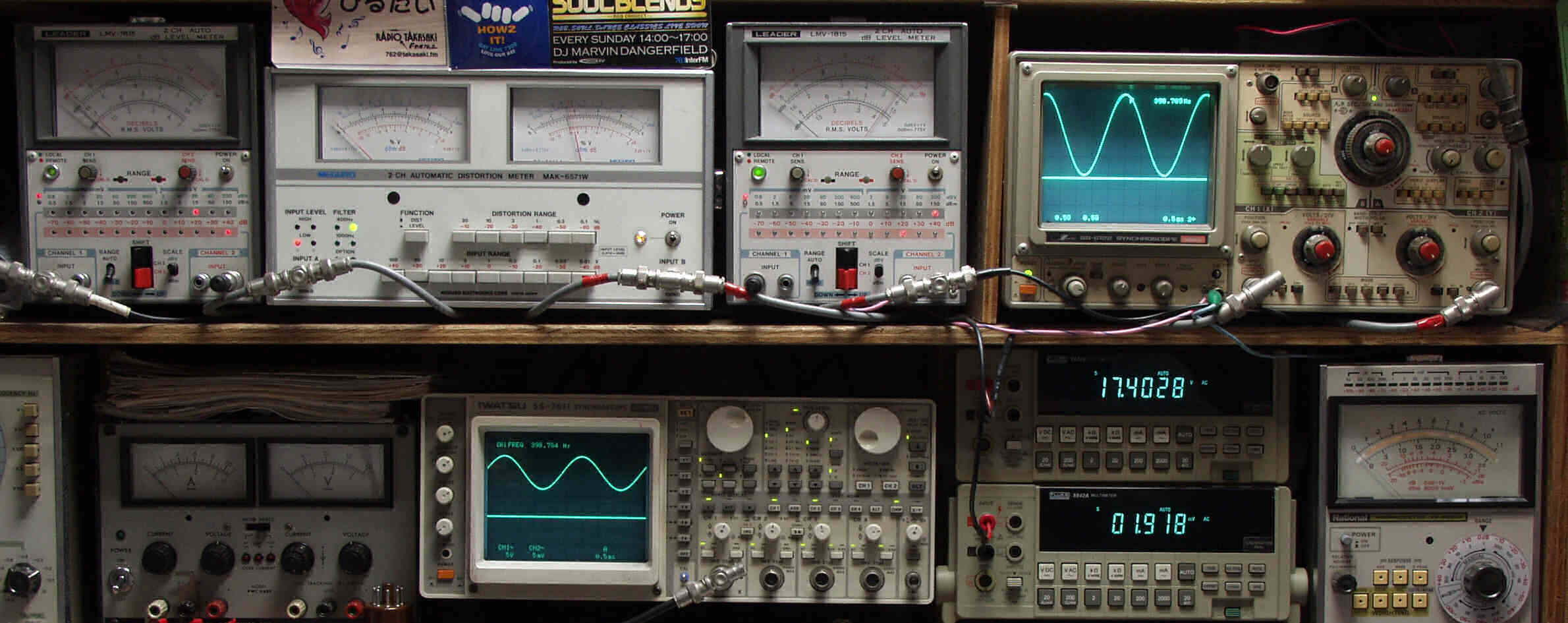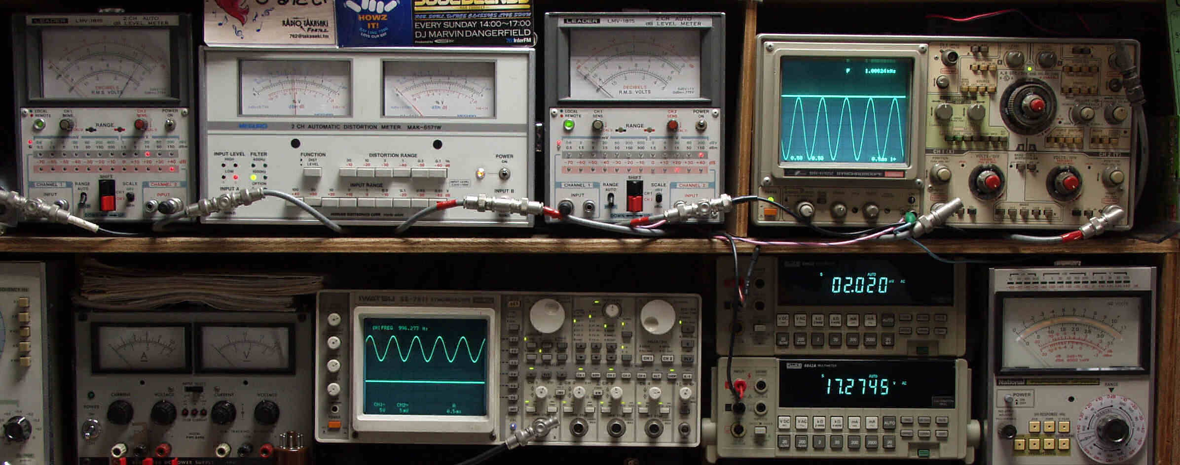 上段中左 歪み率計=出力の歪み率測定 左メータ=L出力、右メータ=R出力