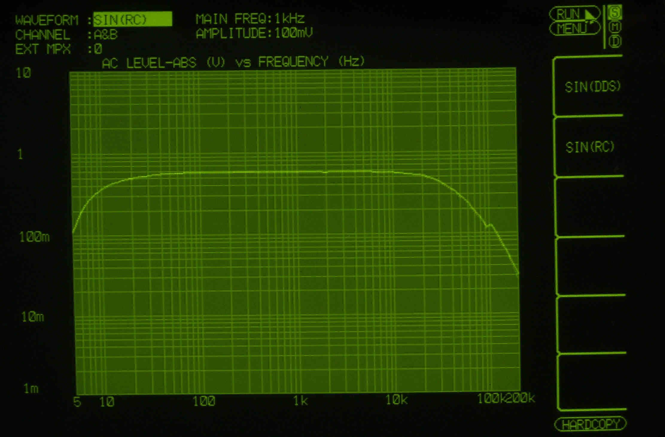 MM入力、入力電圧=1mV一定入力、VRはmax、左出力=薄(細い)色 右出力=濃い(太い)色