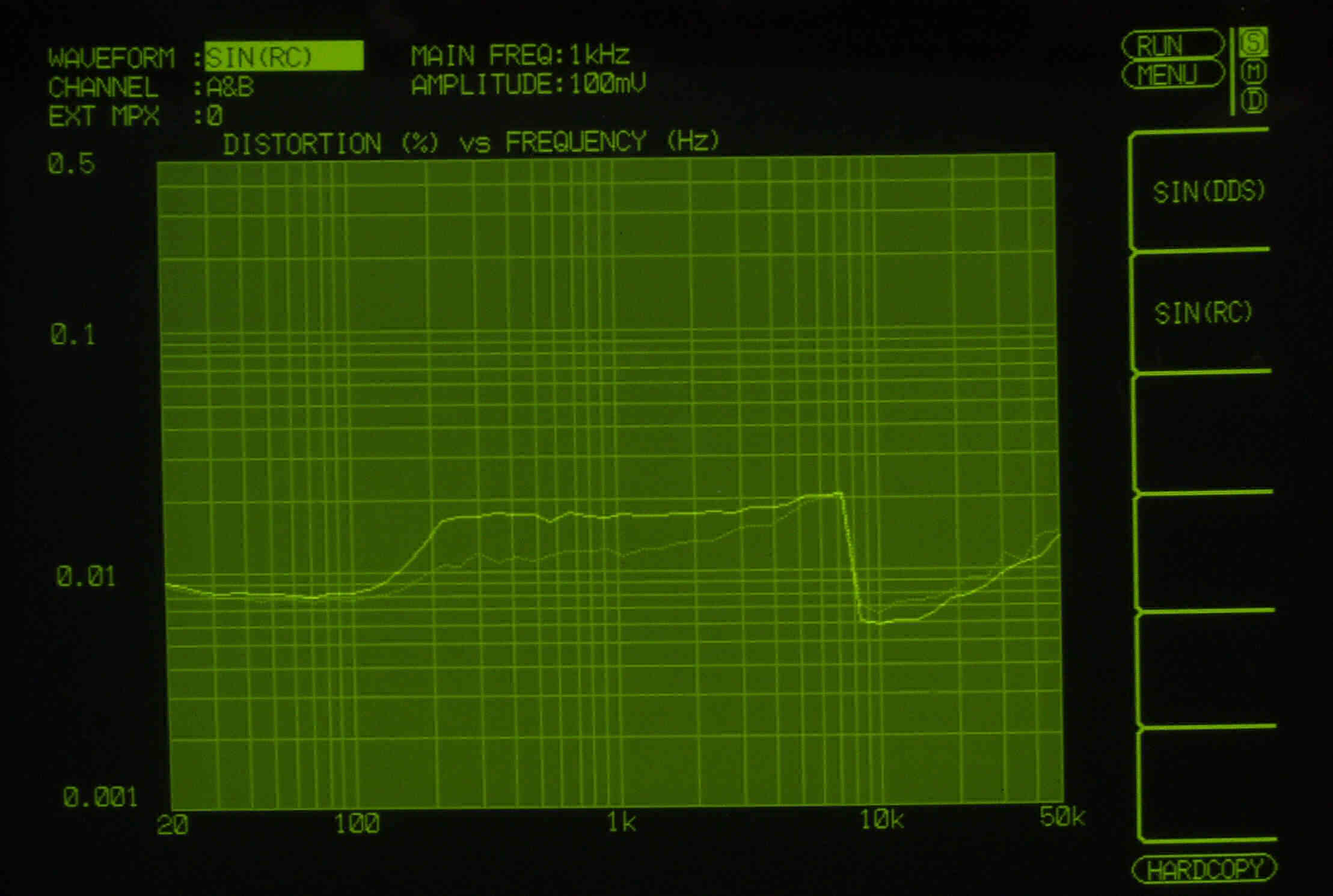 E2A. R側SP出力電圧17V=36W出力、0.4%歪み。 AUX入力、1000HZ
