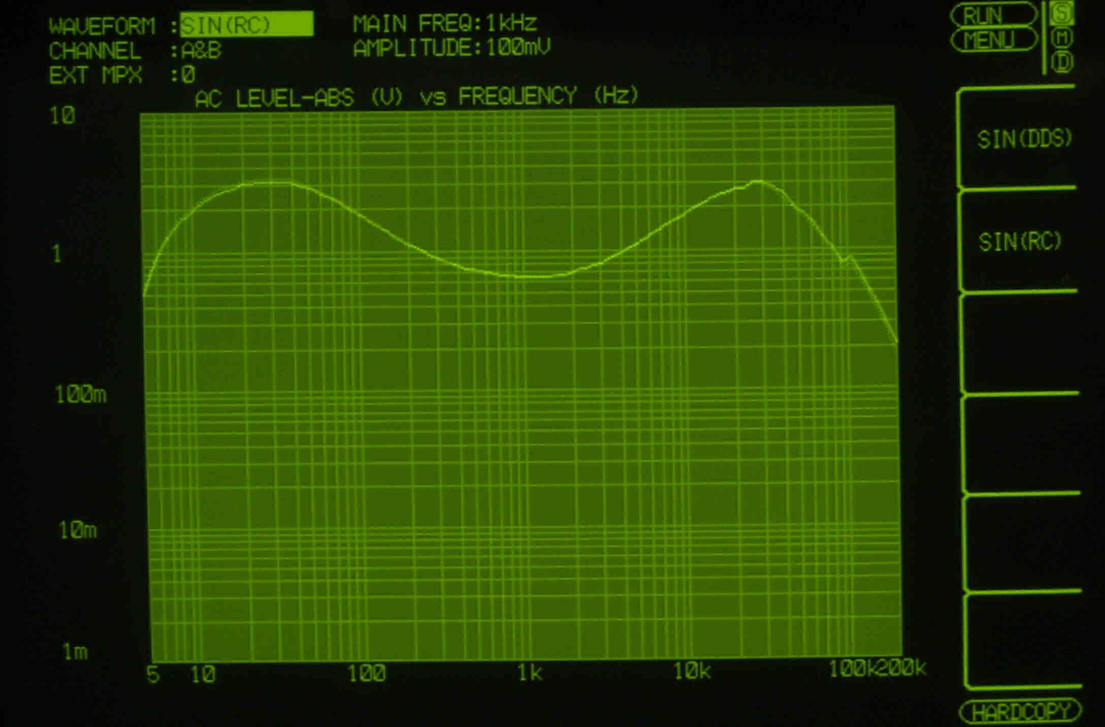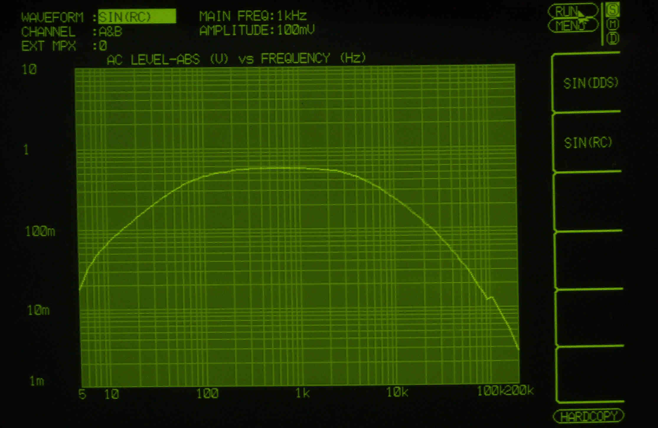 AUX入力端子へ100mV一定入力、VRはmax、左出力=薄(細い)色 右出力=濃い(太い)色