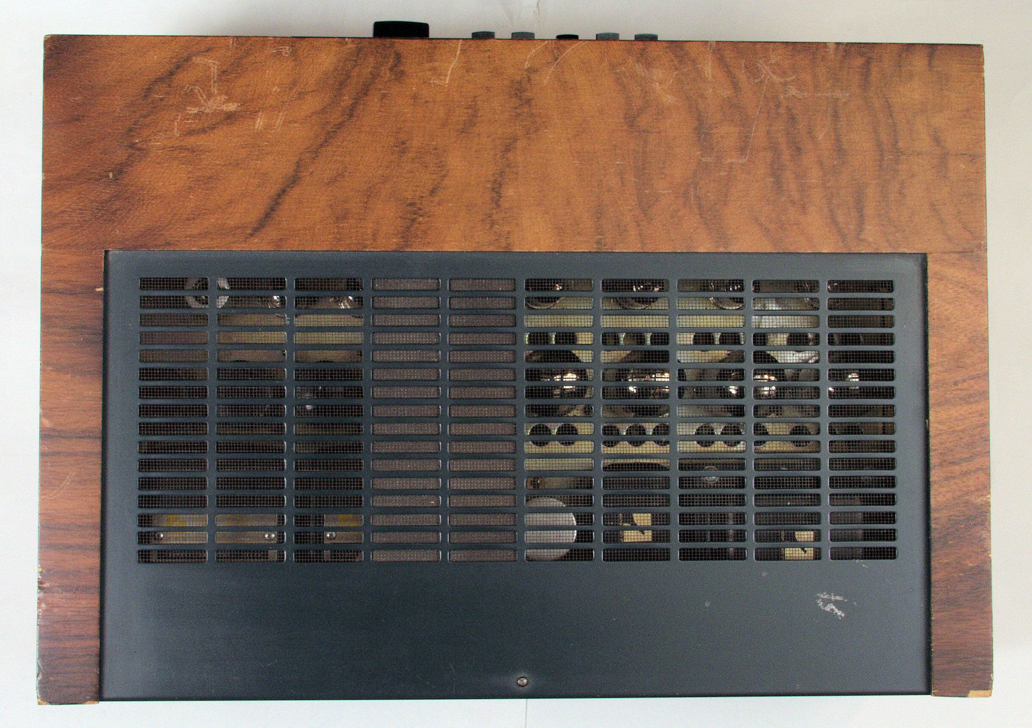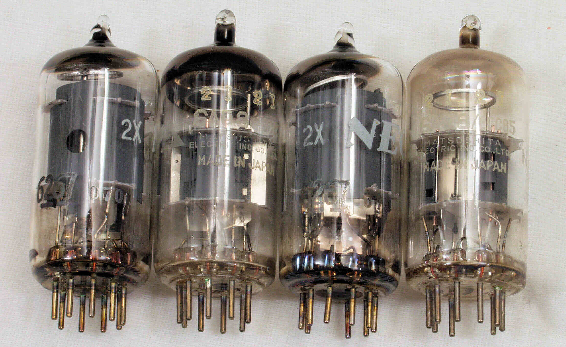 | U2. 付属真空管。 左から1本目6267、1本目6AQ8、2本目6267、2本目6AQ8。 真空管ハンドブック(規格表)の、 6267相互コンダクタンス=2000μmho、「Ep=250V、Ip=3mA、Esg=140V、Eg1=−2V」。 6AQ8相互コンダクタンス=5900μmho、「Ep=250V、Ip=10mA、Eg1=−2.3V」。 1960/1962/1964/1966ナショナル真空管ハンドブック、1995オーディオ用真空管マニアル、60/62/69東芝電子管ハンドブック、1962日立電子管ハンドブック、1965/1971全日本真空管マニュアル、RC15/19/26/27/28/29/30 Receiving Tube Manual、1966/実用真空管ハンドブック、1995世界の真空管カタログより。 |
