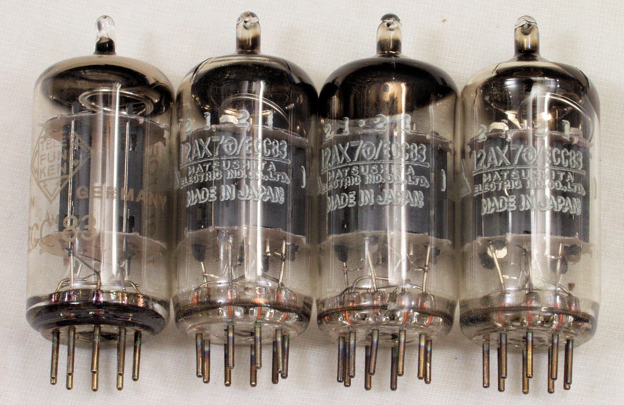 | U40. 付属真空管12AX7(ECC83)。 左から1本目.2本目.3本目.4本目 真空管ハンドブック(規格表)の、 12AX7(ECC83)相互コンダクタンス=1600μmho「Ep=250V、Ip=1.2mA、Eg1=−2V」。 1960/1962/1964/1966ナショナル真空管ハンドブック、1995オーディオ用真空管マニアル、60/62/69東芝電子管ハンドブック、1962日立電子管ハンドブック、1965/1971全日本真空管マニュアル、RC15/19/26/27/28/29/30 Receiving Tube Manual、1966/実用真空管ハンドブック、1995世界の真空管カタログより。 |