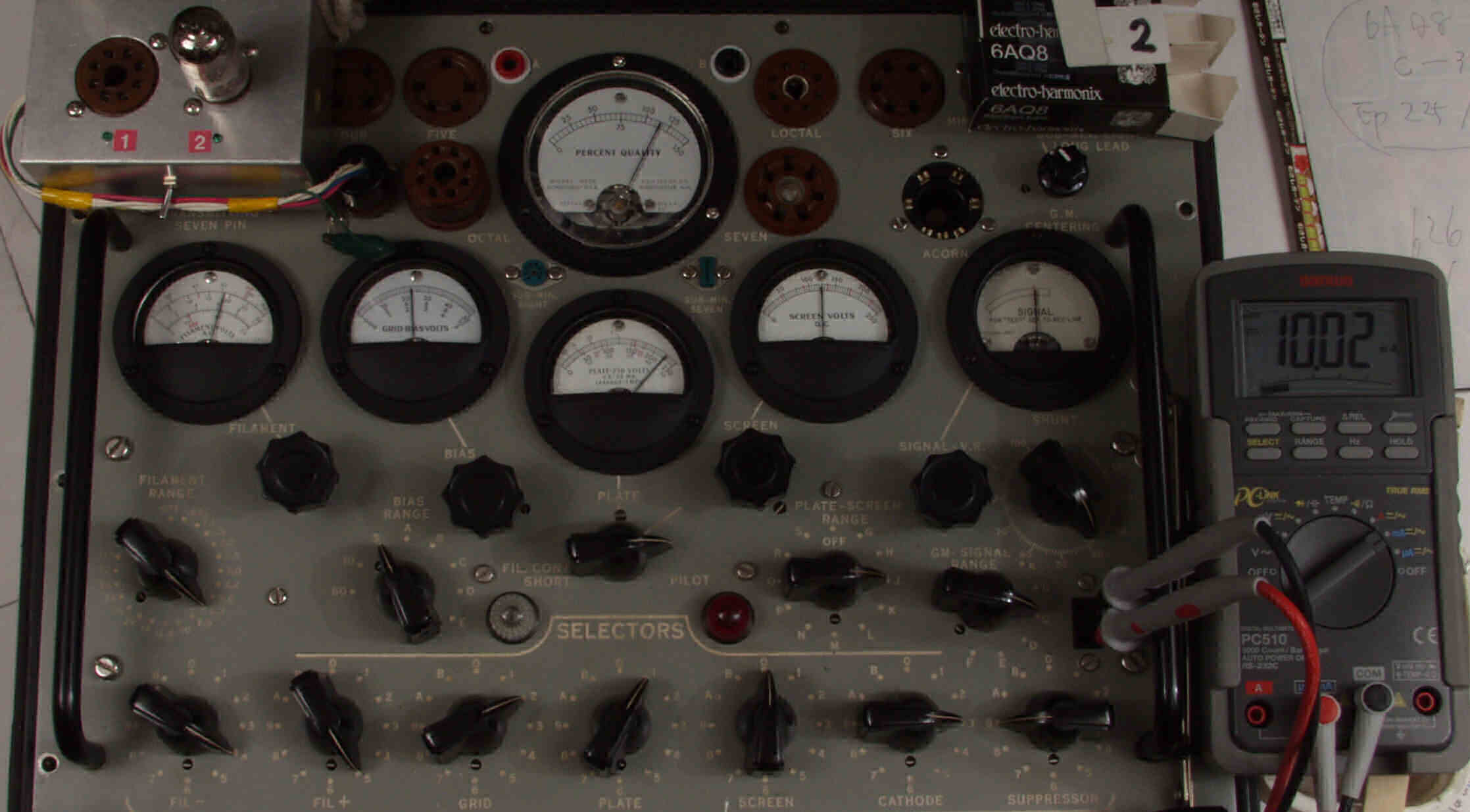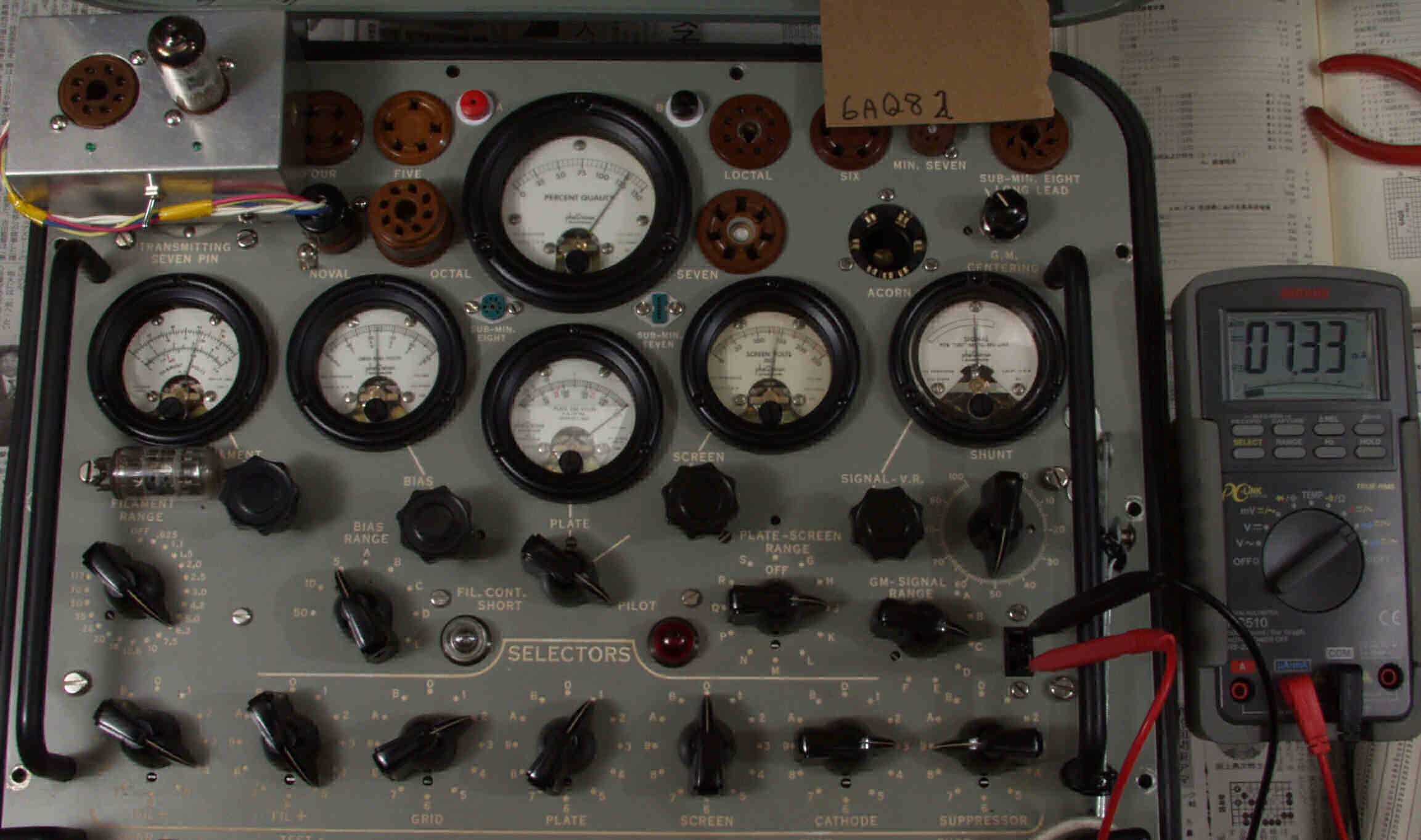 | U322. 付属2本目 6AQ8 ユニット2。 Gm測定=4800μmho、IP=6.82mA。 Cレンジ=6000μmhoレンジでの測定、「Ep=250V、Eg1=−2.3V」。 |