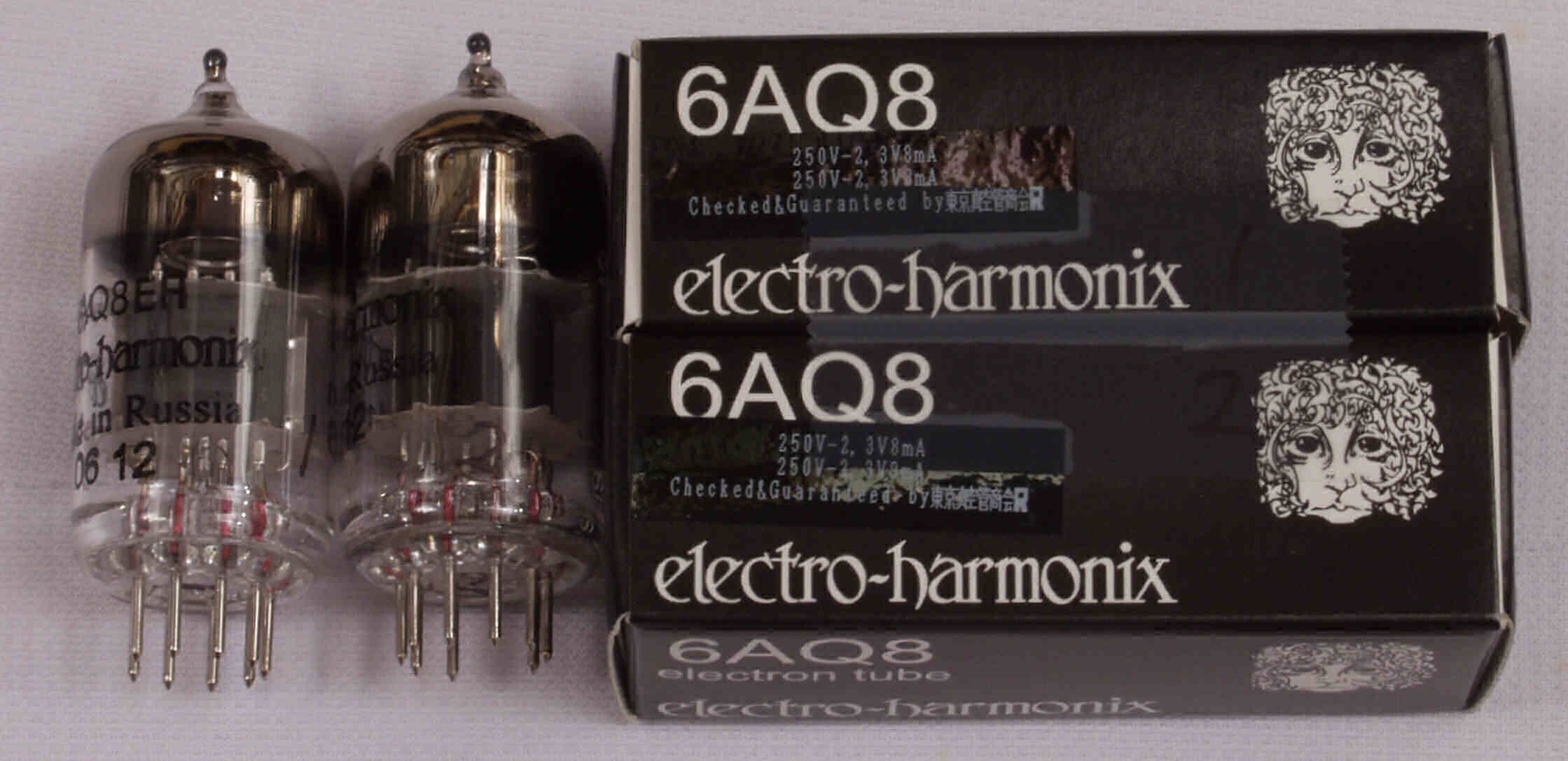 | V3. 新品購入真空管 6AQ8 。 左から1本目。 購入先はこちら 真空管ハンドブック(規格表)の、 6267相互コンダクタンス=2000μmho、「Ep=250V、Ip=3mA、Esg=140V、Eg1=−2V」。 6AQ8相互コンダクタンス=5900μmho、「Ep=250V、Ip=10mA、Eg1=−2.3V」。 1960/1962/1964/1966ナショナル真空管ハンドブック、1995オーディオ用真空管マニアル、60/62/69東芝電子管ハンドブック、1962日立電子管ハンドブック、1965/1971全日本真空管マニュアル、RC15/19/26/27/28/29/30 Receiving Tube Manual、1966/実用真空管ハンドブック、1995世界の真空管カタログより。 |
