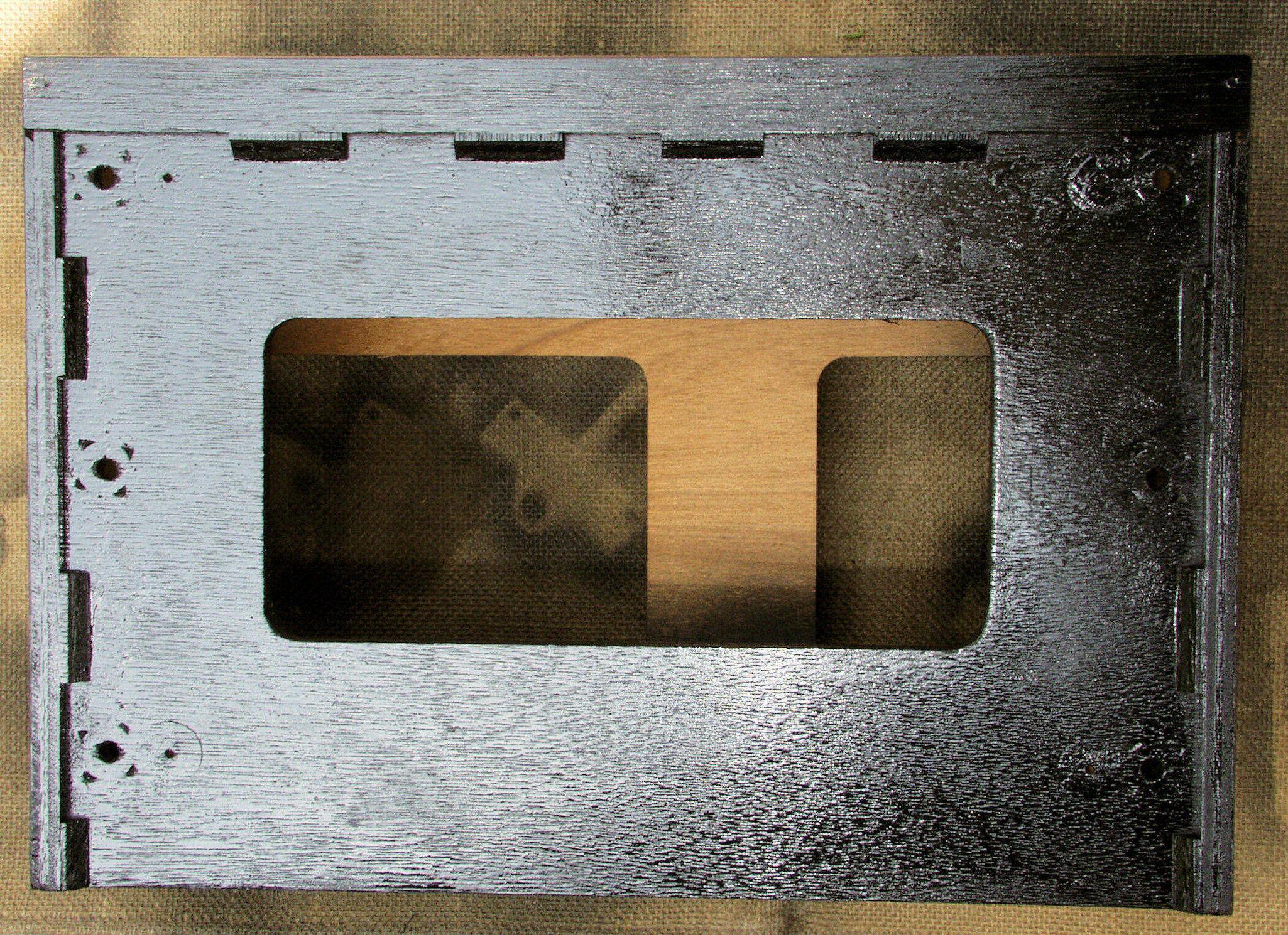 | K23. 修理(塗装)中 ベニヤの接着材が劣化しているので、黒色ラッカーを吹き付ける。 |