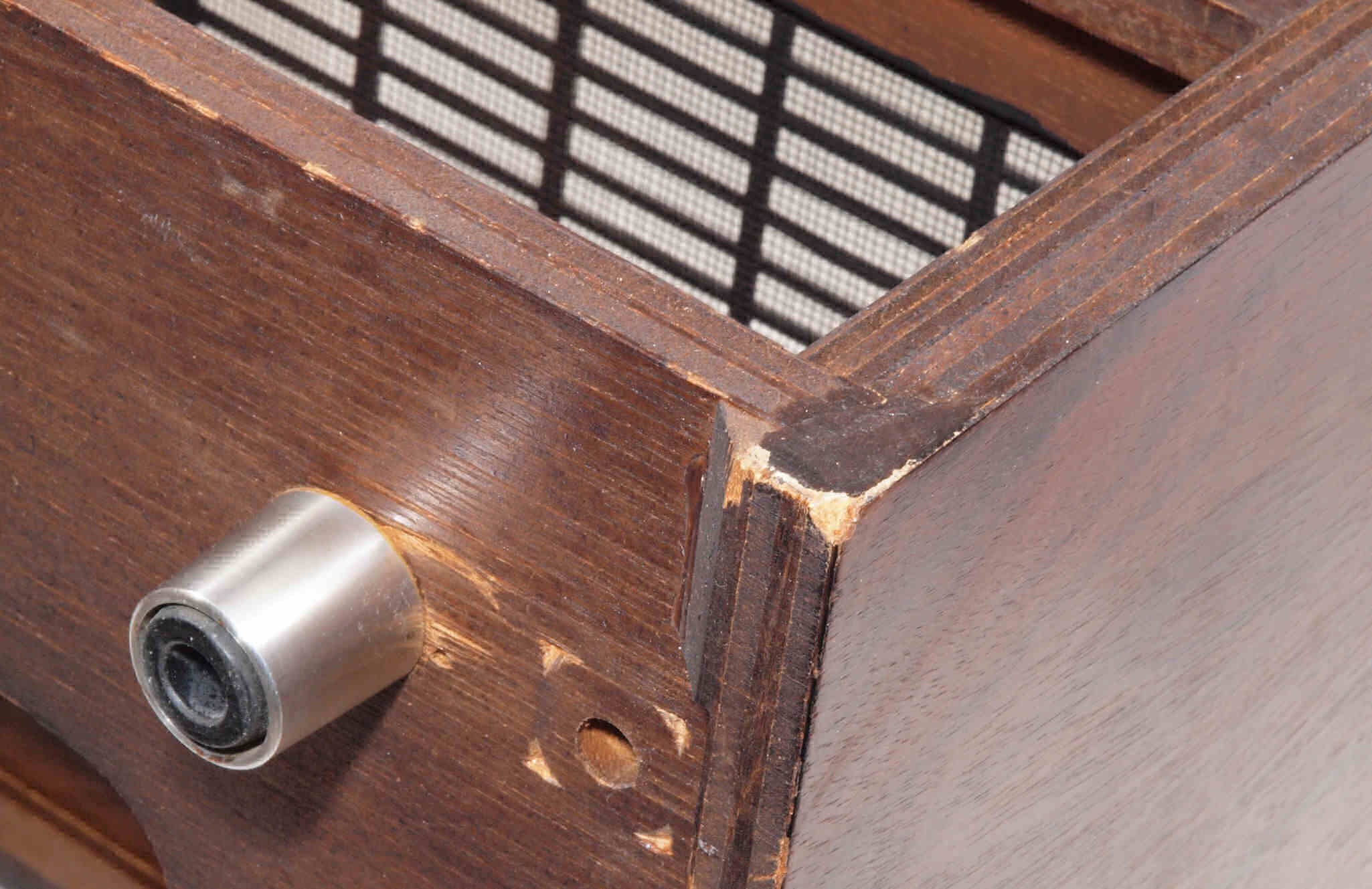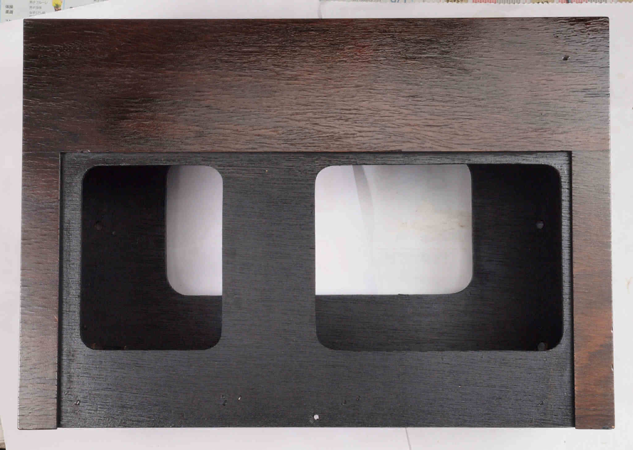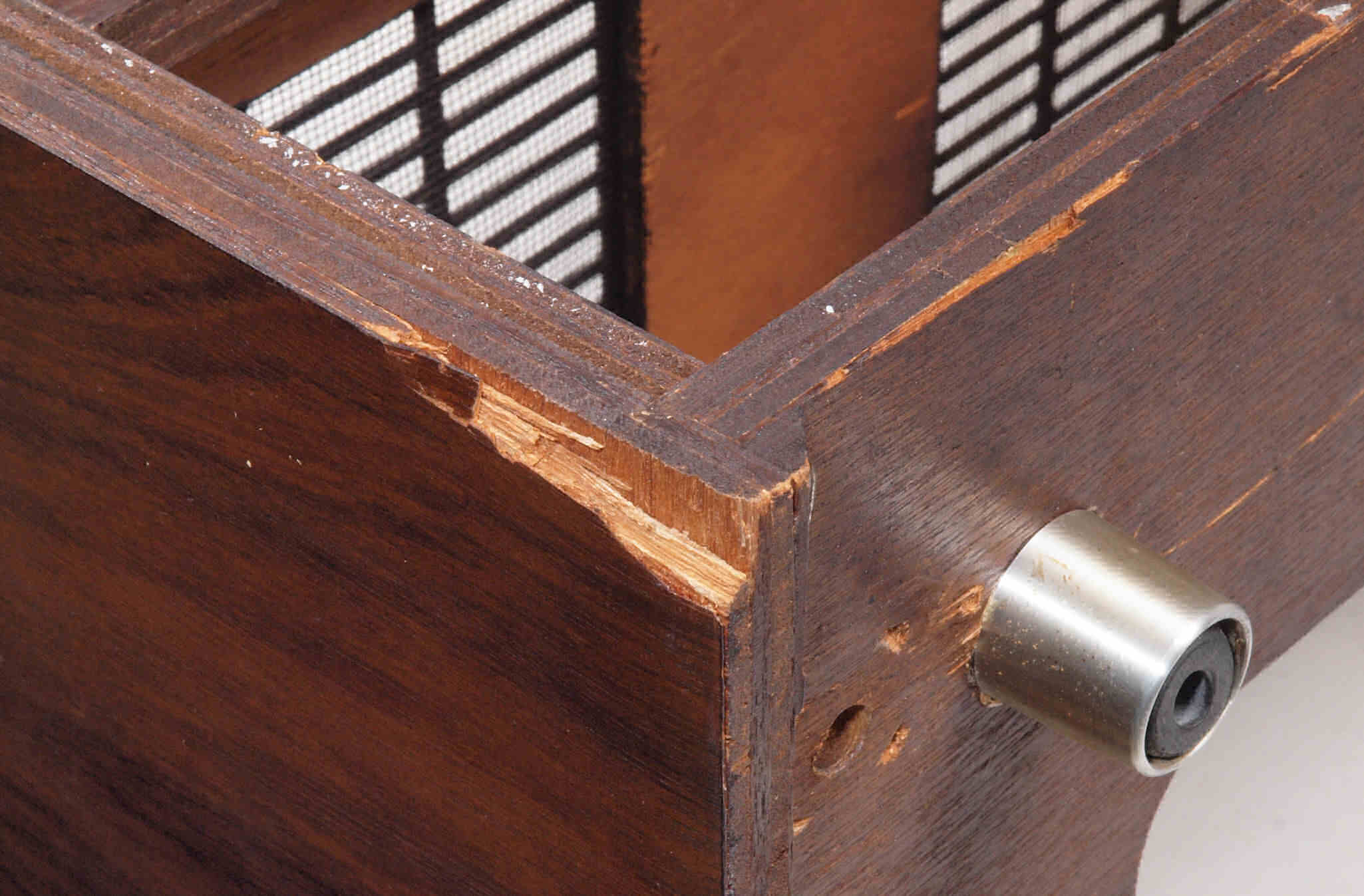 | K. 裏パネルと木製ケース修理。 画像をクリックすると、大きく(横幅2050ドット)表示されます。 K01. 修理前 ガラリパネル。 |