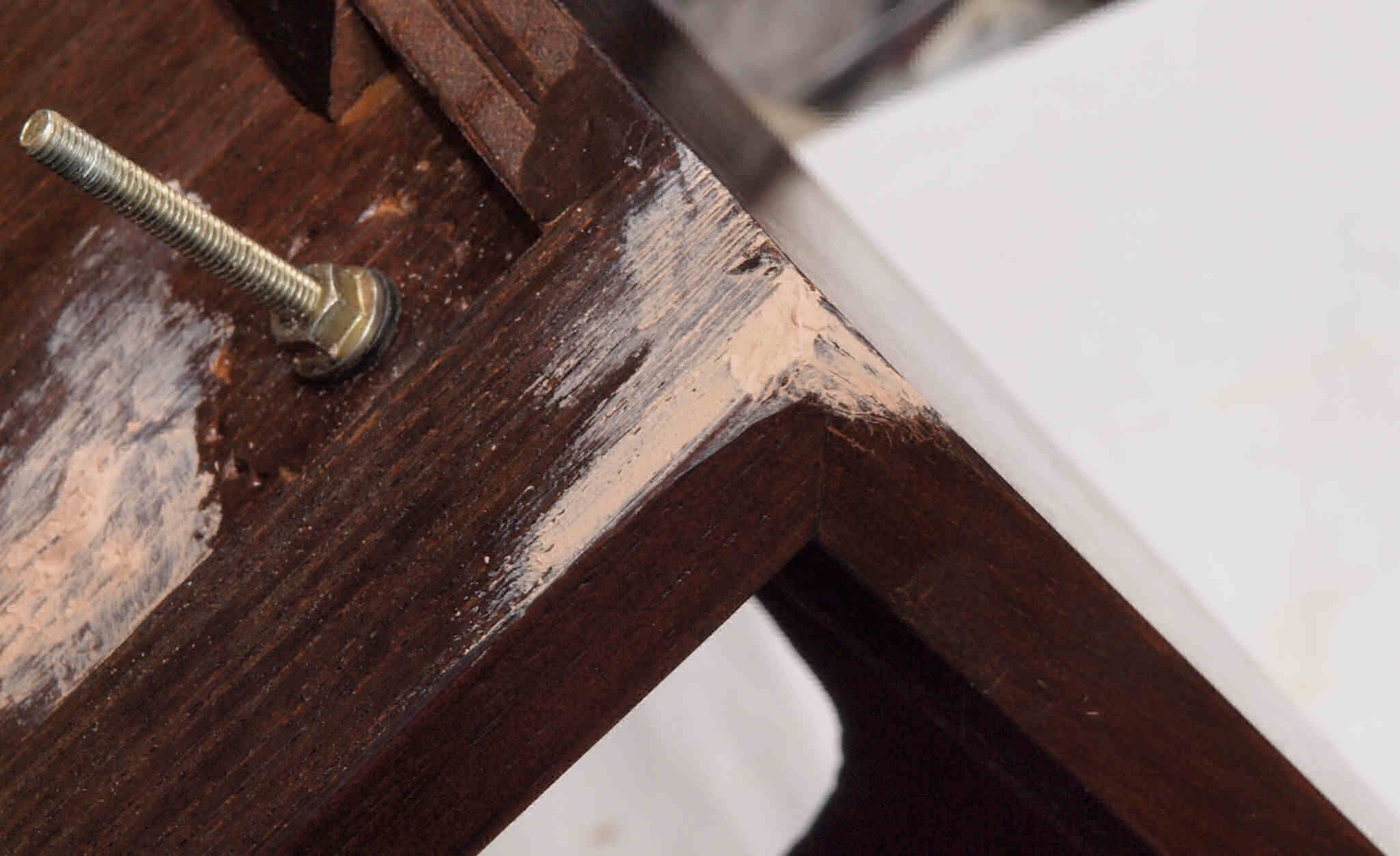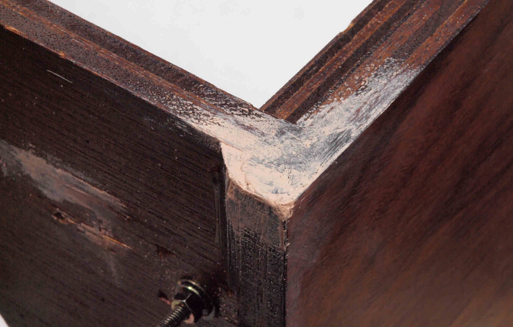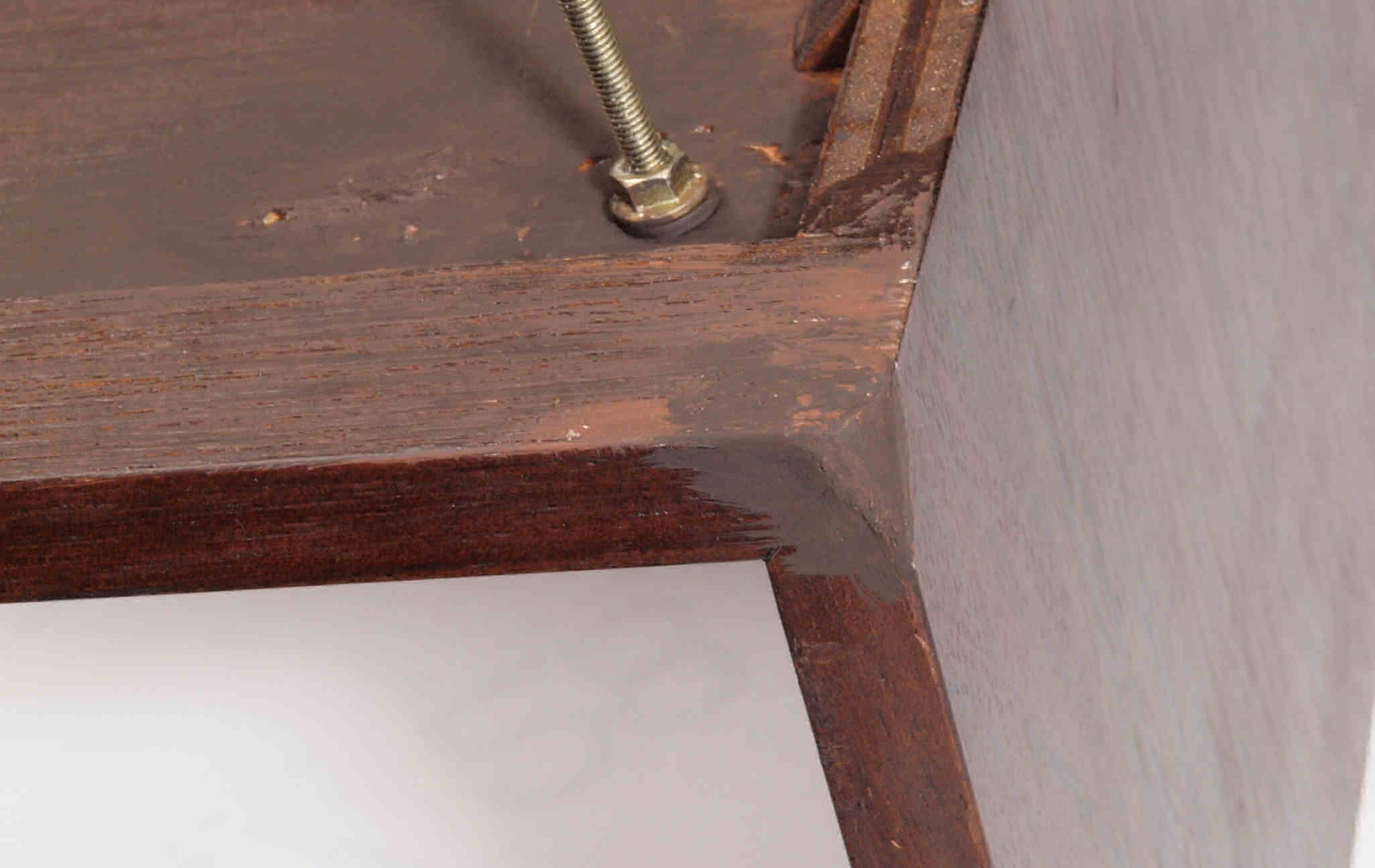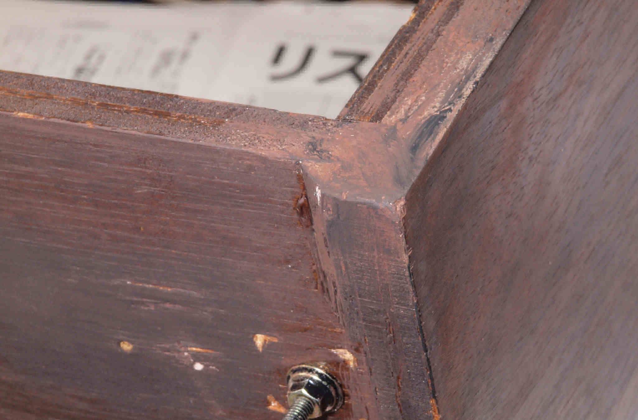 | K21. 修理前 足を取り、下から見る、ベニヤ(合板)の接着材が劣化し、木目方向に剥がれる。 |