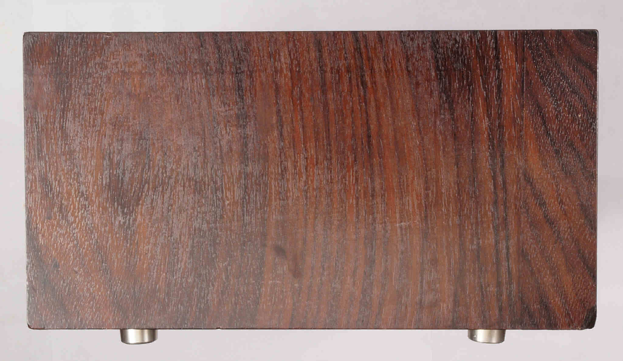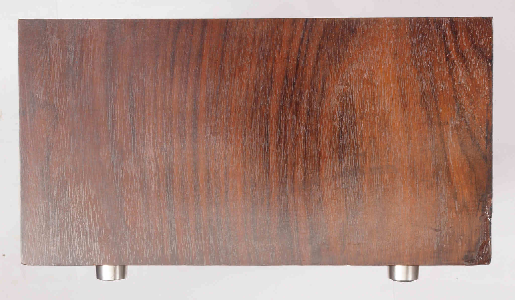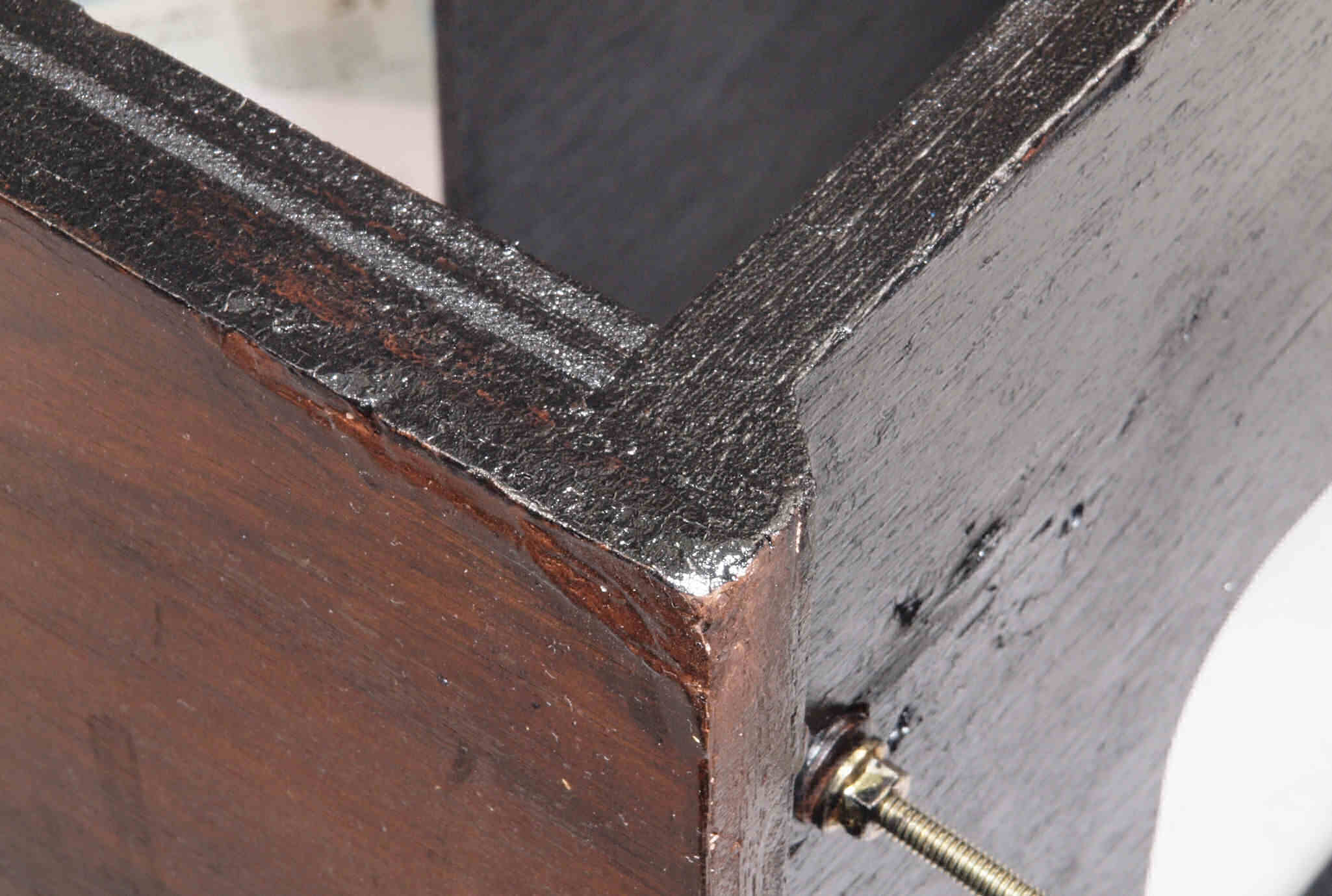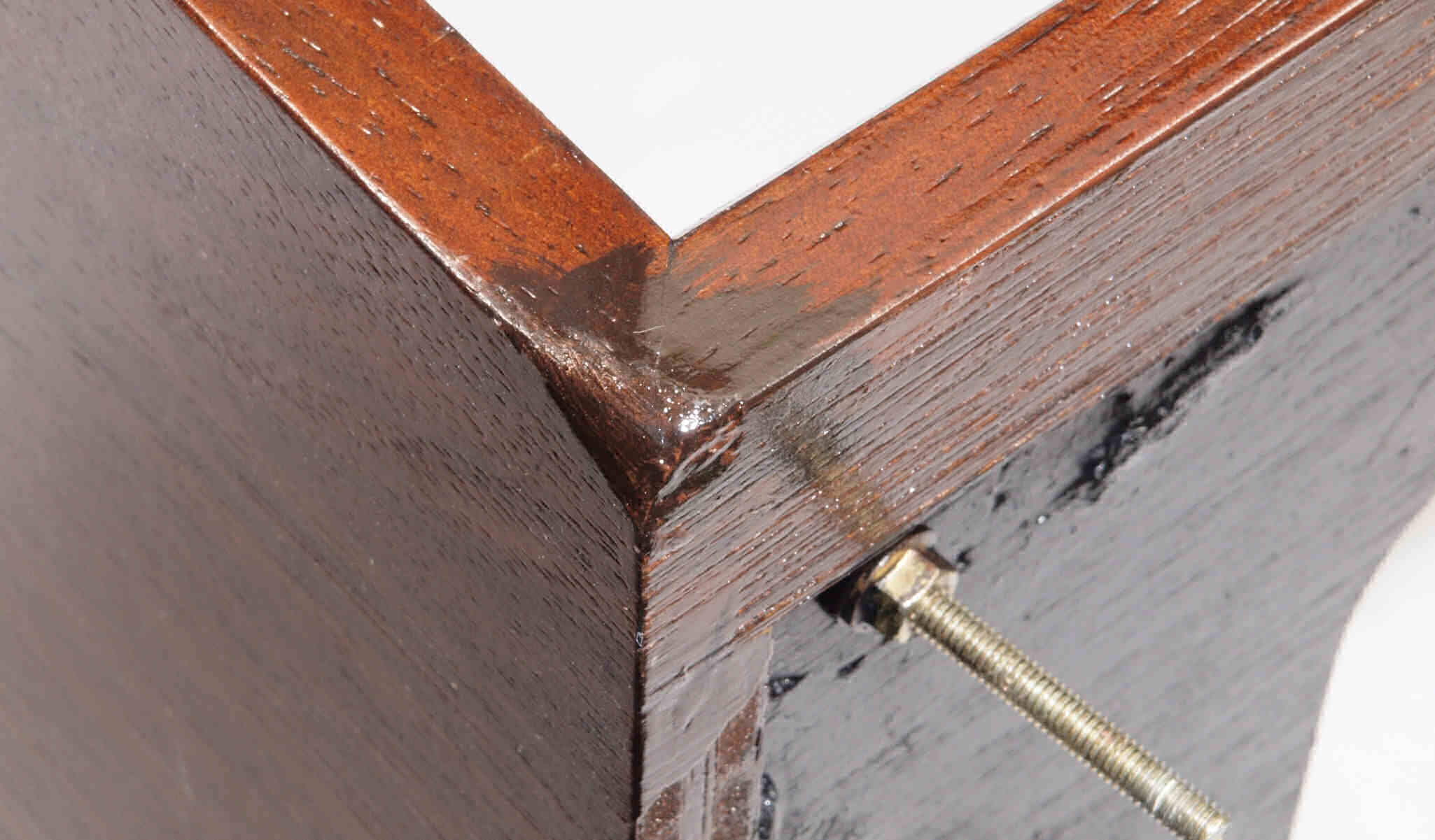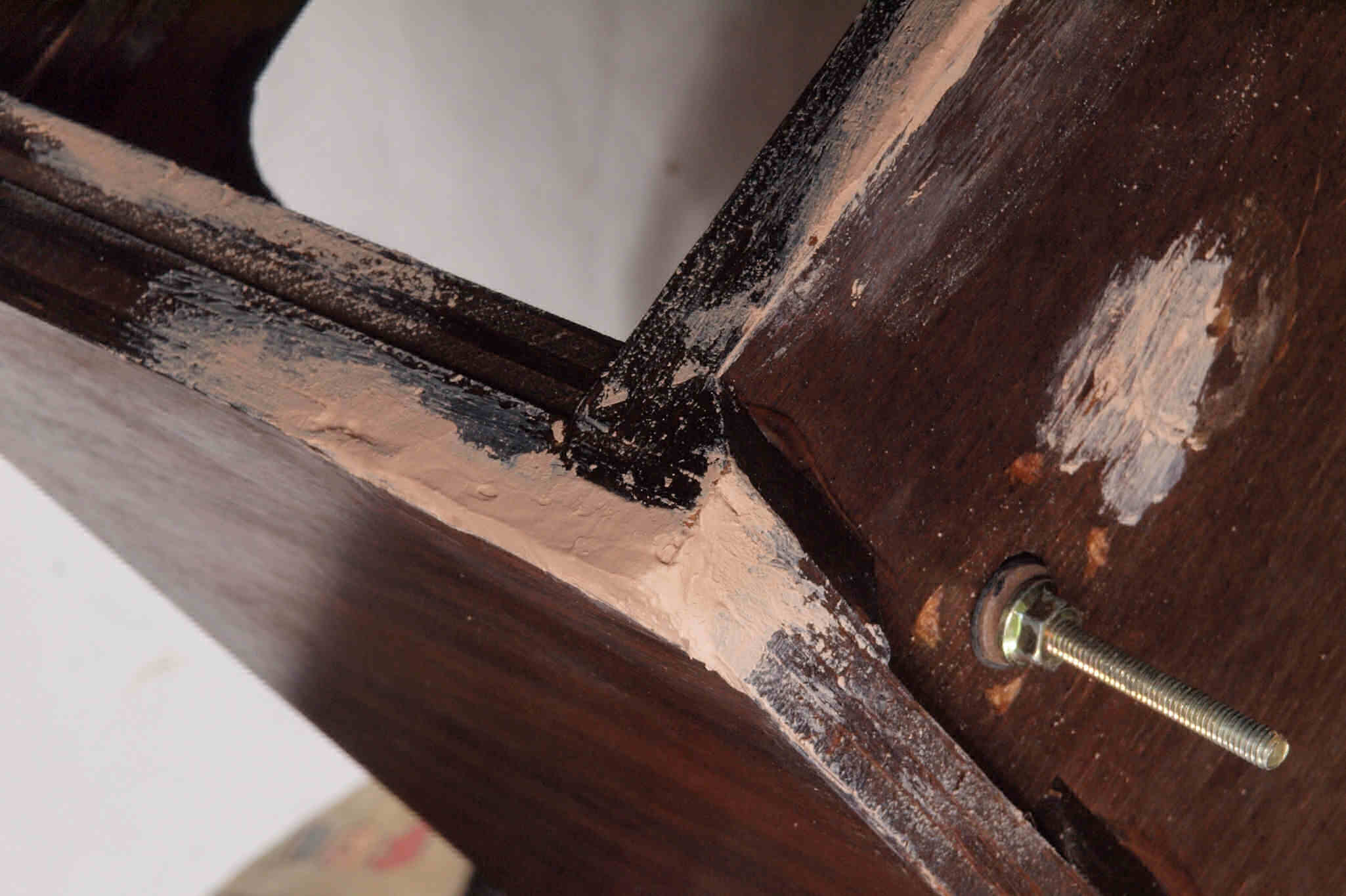 | K21. 修理前 足を取り、下から見る、ベニヤ(合板)の接着材が劣化し、木目方向に剥がれる。 |