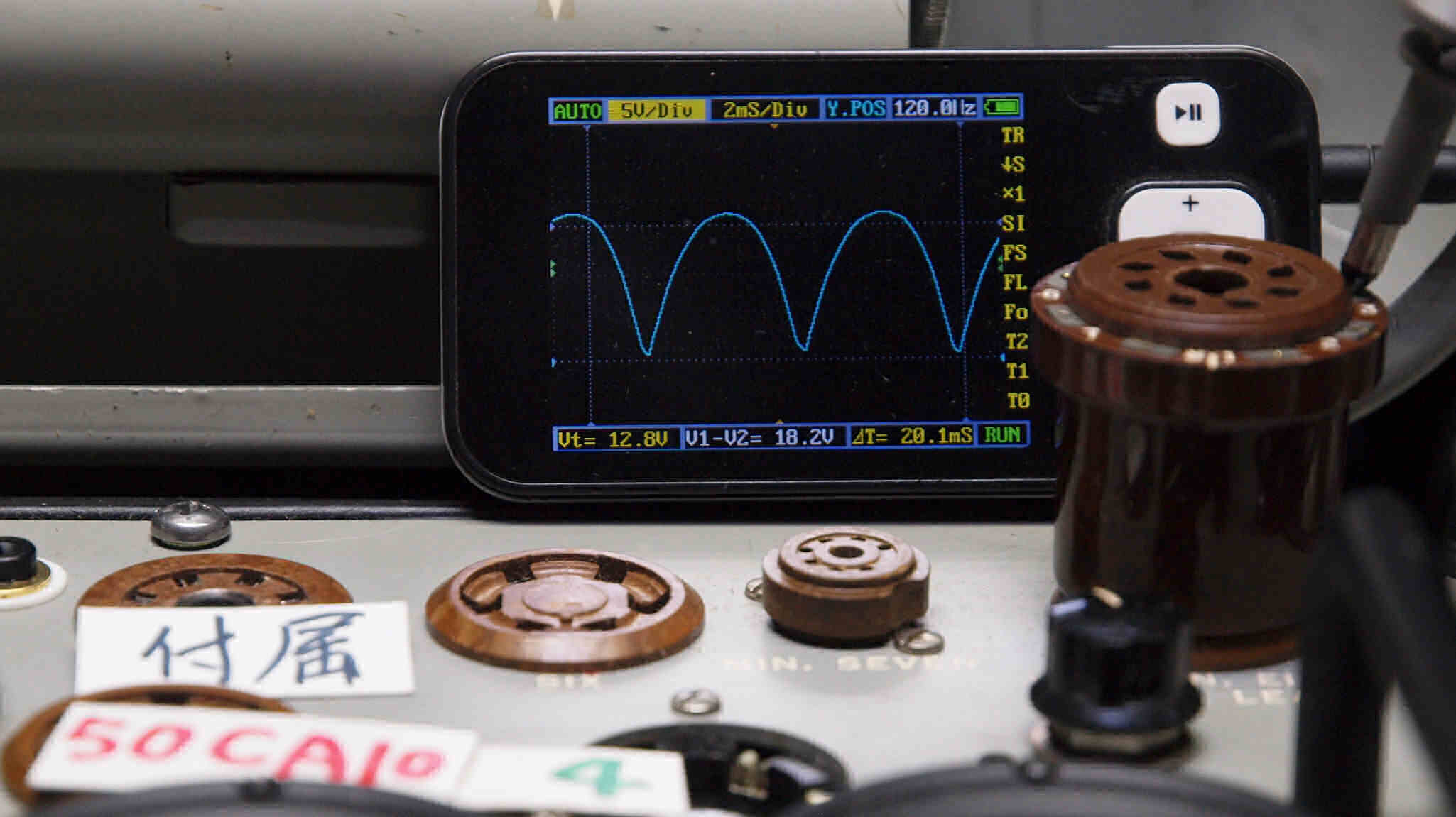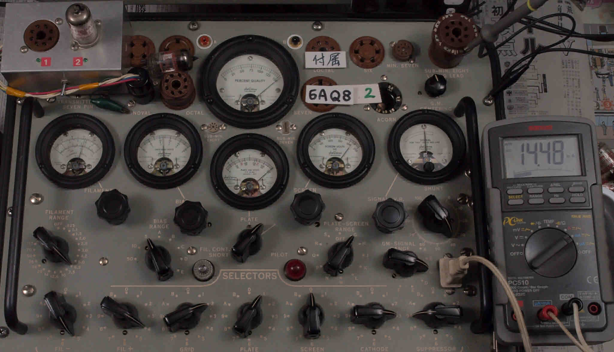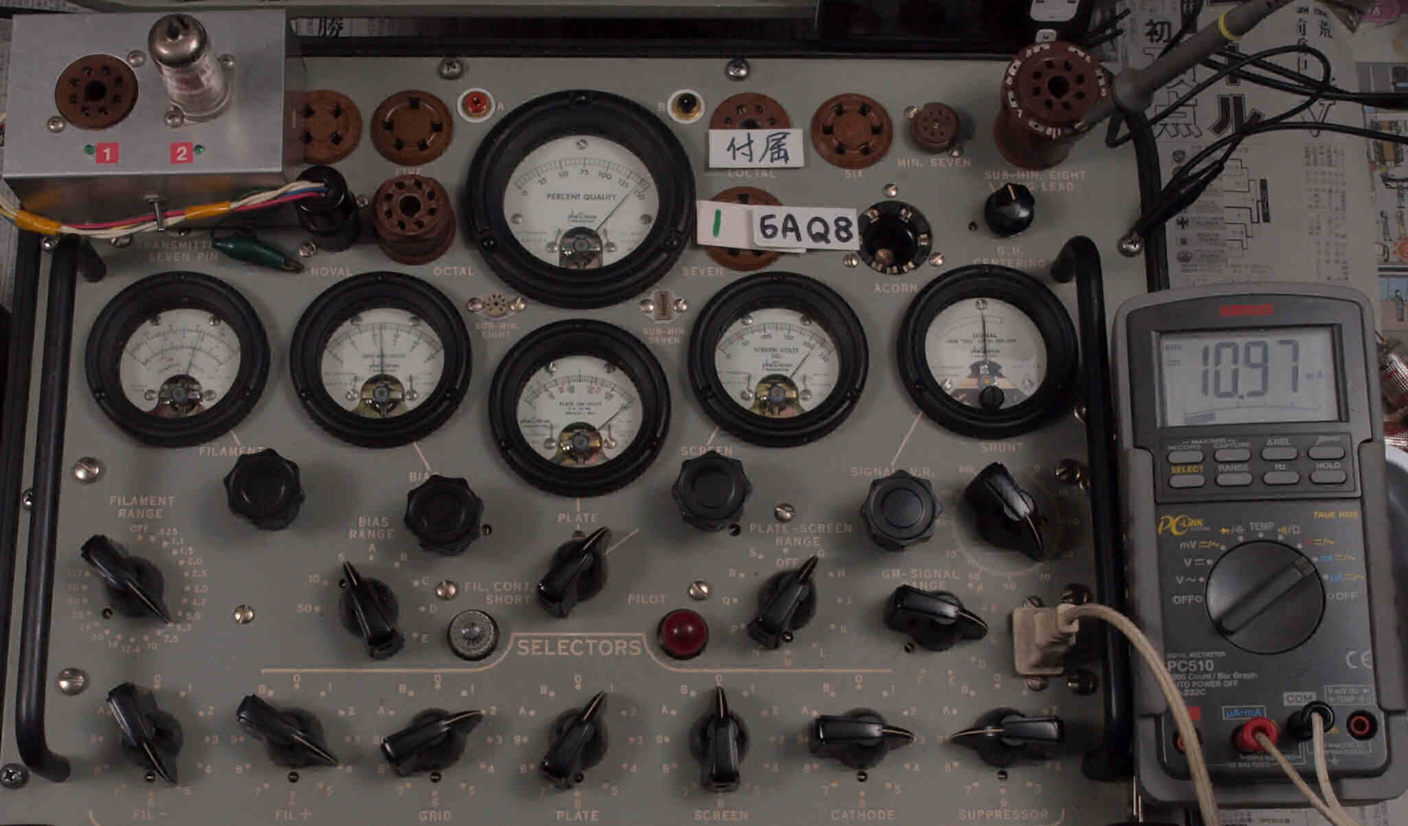 | U11. 付属1本目 50CA10。 Gm測定=16400μmho、IP=113.4mA。 測定条件、「Ep=250V、Eg1=−22V」。 RangeSW=A、FullScale=30000μmho。 |