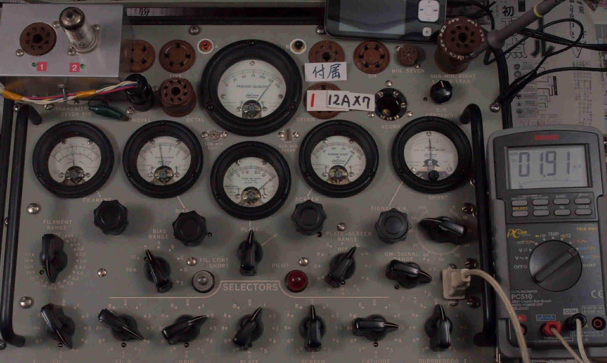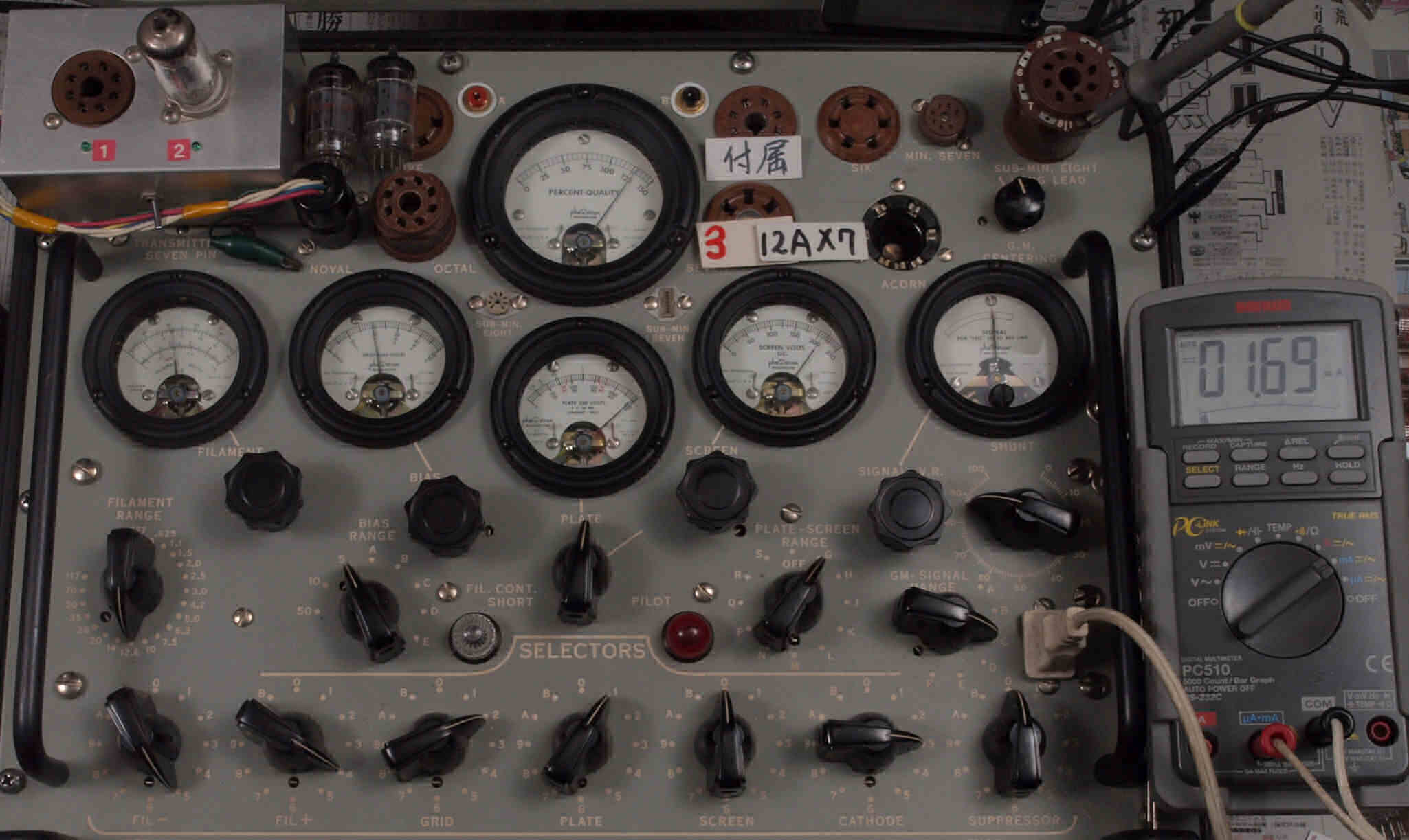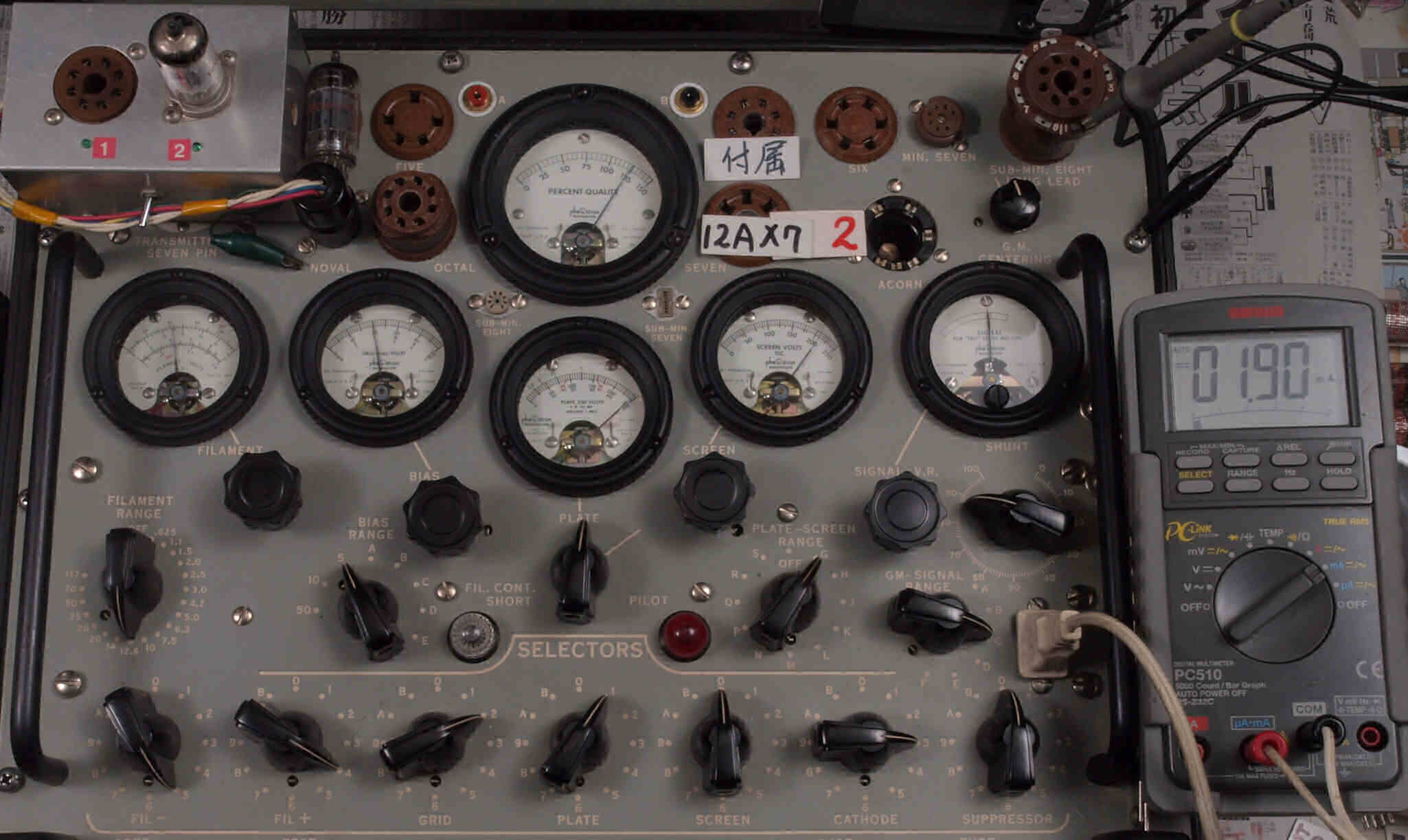| U421. 付属2本目12AX7ユニット1。 Gm測定=2500μmho、IP=1.90mA。 測定条件、「Ep=250V、Eg1=−2V」。 RangeSW=C、FullScale=3000μmho |
