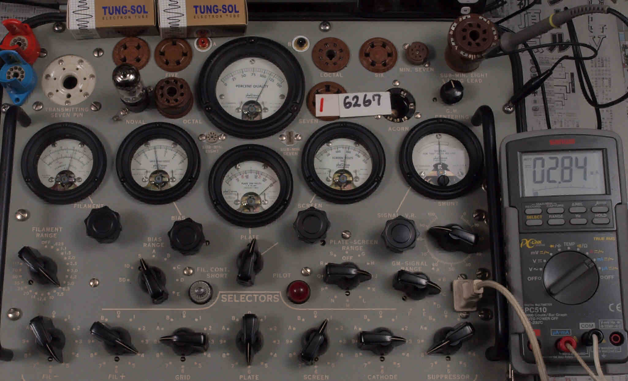 | U21. 付属1本目 6267。 Gm測定=2160μmho、IP=3.11mA。 測定条件、「Ep=250V、Esg=150V、Eg1=−2V」。 RangeSW=C、FullScale=3000μmho |