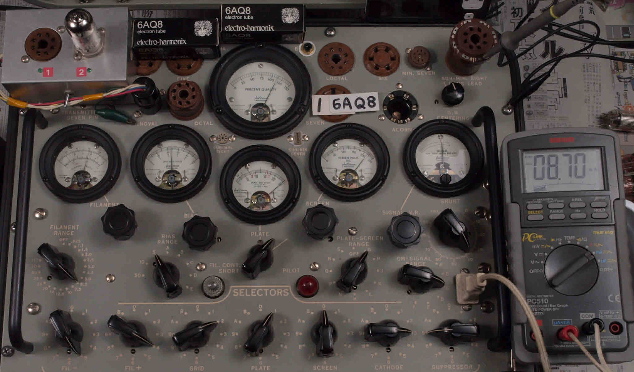 | V311. 購入1本目 6AQ8 ユニット1。 Gm測定=5700μmho、IP=8.70mA。 測定条件、「Ep=250V、Eg1=−2.3V」。 RangeSW=C、FullScale=7500μmho |