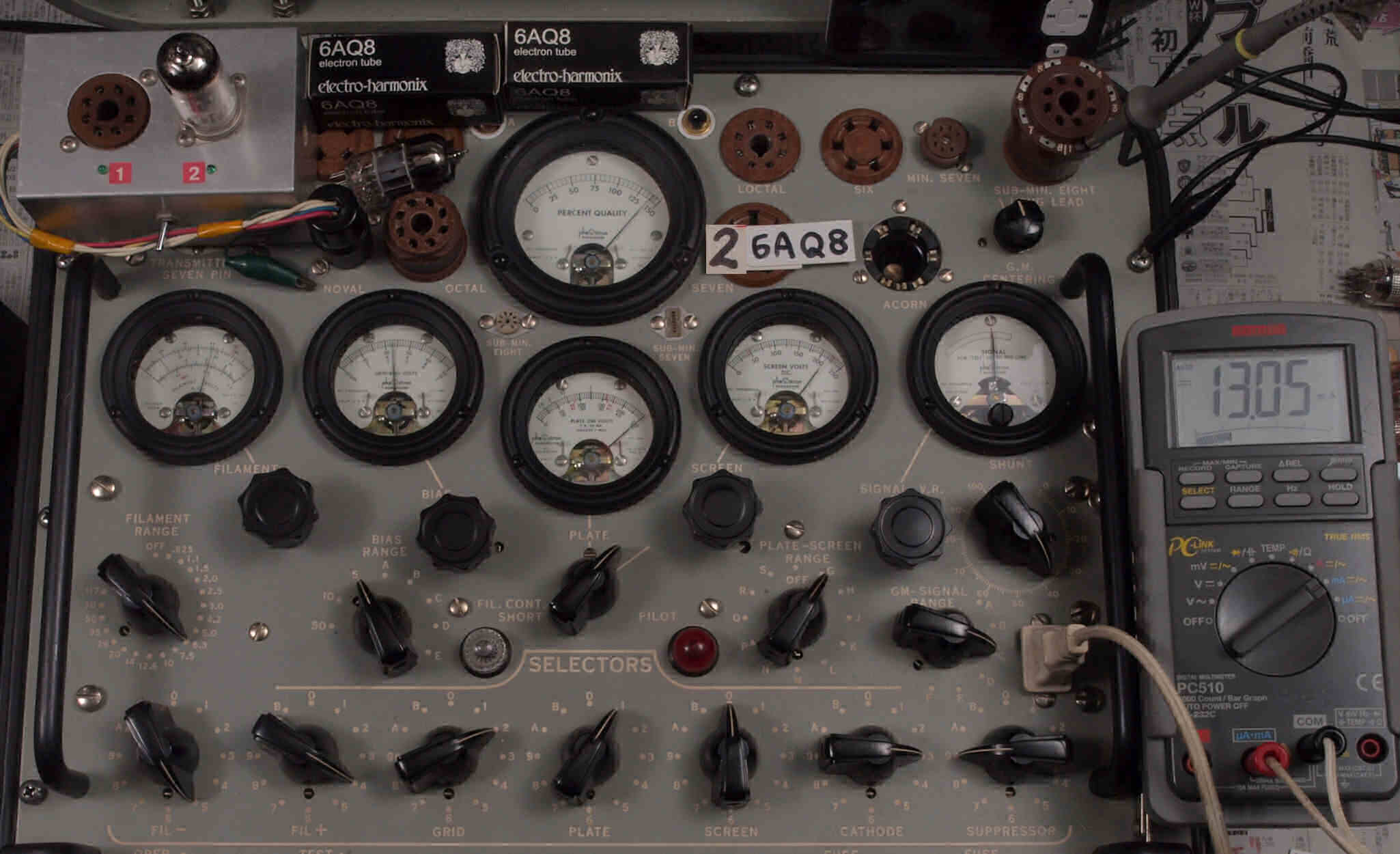 | V321. 購入2本目 6AQ8 ユニット1。 Gm測定=7000μmho、IP=13.05mA。 測定条件、「Ep=250V、Eg1=−2.3V」。 RangeSW=C、FullScale=7500μmho |