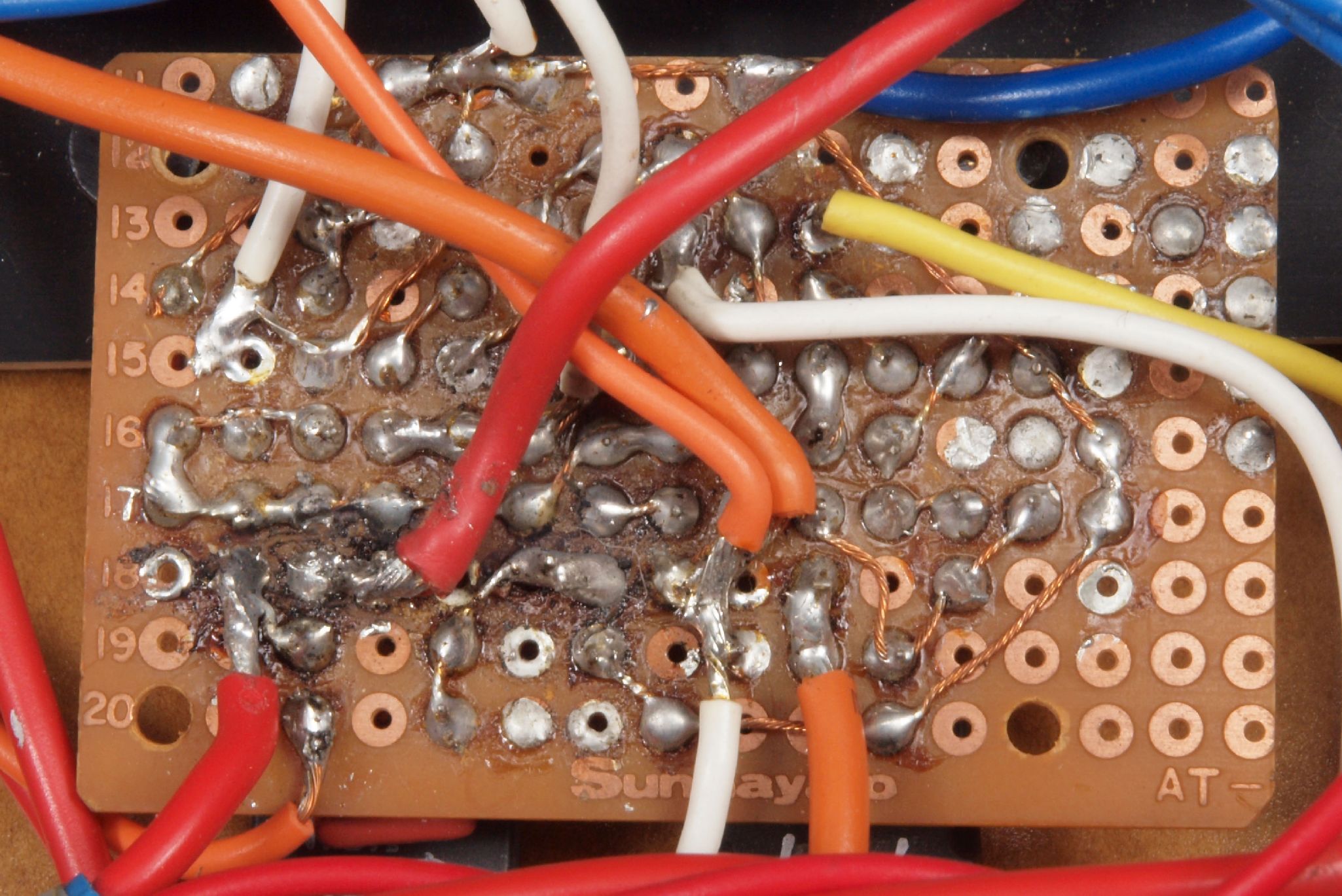 A31. 点検中 上下ケースから取出し、上から見る。 配線色はめちゃめちゃ、半田付けは小学生レベル!
