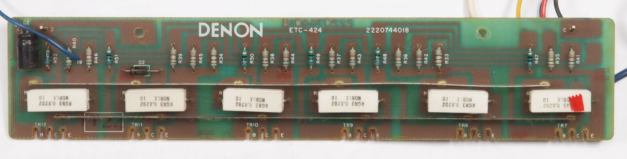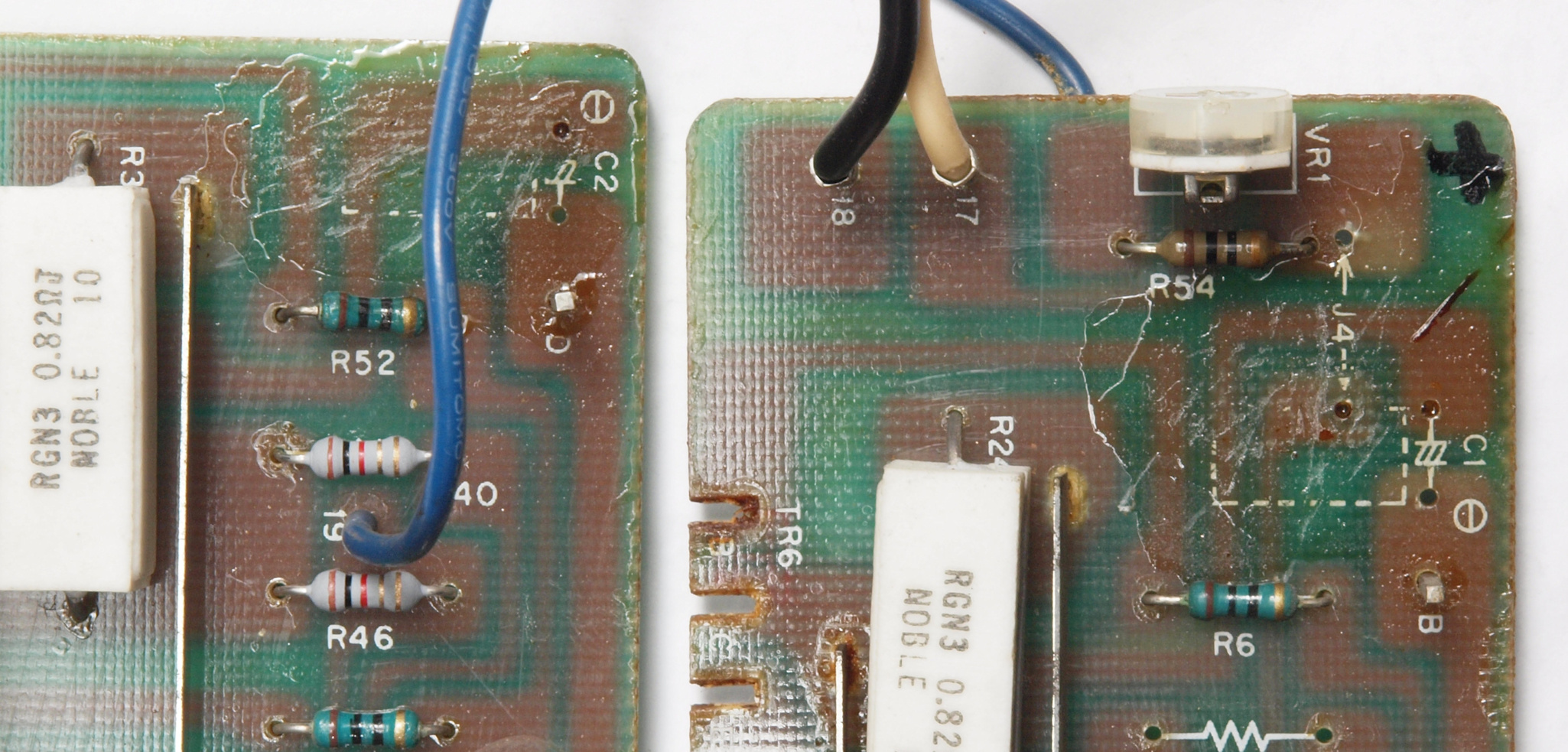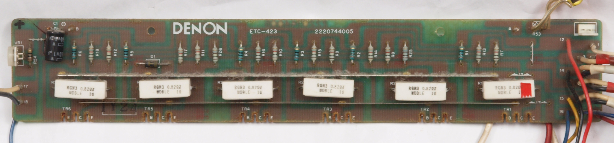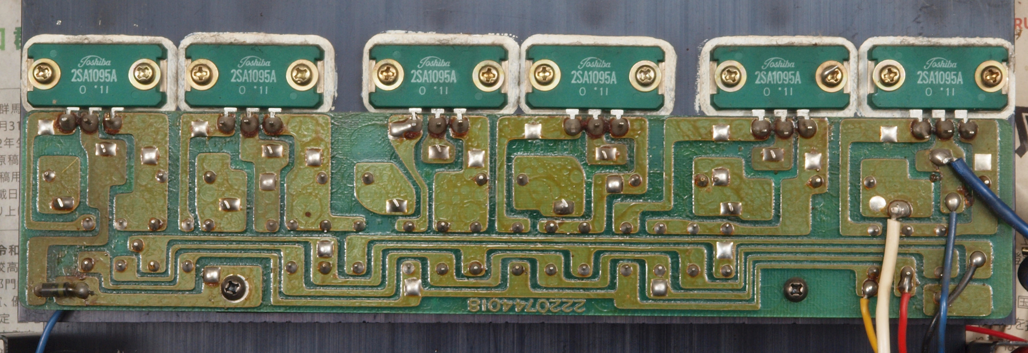 | C1G. 修理中 +−側終段AMP基板。 ジャンパー線、電解コンデンサーの足が腐食している。 | ||||||||||||||||||||||||||||||||||||||||||||||||||||||||